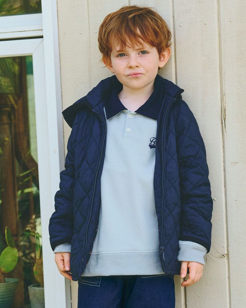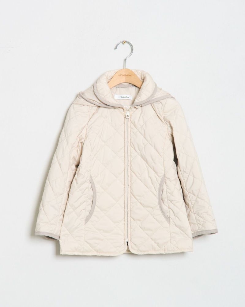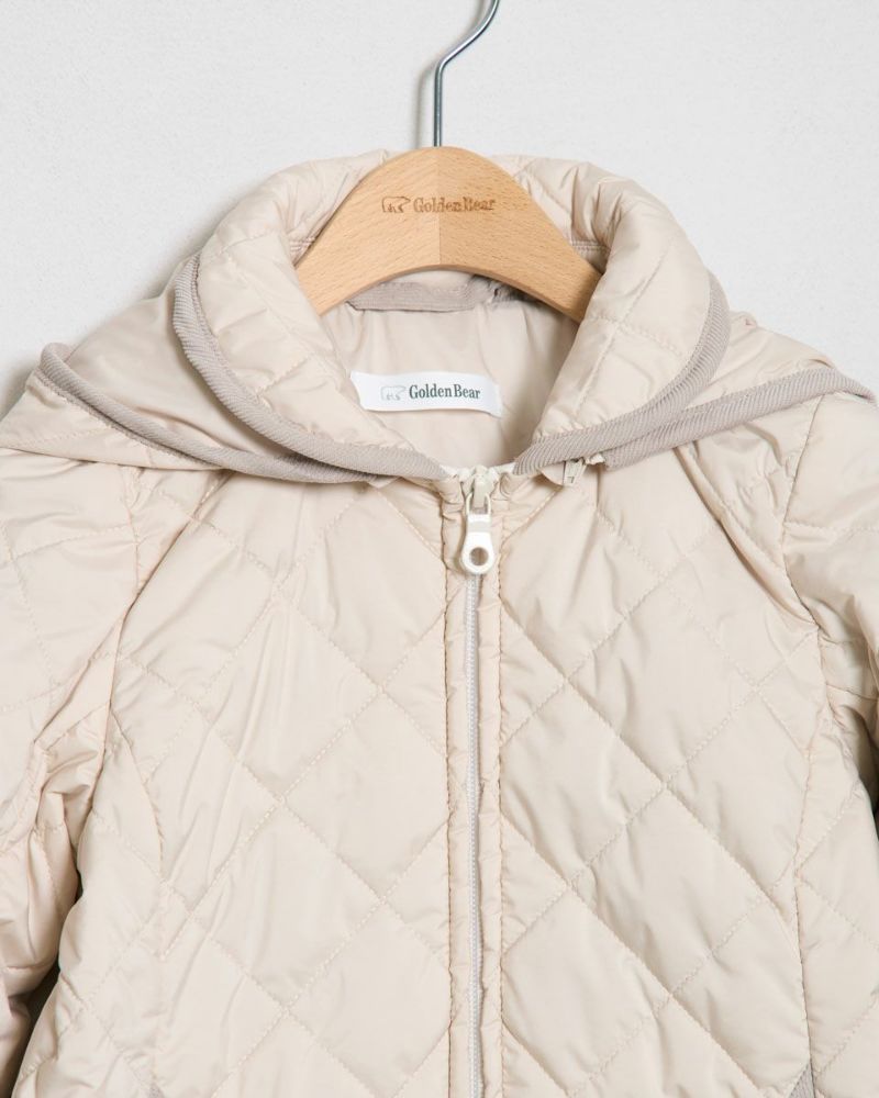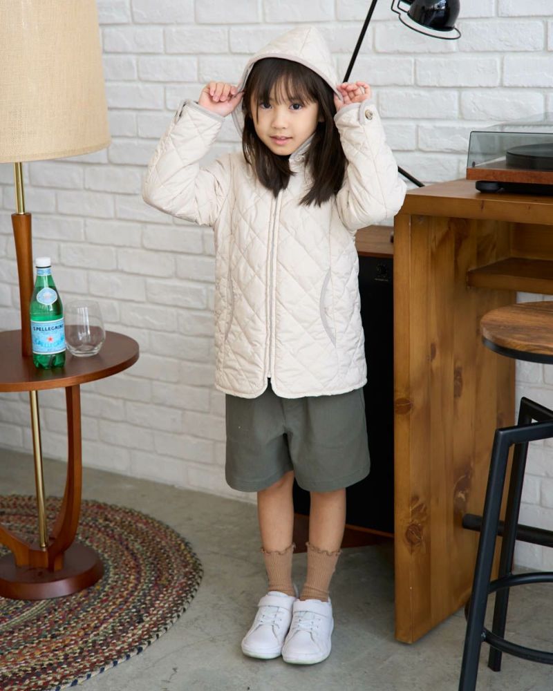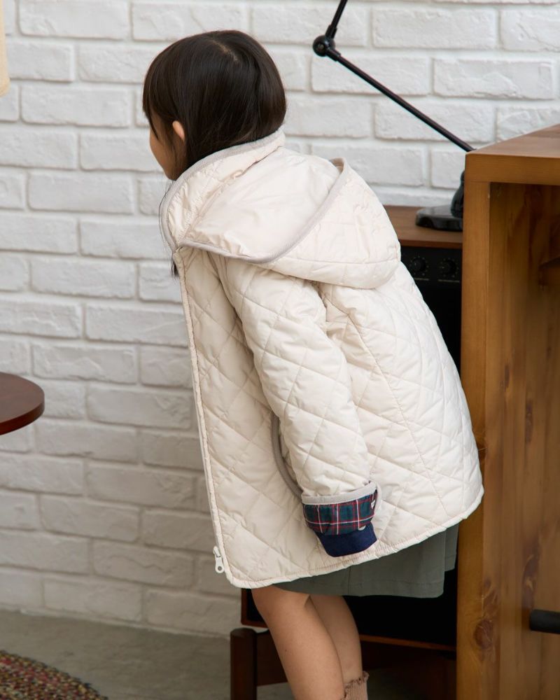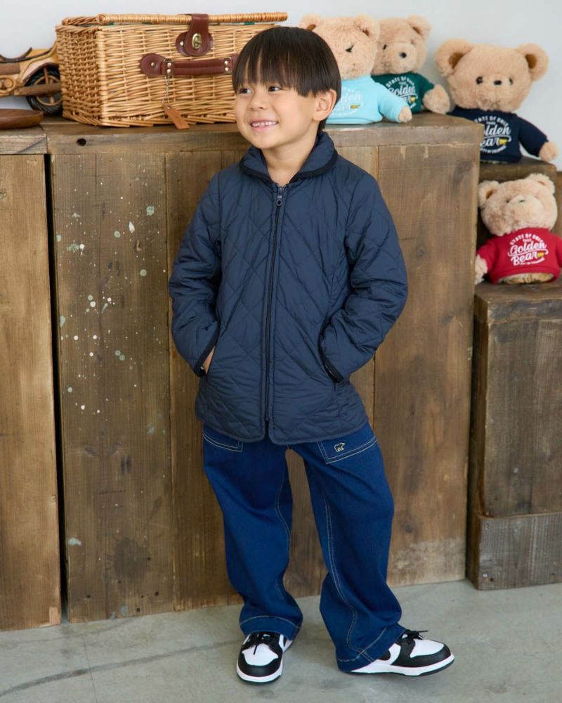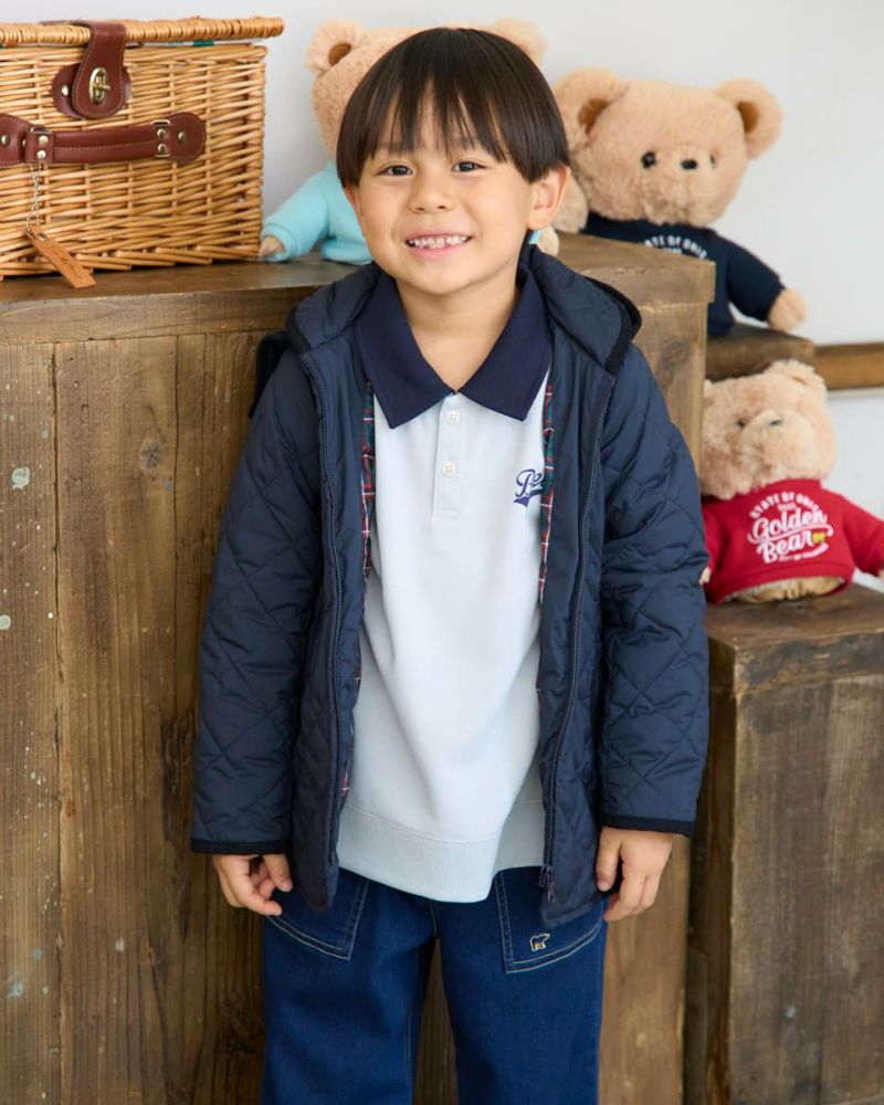 毎年ご好評いただいているキルトジャケットです。中綿にはソフトな風合いと膨らみを持たせる植物由来の素材を一部配合することで耐久性と保温性を高めました。コーデュロイの配色パイピングがポイントです。フードはファスナーで取り外しが出来ます。前中心はファスナー開きで男女兼用で着用頂けます。裏地はゴールデンベアオリジナルのチェック柄プリントを使用しています。ご家庭の洗濯機で洗えて、いつでも清潔に着用いただけます。