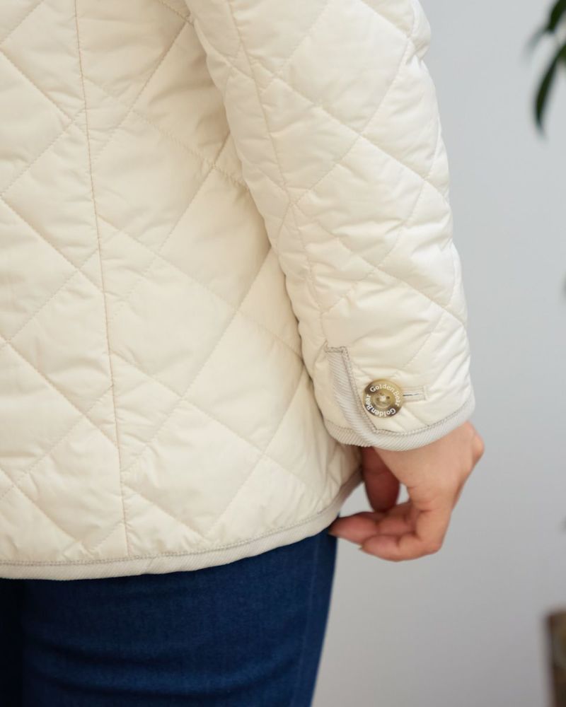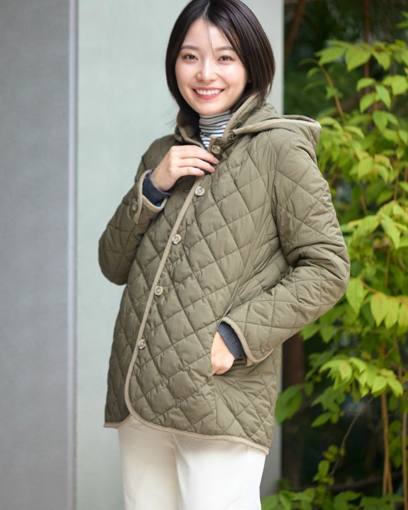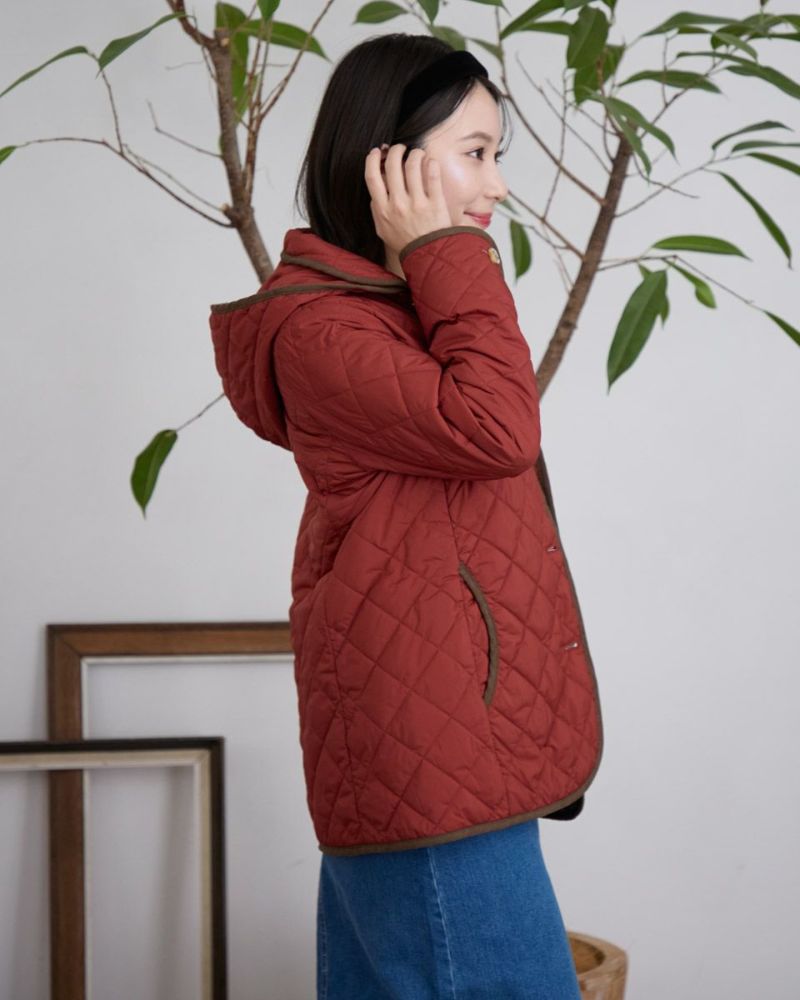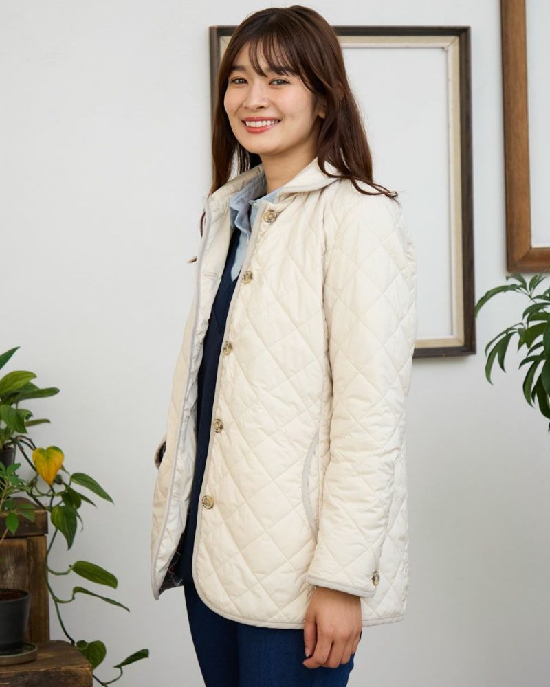 毎年ご好評いただいているキルトジャケットです。中綿にはソフトな風合いと膨らみを持たせる植物由来の素材を一部配合することで耐久性と保温性を高めました。コーデュロイの配色パイピングがポイントです。フードはファスナーで取り外しが出来ます。前中心はブランドロゴ入りの釦を、裏地はゴールデンベアオリジナルのチェック柄プリントを使用しています。昨年より約100g軽量化しました。ご家庭の洗濯機で洗えて、いつでも清潔に着用いただけます。