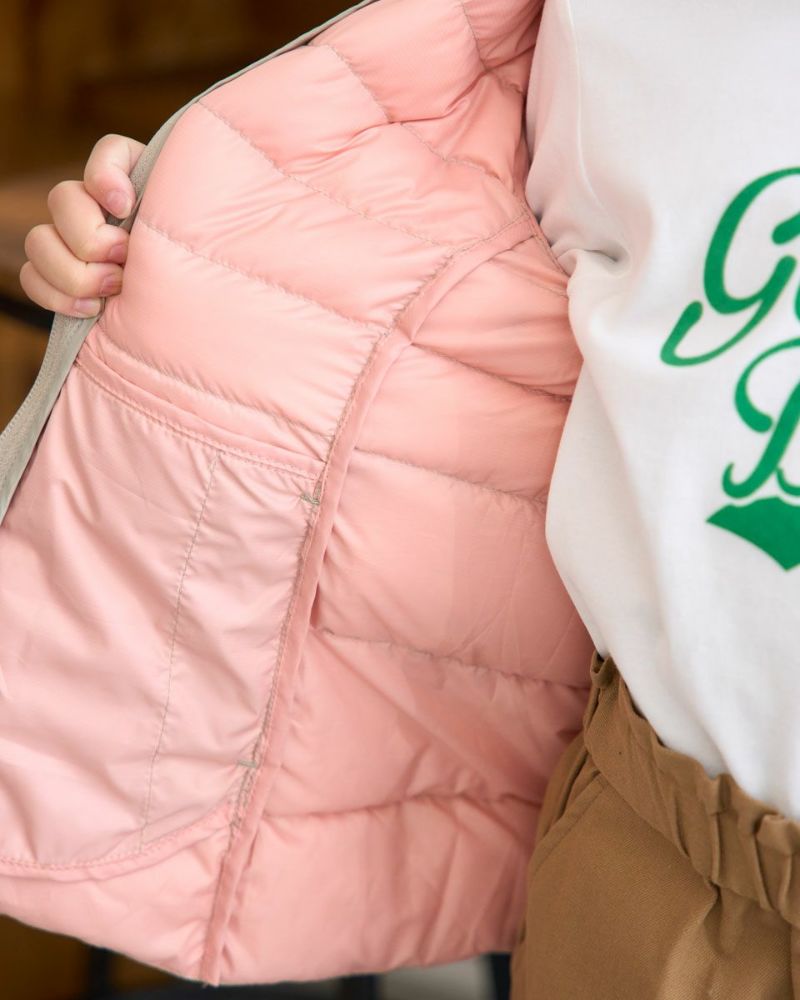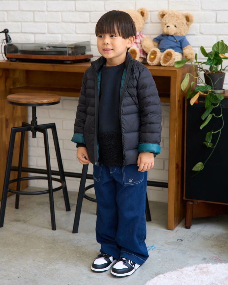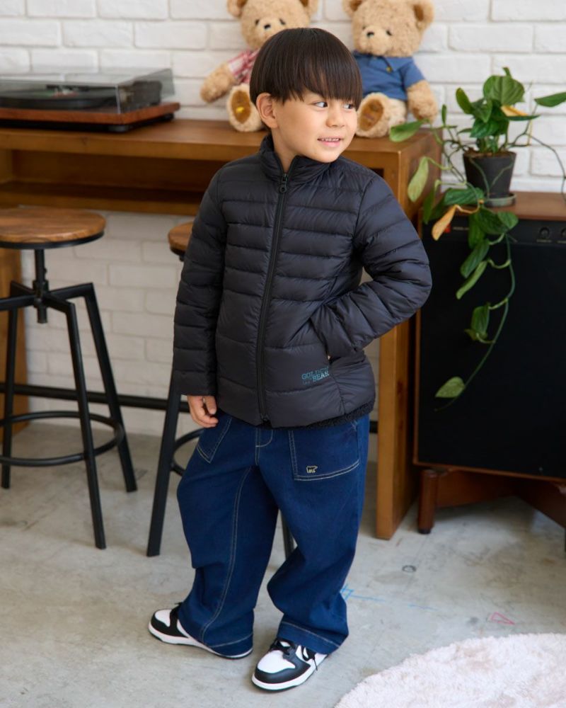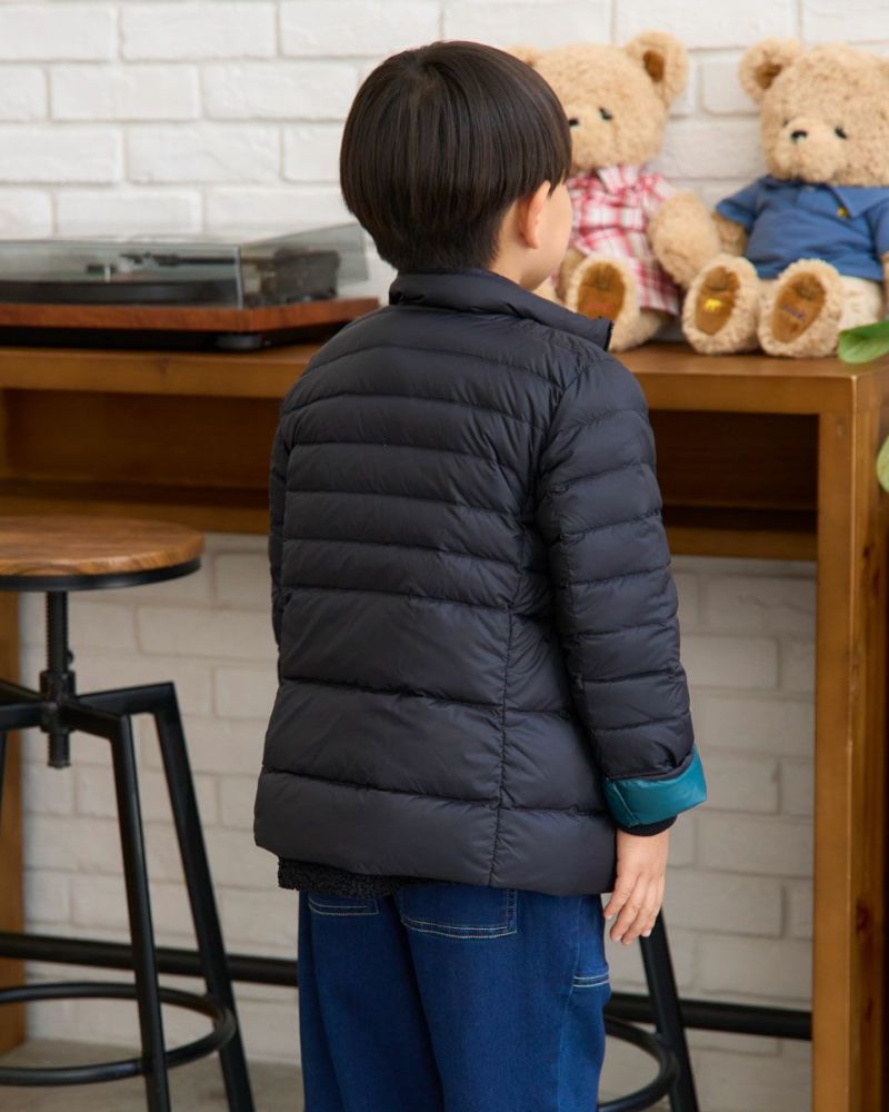 軽くて暖かいダウンジャケットは、一枚あると重宝するアイテムです。表地は撥水性に優れた高密度のナイロンタフタを使用し、裏地には静電気防止の効果がある生地を使い、不快な静電気を軽減します。ダウンには回収してきれいに洗浄した羽毛の有効活用を目指すグリーンダウンを使用しています。前中心ファスナーとドット釦開きで、スタンドカラー部分は身頃の2倍のダウンを入れボリュームをもたせています。身頃のボーダー状のステッチは、肩から裾に向けて巾を変えています。左前身頃の裾にブランドロゴの同色系転写プリント入れ、全体にスポーティな雰囲気に仕上げました。