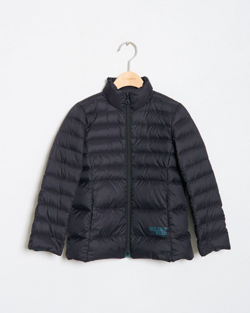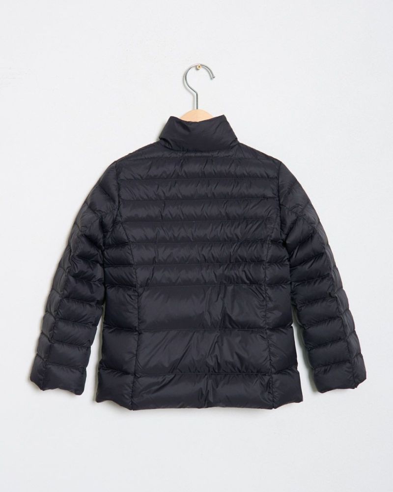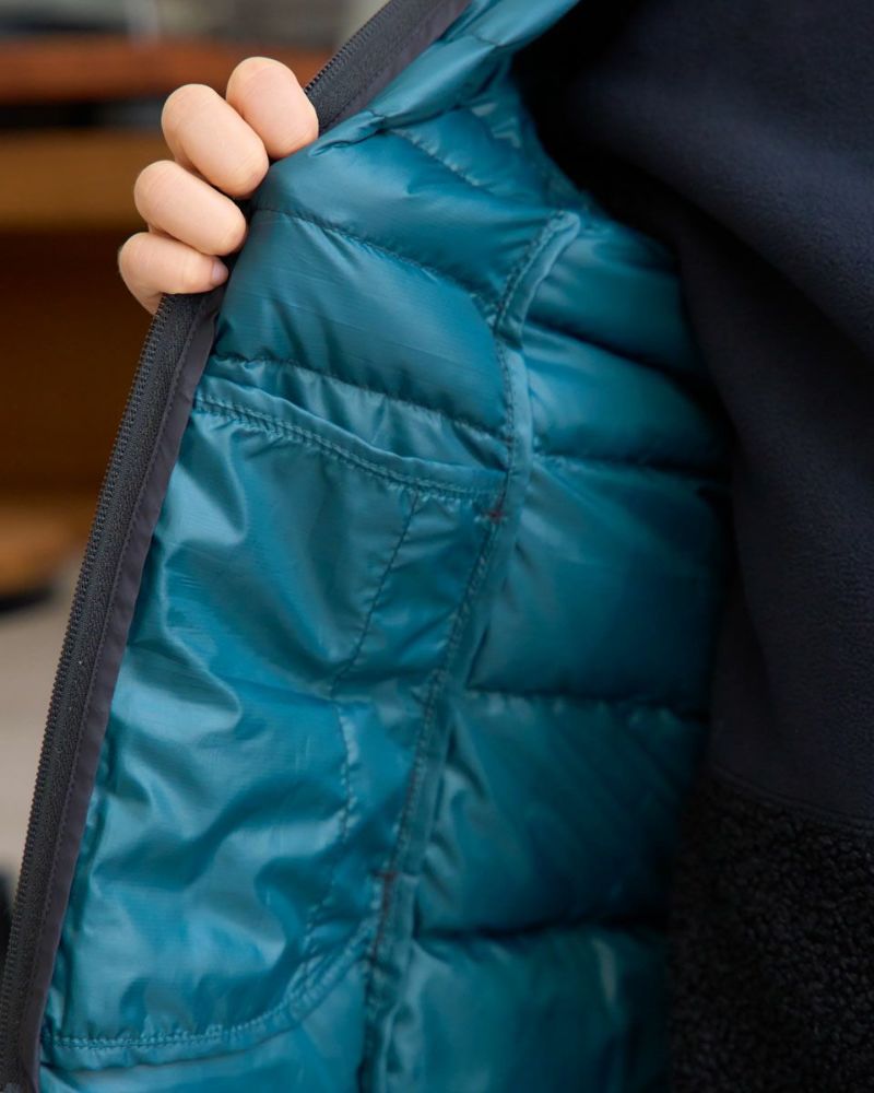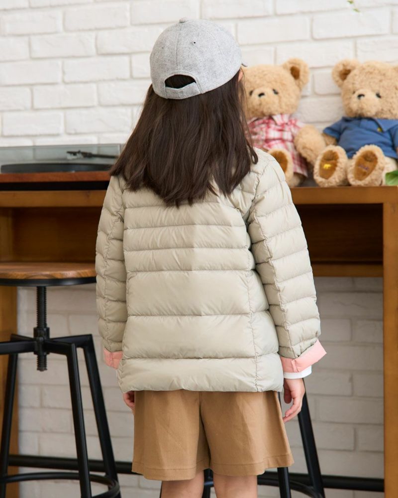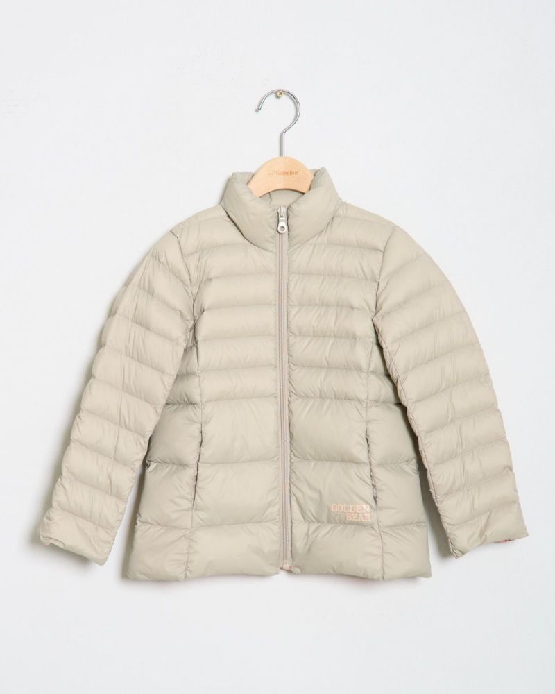 軽くて暖かいダウンジャケットは、一枚あると重宝するアイテムです。表地は撥水性に優れた高密度のナイロンタフタを使用し、裏地には静電気防止の効果がある生地を使い、不快な静電気を軽減します。ダウンには回収してきれいに洗浄した羽毛の有効活用を目指すグリーンダウンを使用しています。前中心ファスナーとドット釦開きで、スタンドカラー部分は身頃の2倍のダウンを入れボリュームをもたせています。身頃のボーダー状のステッチは、肩から裾に向けて巾を変えています。左前身頃の裾にブランドロゴの同色系転写プリント入れ、全体にスポーティな雰囲気に仕上げました。