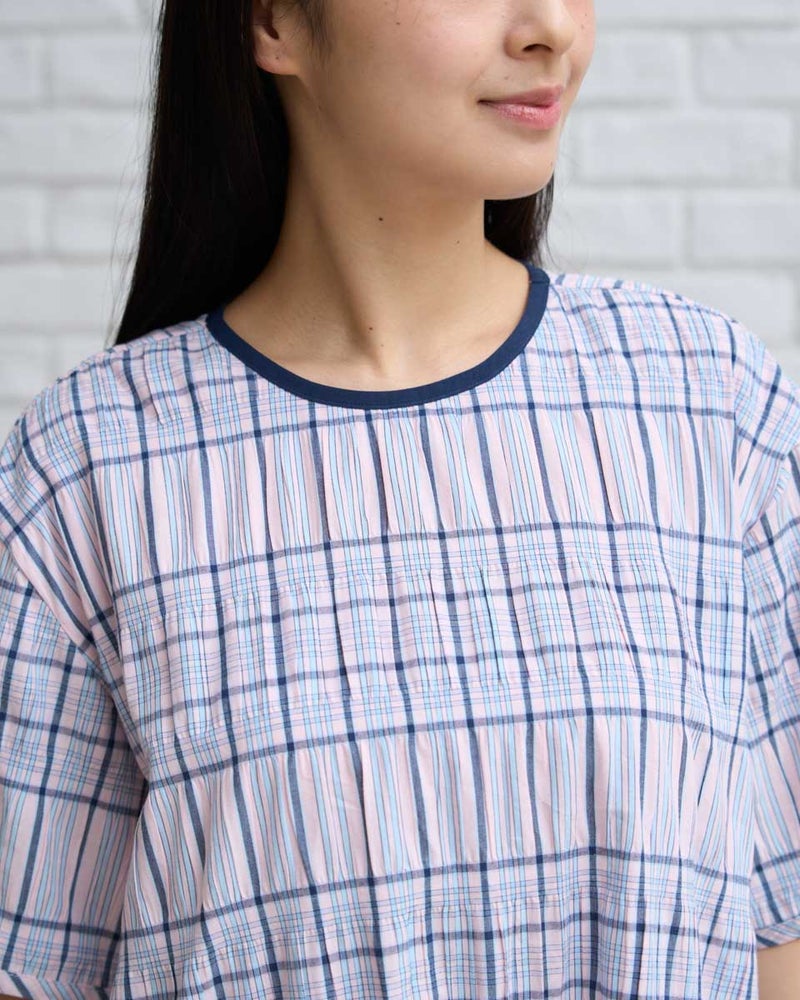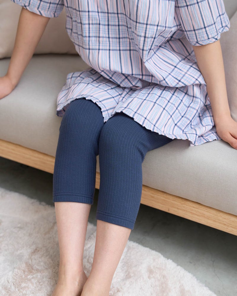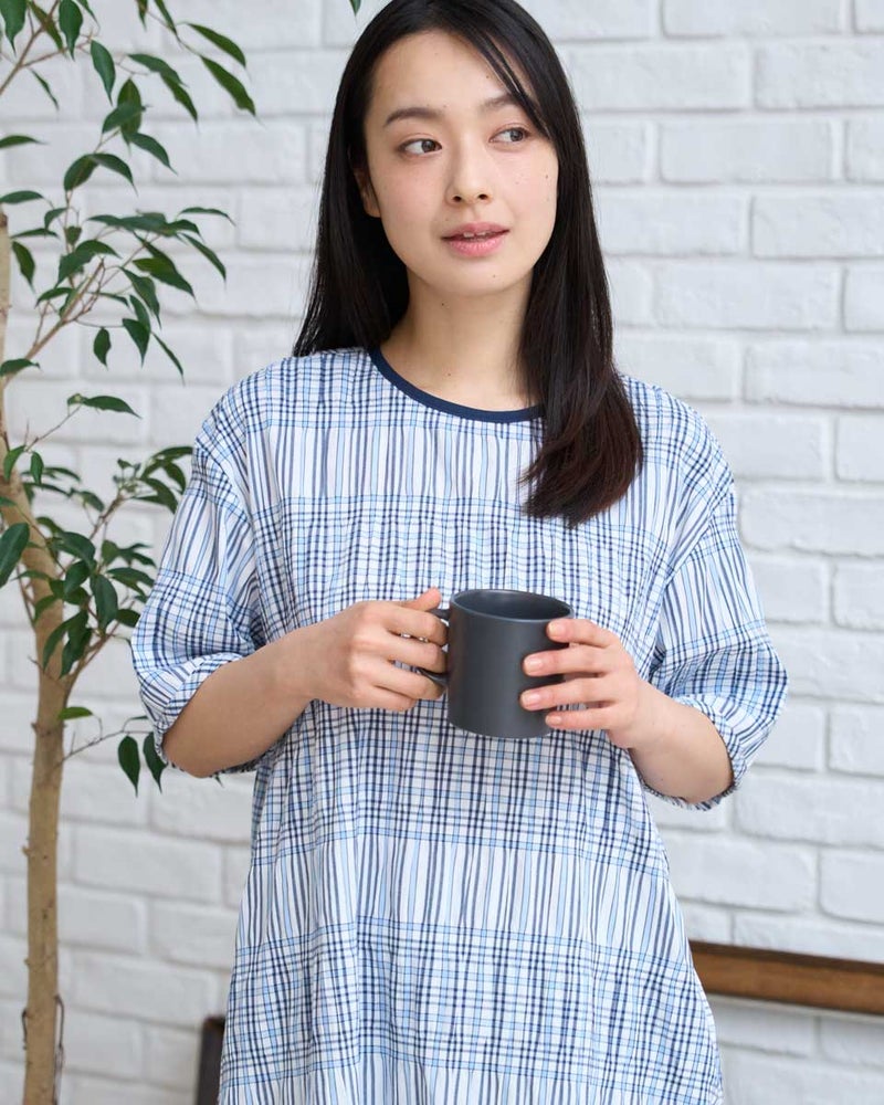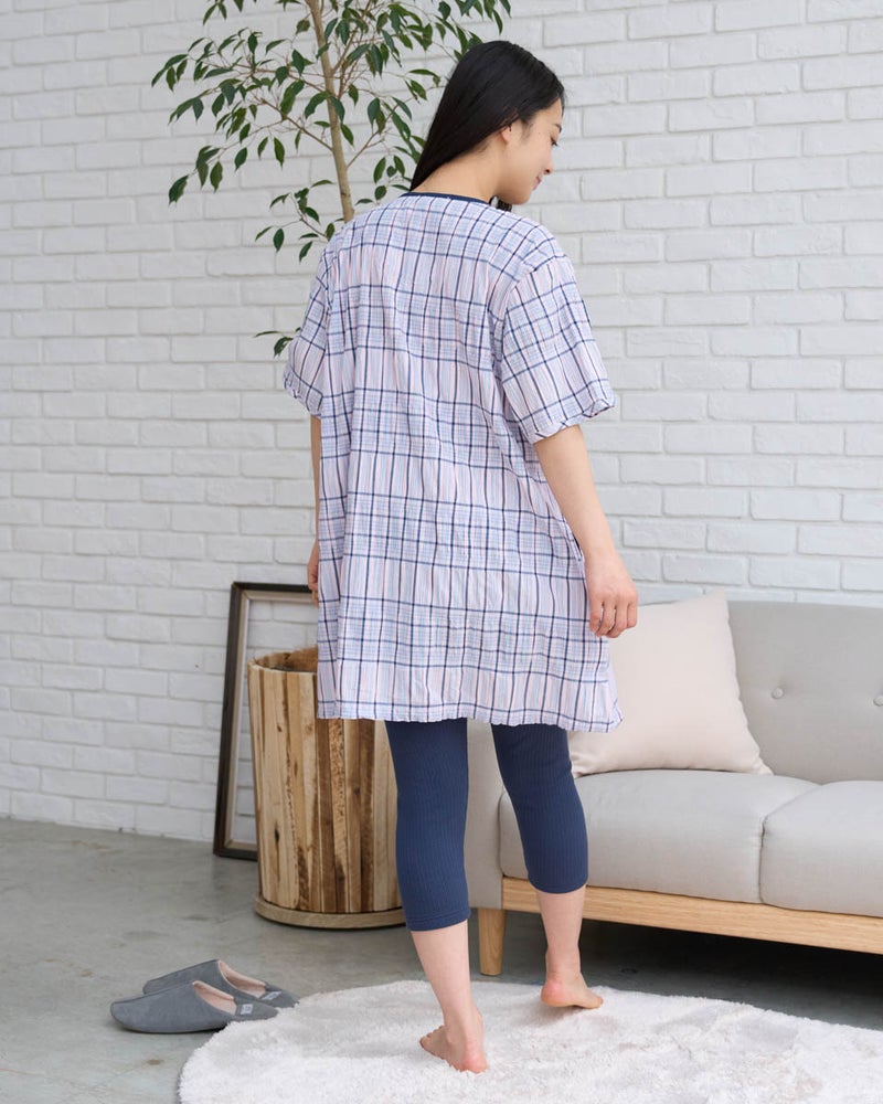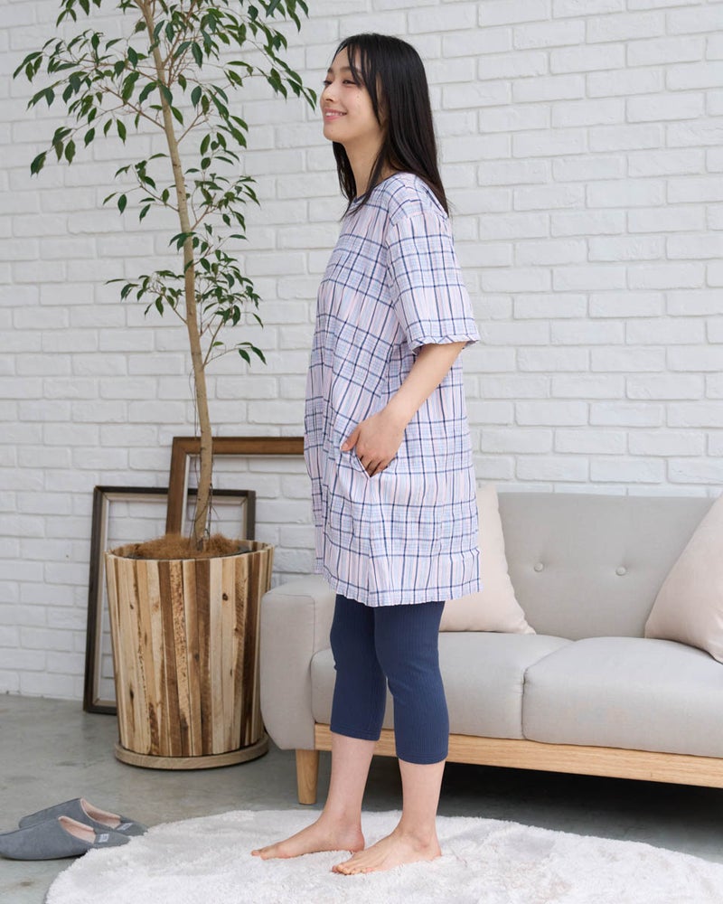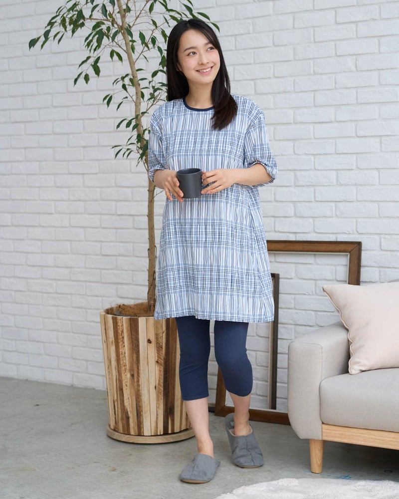 涼しげなシャーリング素材がやさしく肌に寄り添うチュニックに、動きやすく快適なハーフレギンスをコーディネート。軽やかな着心地で風通しもよく、暑い季節でもさらっと快適に過ごせます。ラウンジウェアとしてはもちろん、そのままちょっとしたお出かけにも対応できる、心地よさとおしゃれを兼ね備えた一着です。