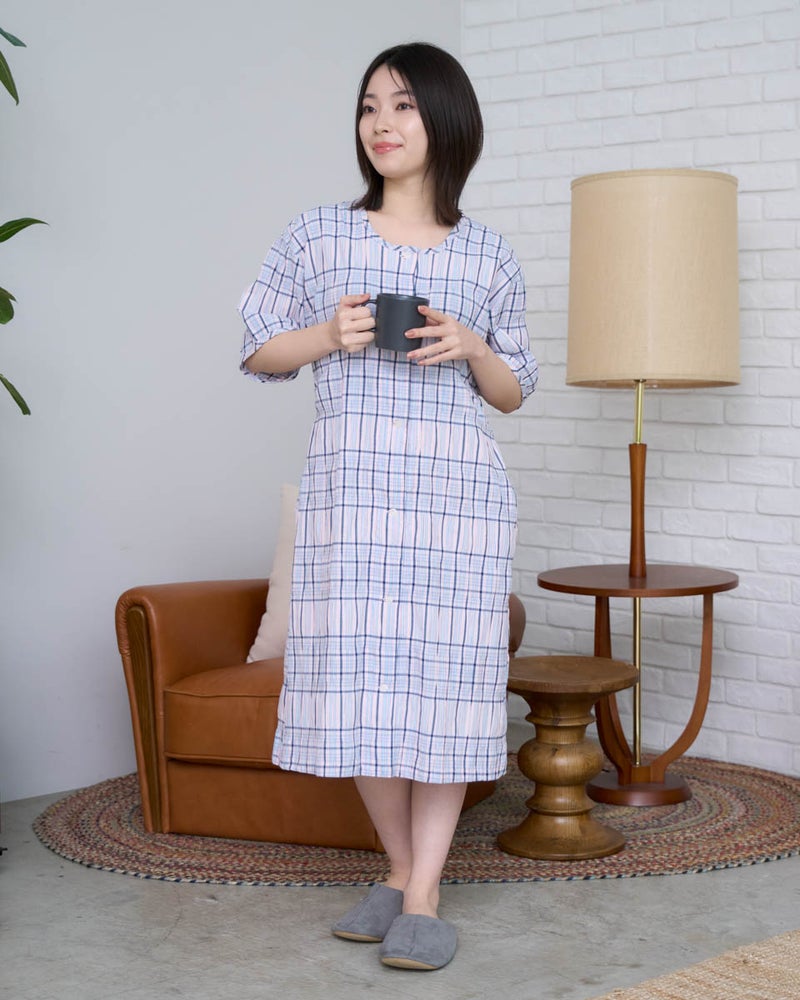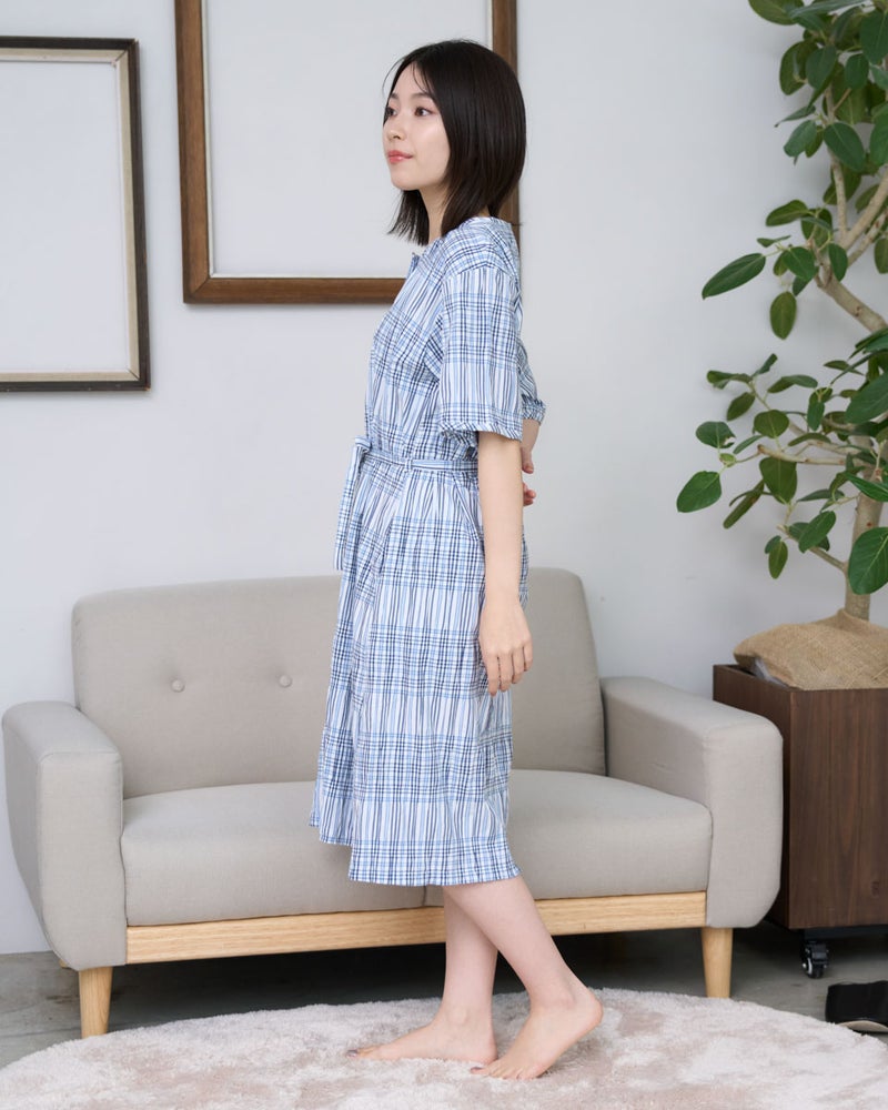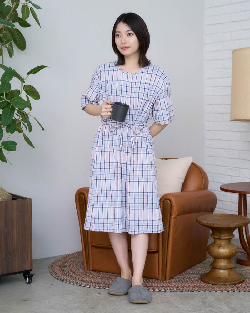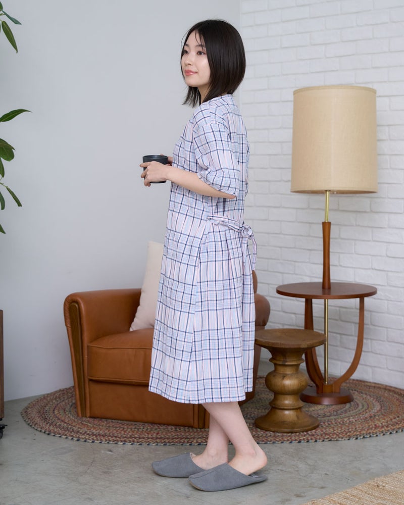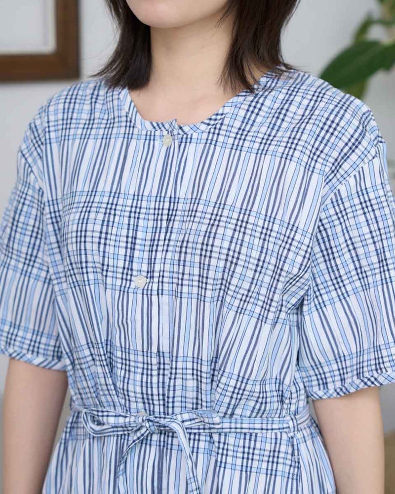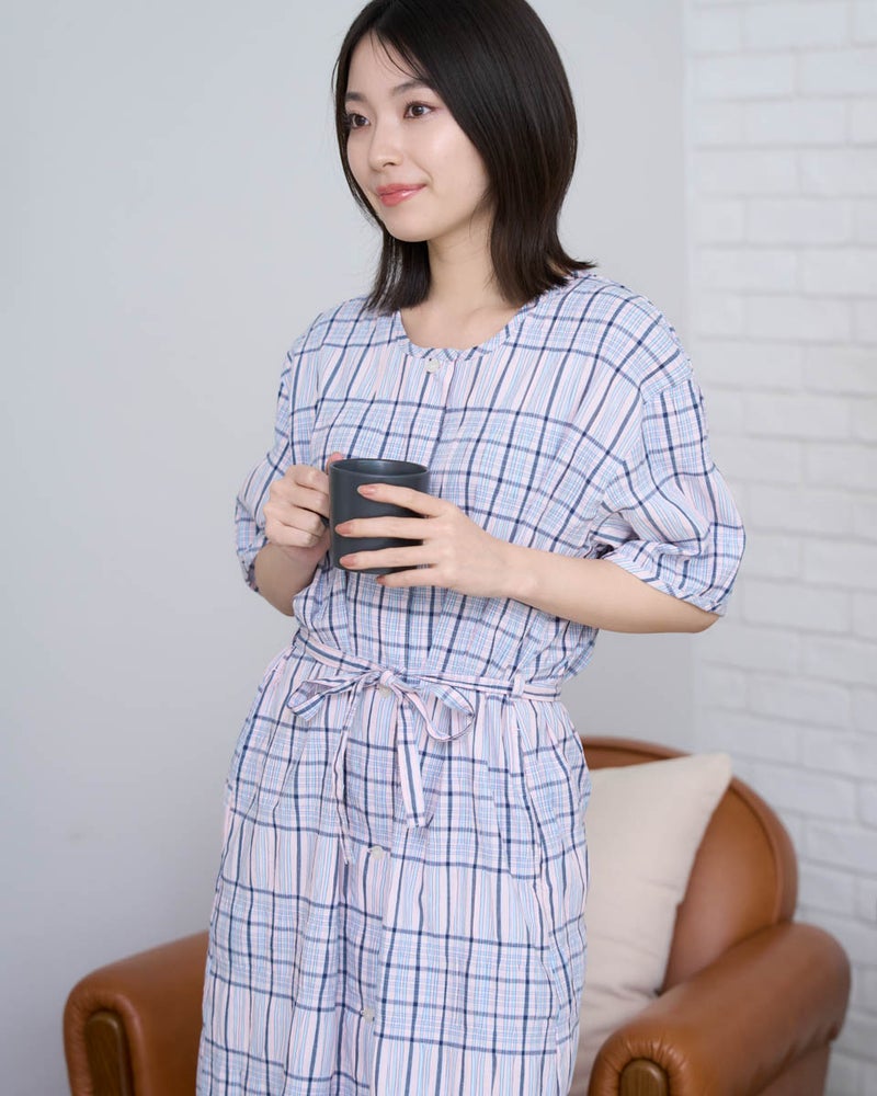 昨年人気があった、ワンピースのチェック柄を作りました。凹凸のある生地が肌離れよく、暑い季節でもさらりと快適な着心地を叶えます。ゆったりとしたサイズ感が身体をふんわり包み込み、締め付け感のないストレスフリーな着心地を実現。ちょっとした外出にもそのまま使える、抜け感のある大人カジュアルな一着です。