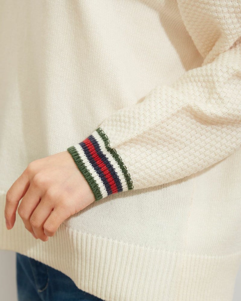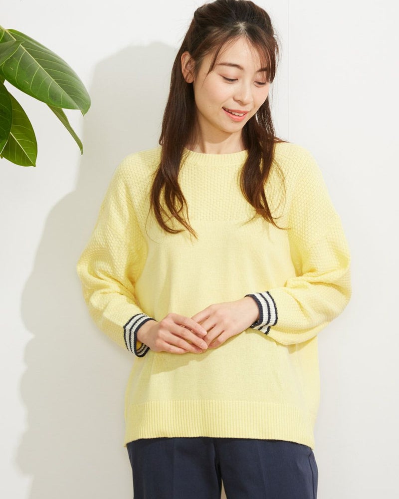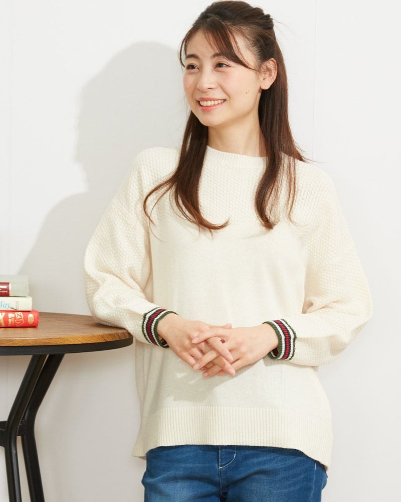 ミドルゲージのクルーネックニットです。表情のある鹿の子編みを組み合わせています。袖口のボーダー使いがアクセント。袖巾を少しゆったり目にしているのでシャツとの着合わせでもストレスなく着用していただけます。 モデル身長: 165 cm 着用サイズ: M サイズ Golden Bear WOMEN ニット (WOMEN)