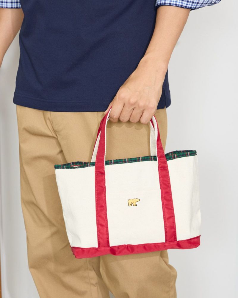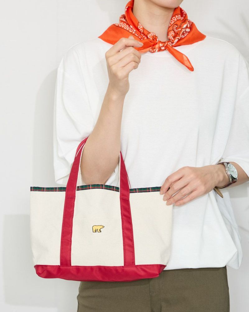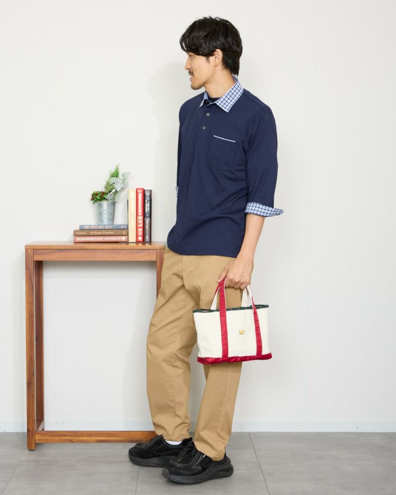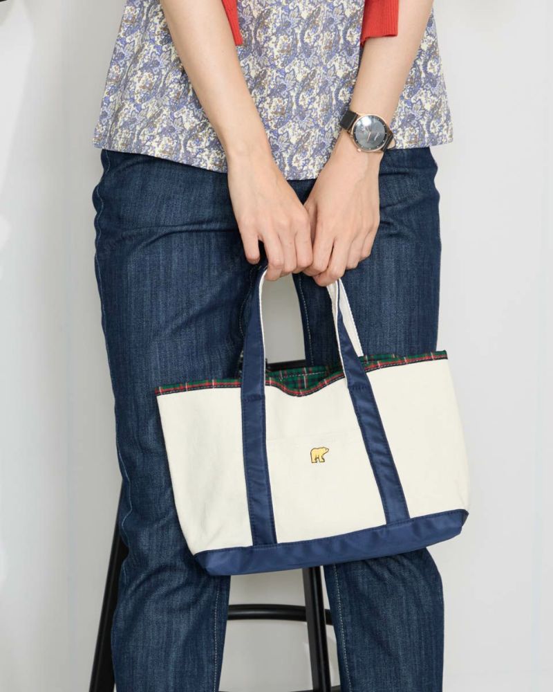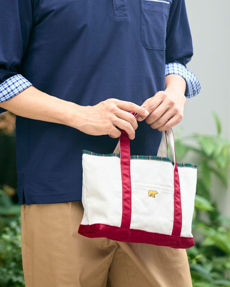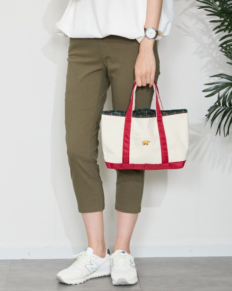 ナチュラルなキャンバス地のボディーに、コントラストカラーのハンドルが印象的なトートバッグです。内側ポケットのGBチェック柄がアクセントになってます。メンズ・レディスの共通企画です。ご夫婦でオススメです。 Golden Bear Ladies' アクセサリ (Ladies') 家族コーディネート 【着用アイテム】467Q4601 カーディガン 467QA401 プリントTシャツ 467QA411 半袖チュニック 467Q6703 テーパードパンツ 467QA703 ストレッチクロプトパンツ