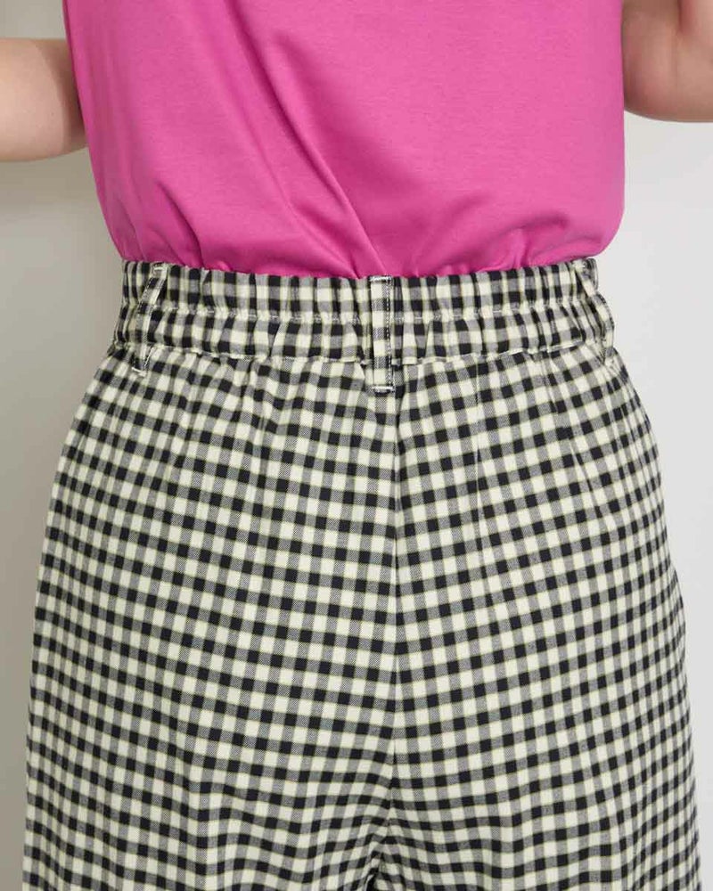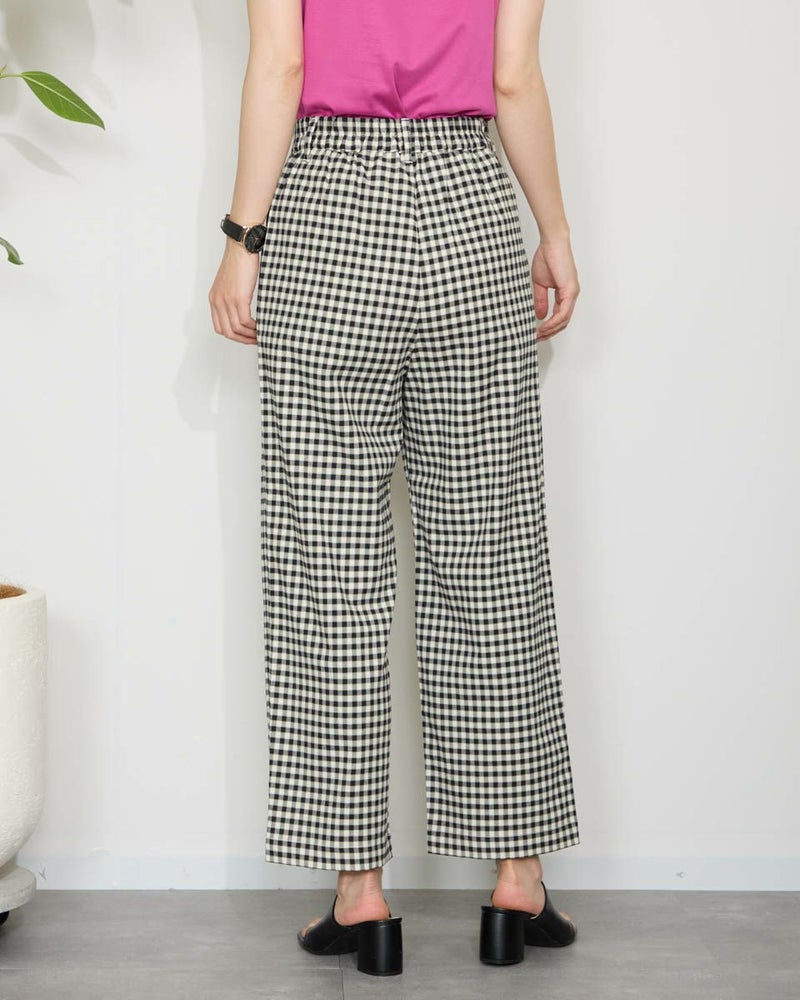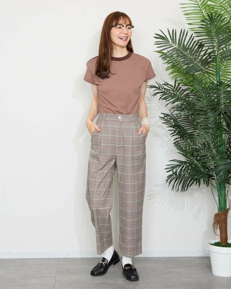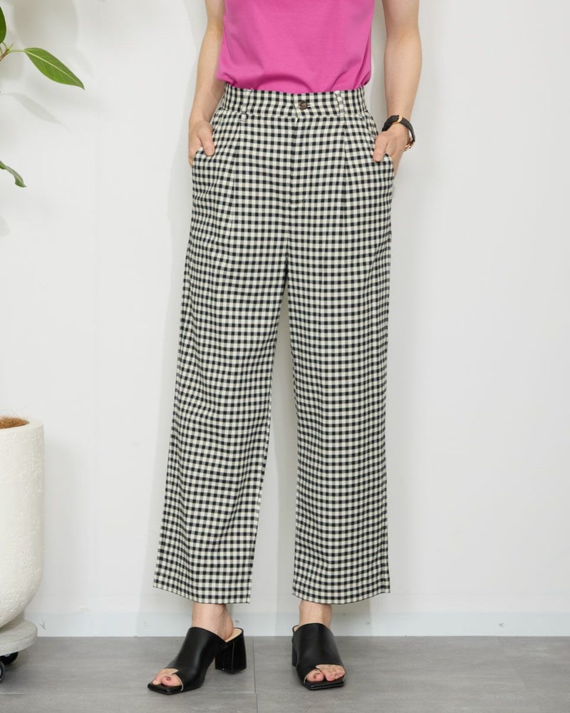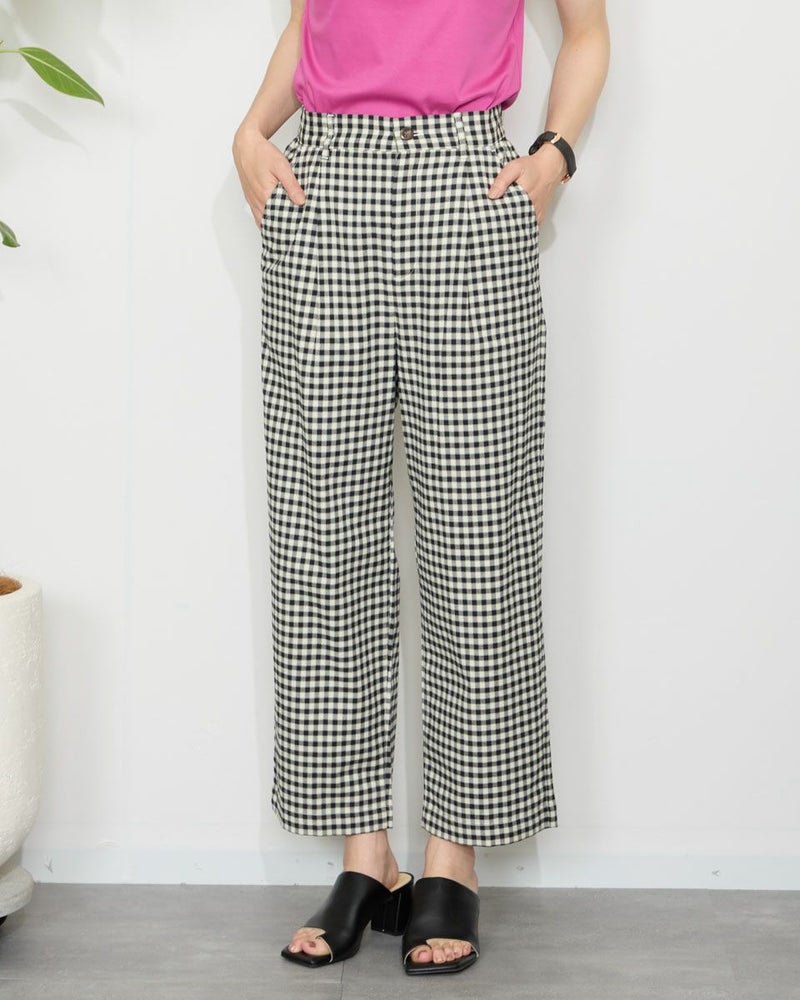テンセル綿のツィル素材を使用したチェック柄のパンツです。テンセルの柔らかい風合いと清涼感のあるサラッとした肌触りが特徴です。前ウエストはワンタック、後ろウエストはギャザーゴム仕様で全体にゆったりとしたストレートシルエットです。柄違いの2色展開でグレー色のベーシックなグレンチェックにピンクのラインをポイントに入れたグレー系と、ブラックカラーのベーシックなギンガムに黄緑のラインをポイントにいれた白×黒の展開です。