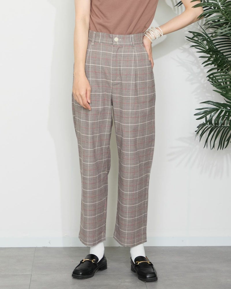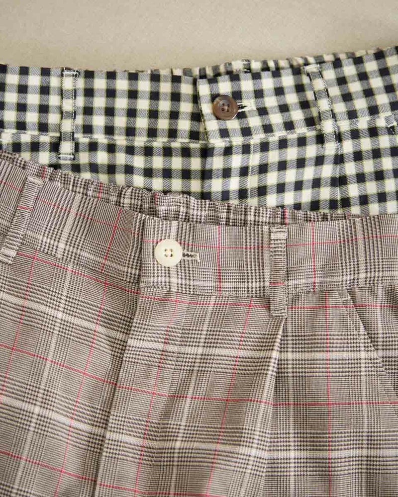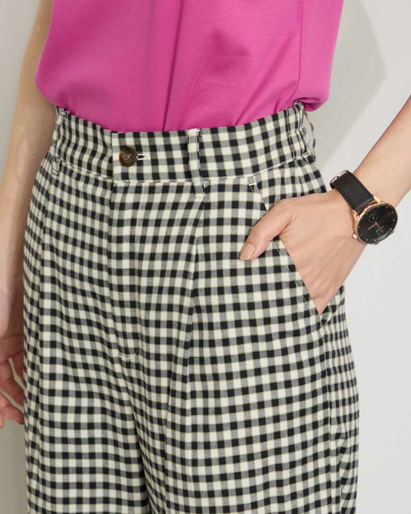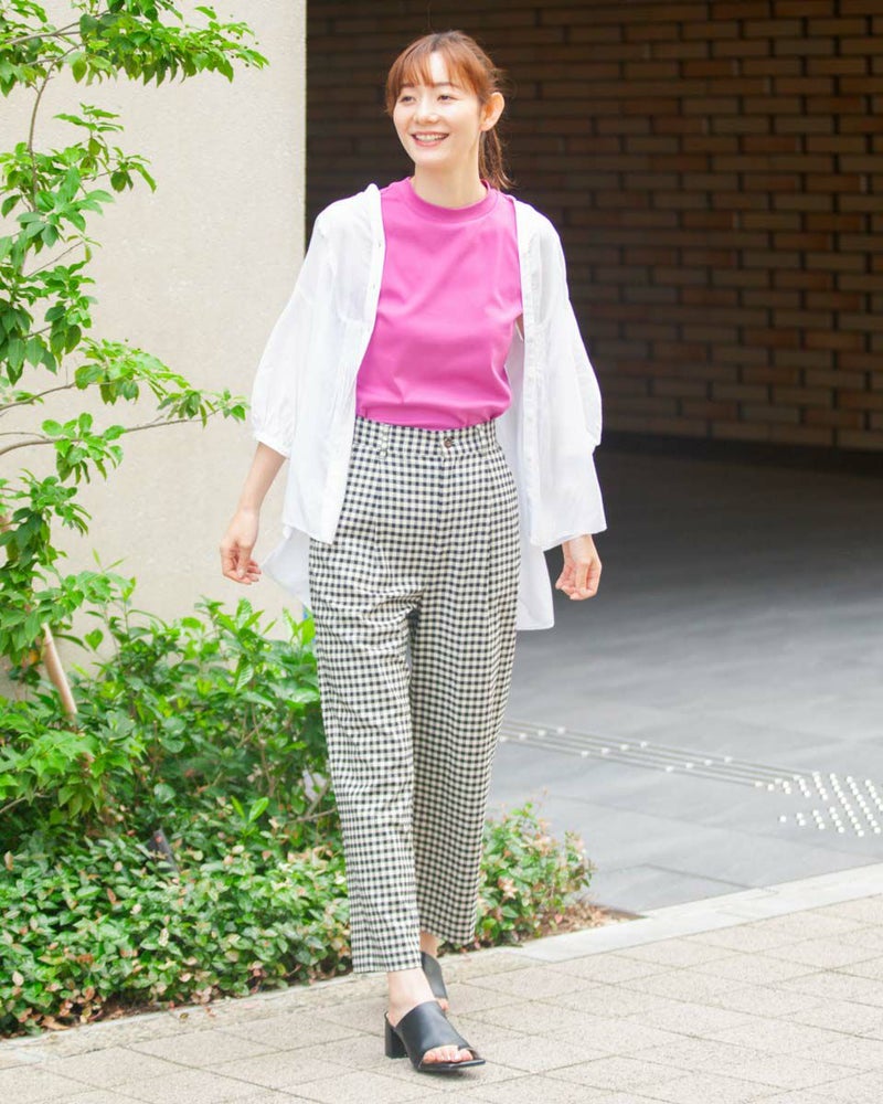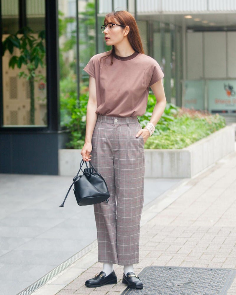 テンセル綿のツィル素材を使用したチェック柄のパンツです。テンセルの柔らかい風合いと清涼感のあるサラッとした肌触りが特徴です。前ウエストはワンタック、後ろウエストはギャザーゴム仕様で全体にゆったりとしたストレートシルエットです。柄違いの2色展開でグレー色のベーシックなグレンチェックにピンクのラインをポイントに入れたグレー系と、ブラックカラーのベーシックなギンガムに黄緑のラインをポイントにいれた白×黒の展開です。