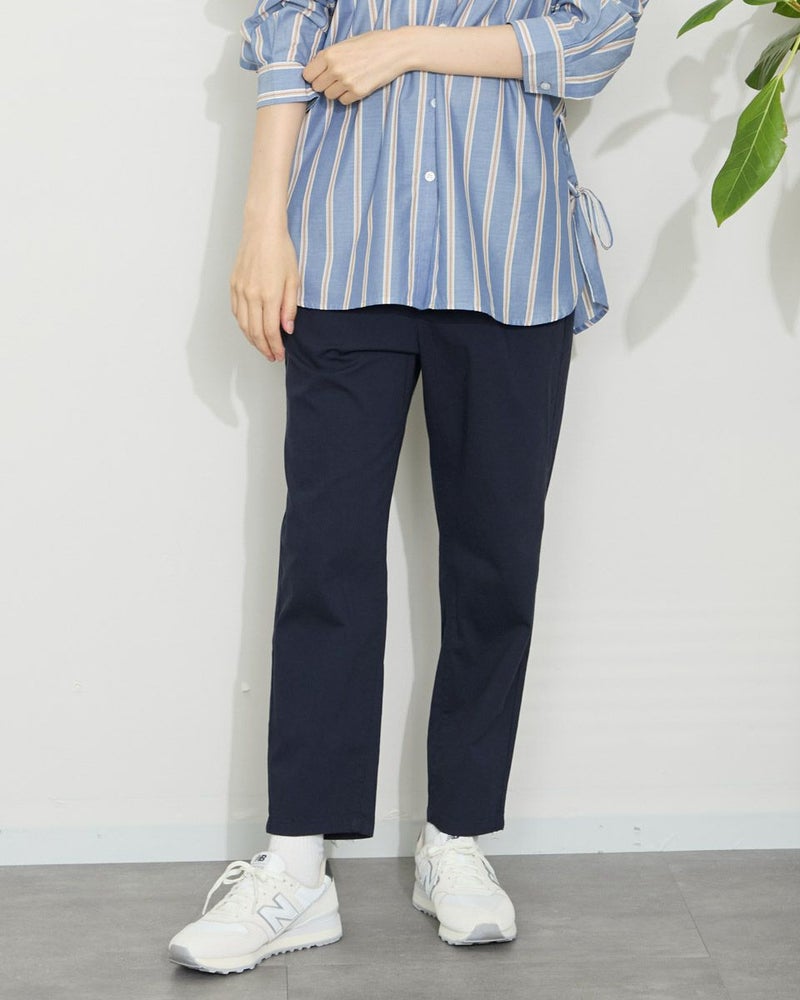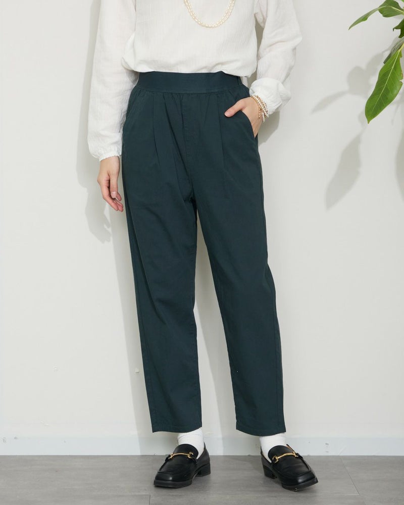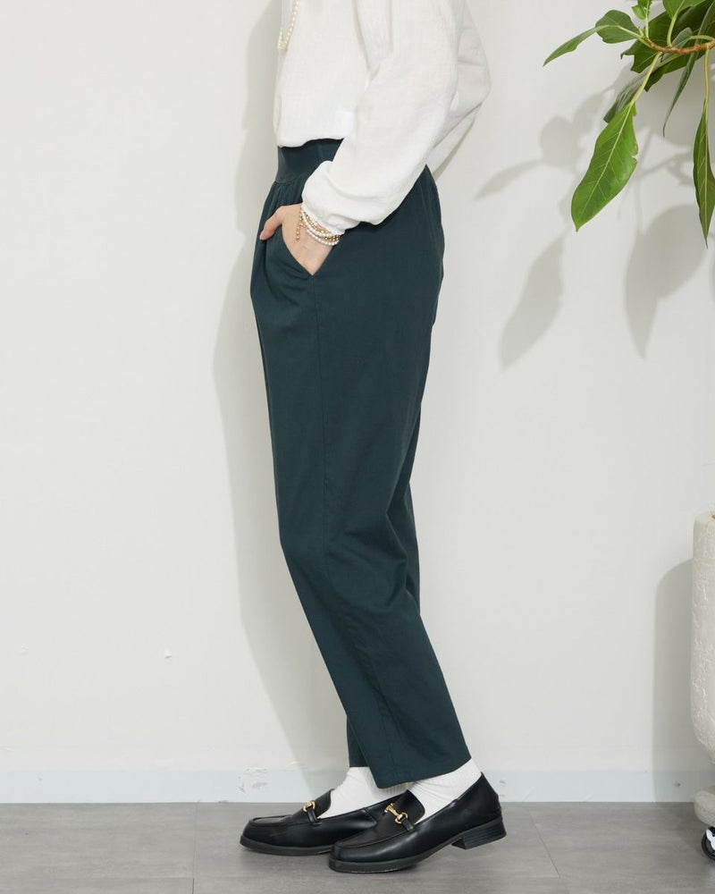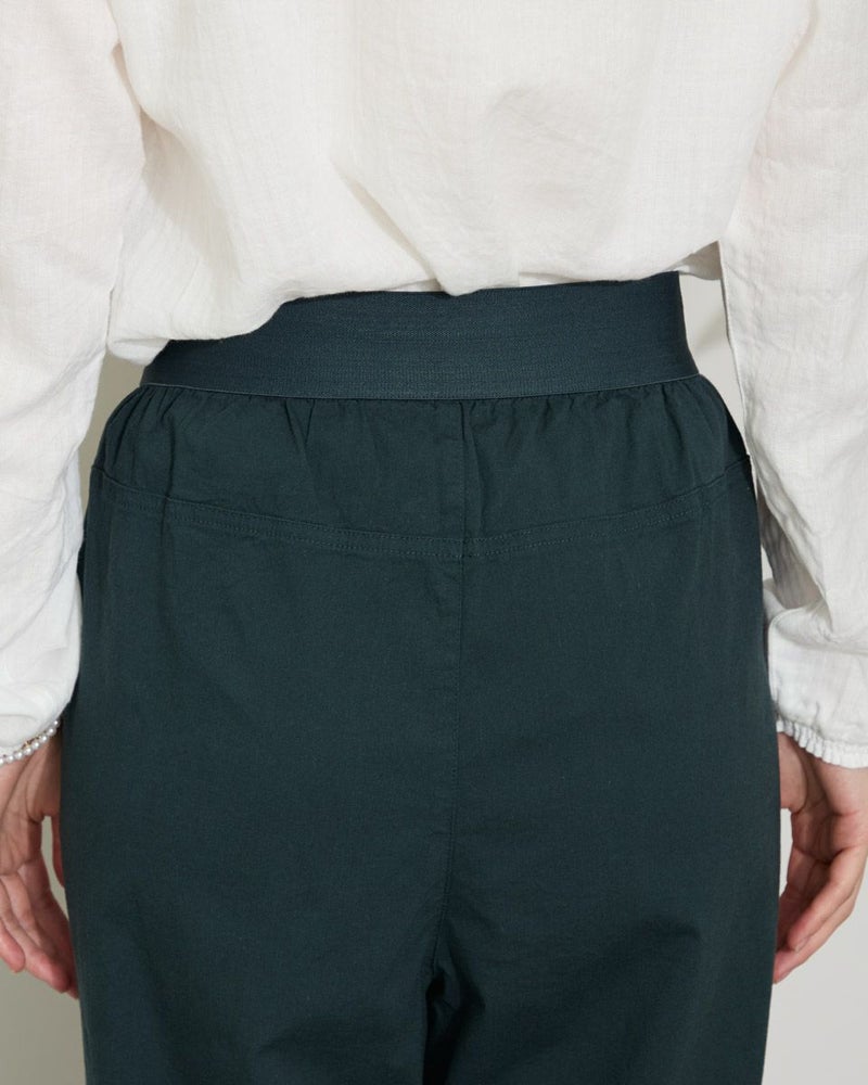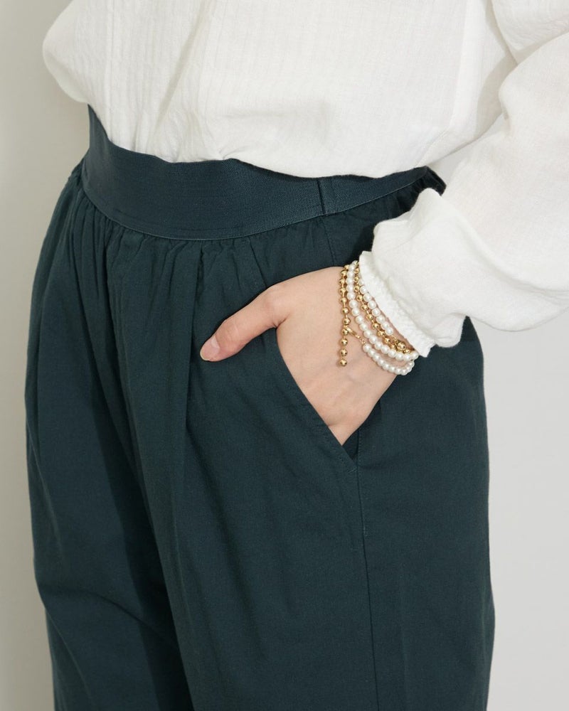 サラッとした肌触りの麻混素材を使用したクロップドパンツです。デザインはギャザーとタックを入れヒップ周りにゆとりを持たせたテーパードシルエットです。ウエストのベルト部分は本体と同色の平ゴムを直に接いでいますので良く伸びます。着用時の快適なはき心地をぜひお楽しみください。