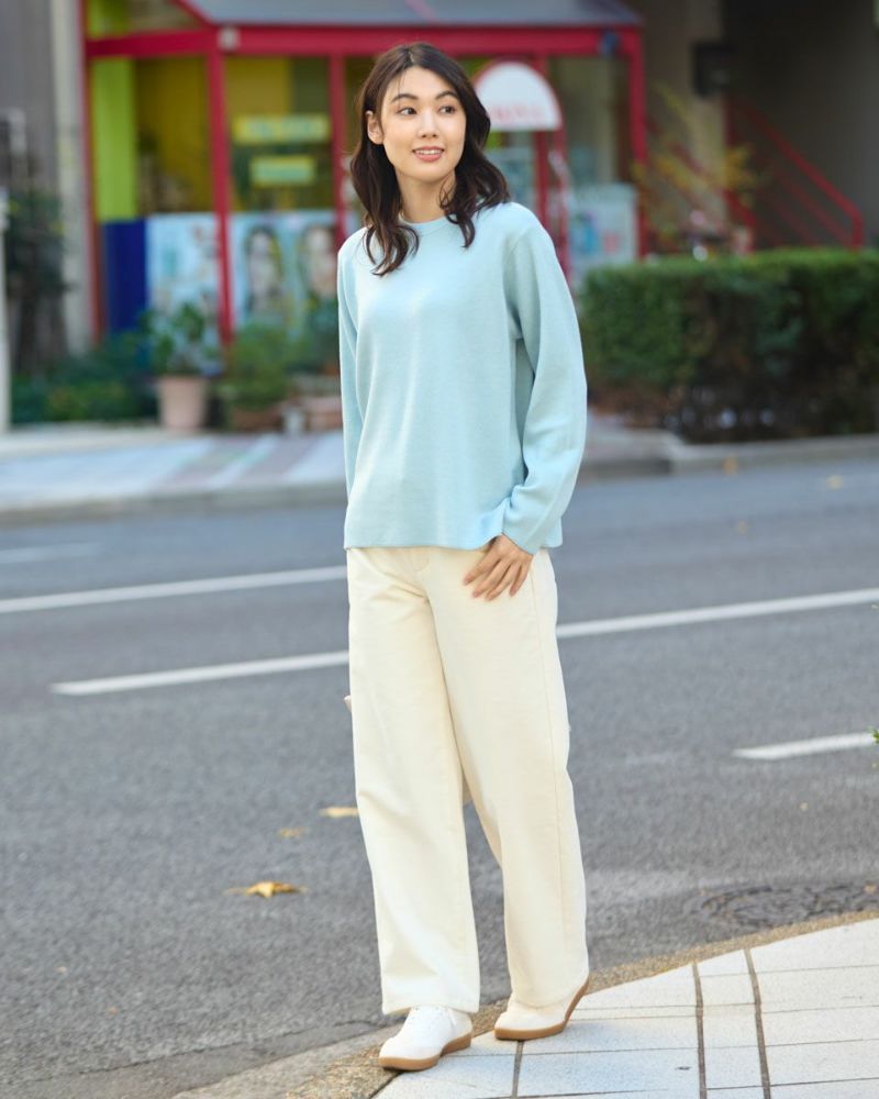 軽さのあるダブルジャカードでカジュアルながらもニットの上品さを兼ねそなえたアイテムです。左下にGBのロゴを入れてポイントにしました。柔らかな色が女性らしく着用できる1枚です。 モデル身長: 166 cm 着用サイズ: M サイズ Golden Bear Ladies' ニット (Ladies') 【着用アイテム】467R1340 シャツ 467QE702 ストレートパンツ 468QD050 トートバッグ