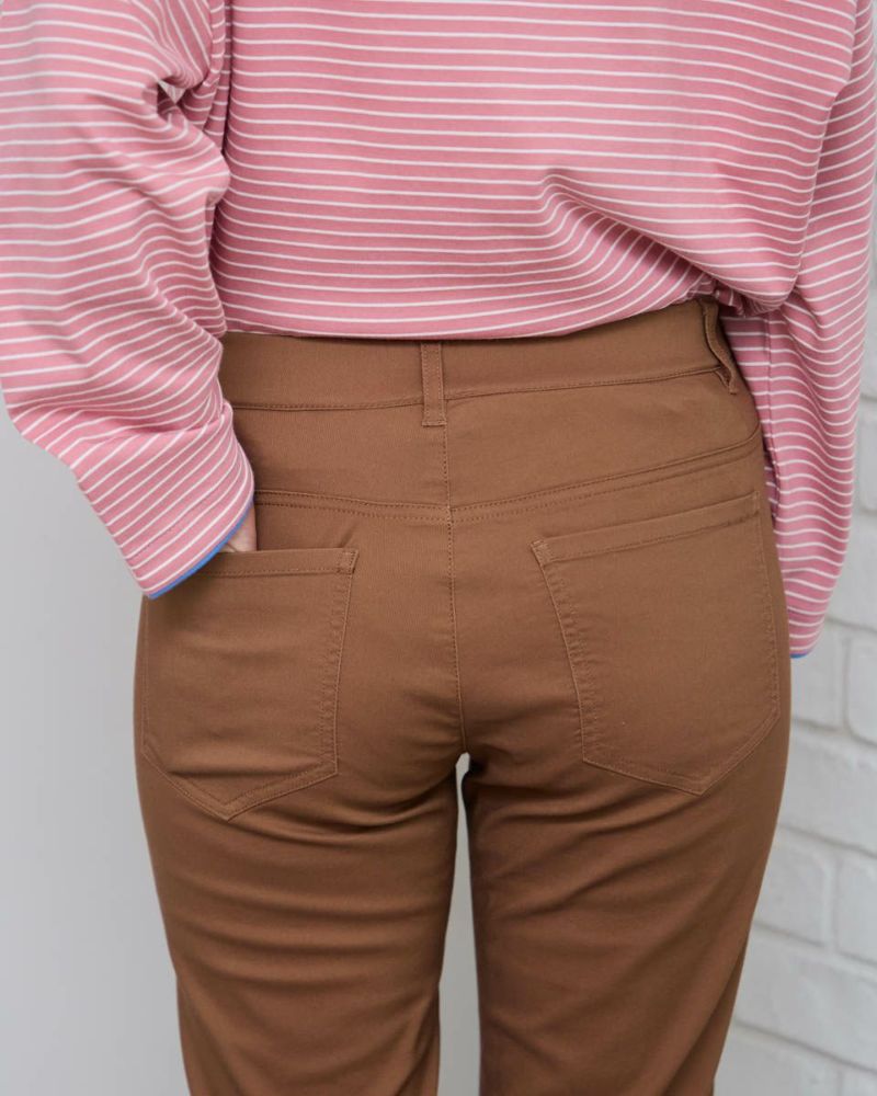 綿ポリエステルのバックサテン素材を使用したベーシックなファイブポケットのテーパードパンツです。ウエストは後ろのみ平ゴムを入れ、伸びる仕様にしています。 モデル身長: 167 cm 着用サイズ: 61 サイズ Golden Bear Ladies' ボトムス (Ladies') 【着用アイテム】467R3403 ボーダーTシャツ 467R3430 GB天竺Tシャツ 467R4331 GBチェックシャツ