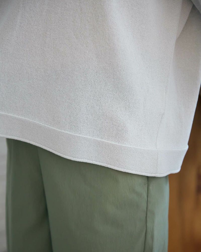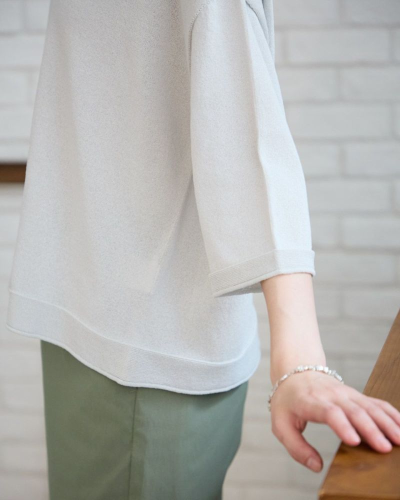 和紙とポリエステルの糸を使用しホールガーメントで編んだプルオーバーです。清涼感ある凹凸感をお楽しみいただけます。触り心地はサラサラしていて張りがあり、強度も高くしっかりした編み上がりのニットです。 モデル身長: 166 cm 着用サイズ: M サイズ Golden Bear Ladies' ニット (Ladies') 【着用アイテム】467R4701 ガウチョパンツ 468R3760 ストレートパンツ