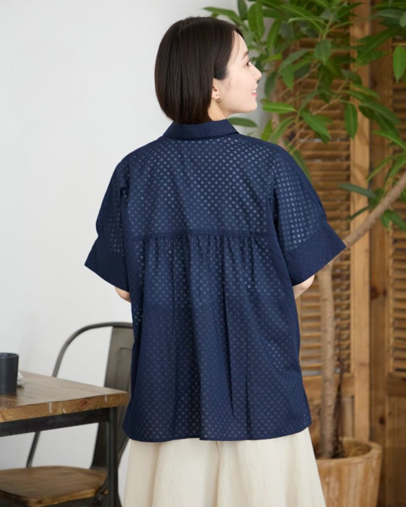 水玉柄にオパール加工した綿ポリエステル素材のブラウスです。(オパール加工とは薬品で繊維の糸を溶かし透かし模様を作る加工のこと)身頃は分量をゆったりととり、袖は五分丈のドルマンスリーブになります。台襟付きシャツカラーで前開きのデザインなので羽織としても着用頂けます。裾は前後差をつけ、前の両脇はラウンドせさせて、後ろは直線のスリットにしています。色はアイボリーとネイビーの2色展開になります。