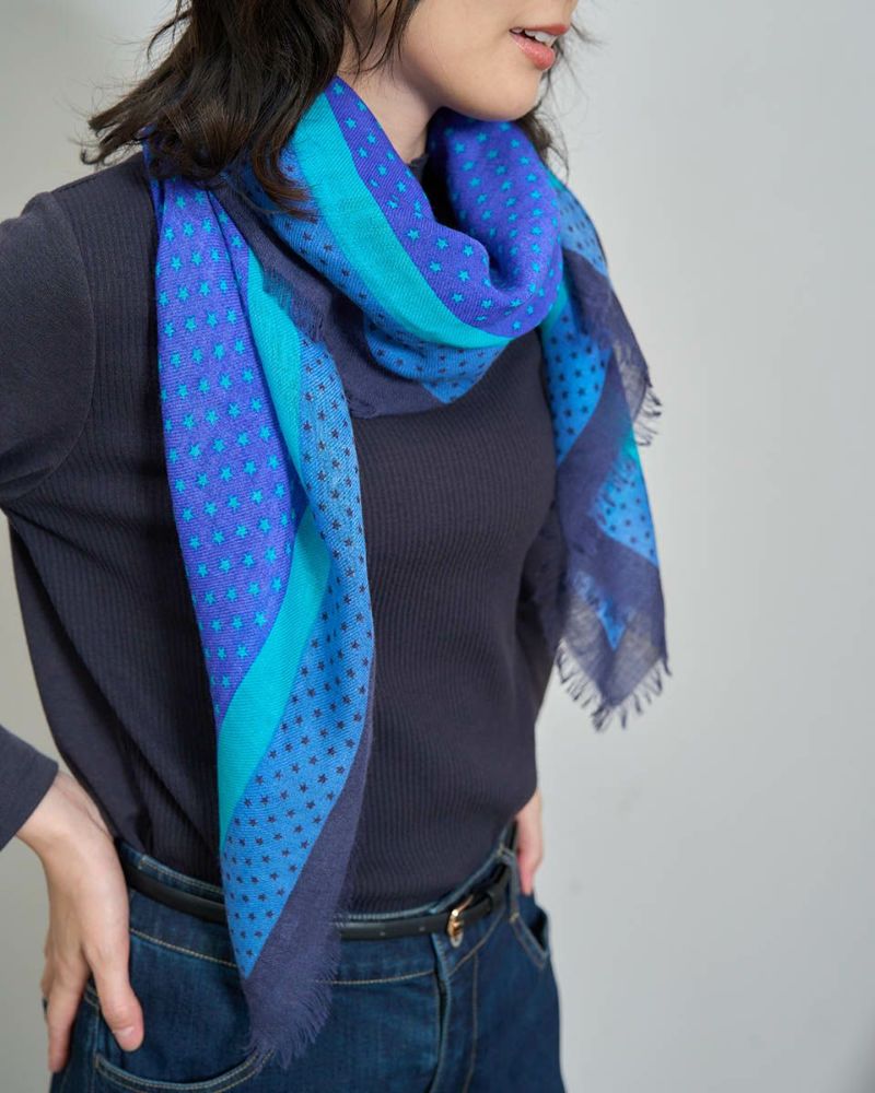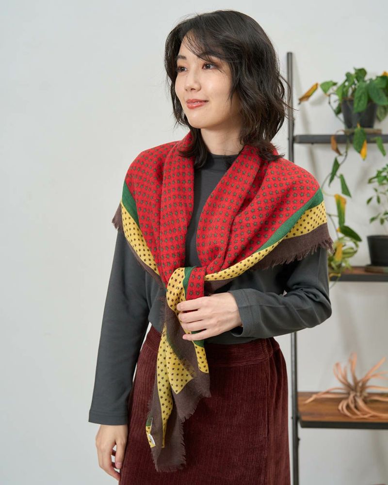 暖かなウール素材を使用した正方形の大判ストールです。細かな星柄がポップになり過ぎず巻くだけで主役になるストールです。 Golden Bear Ladies' アクセサリ (Ladies') 【着用アイテム】467RD402 布帛切替カットソー 467RD403 リブハイネックカットソー 468RD750 コーデュロイスカート