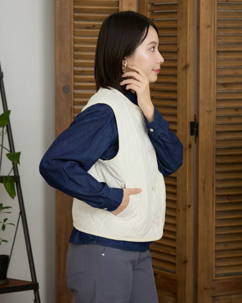 ダイヤキルト柄のキルティングベストです。さまざまなアイテムとレイヤードしやすく春や秋はサッと羽織ってコーディネートのポイントに。冬はコートインして防寒アイテムとしても活躍します。 モデル身長: 162 cm 着用サイズ: M サイズ Golden Bear Ladies' アウター (Ladies') 同デザイン大きい(3L,4Lサイズ)はこちら 【着用アイテム】467RC331 ショート丈デニムシャツ 467RC410 切り替えカットソー 467RD334 チェックネルシャツ 467RC710 ツイルストレートパンツ 467RC712 デニムAラインスカート 467RE703 ストレッチコーデュロイパンツ