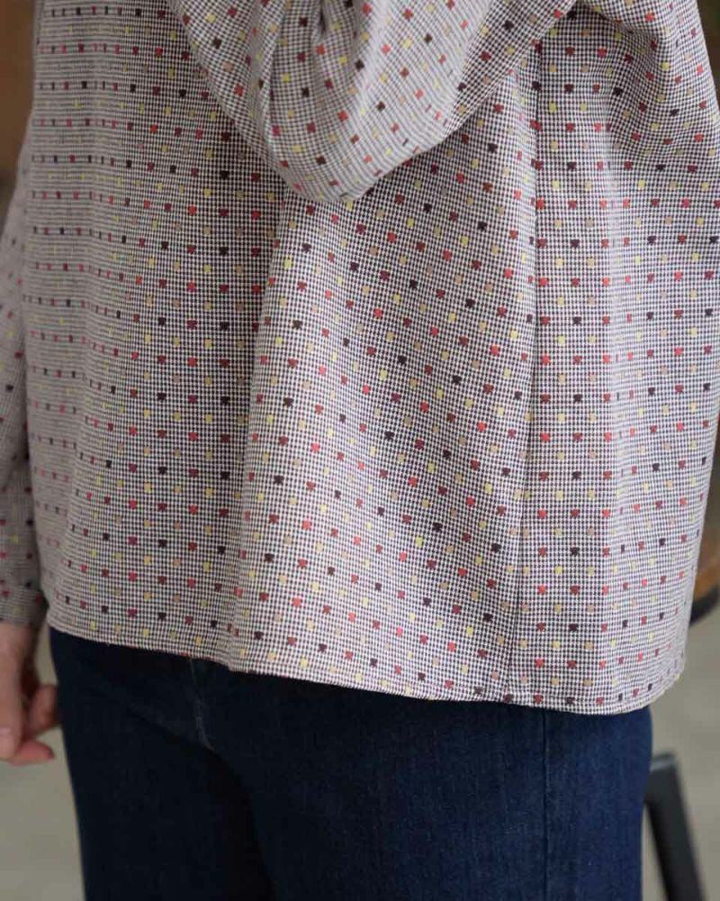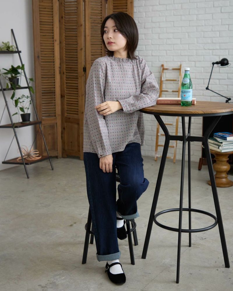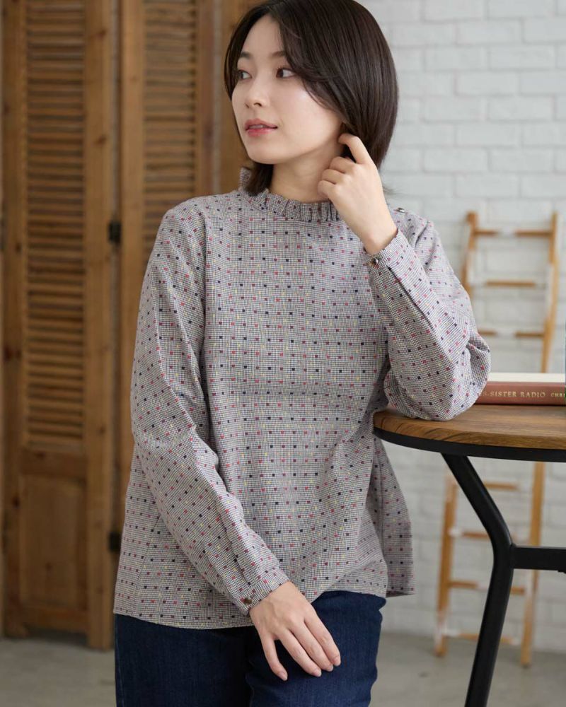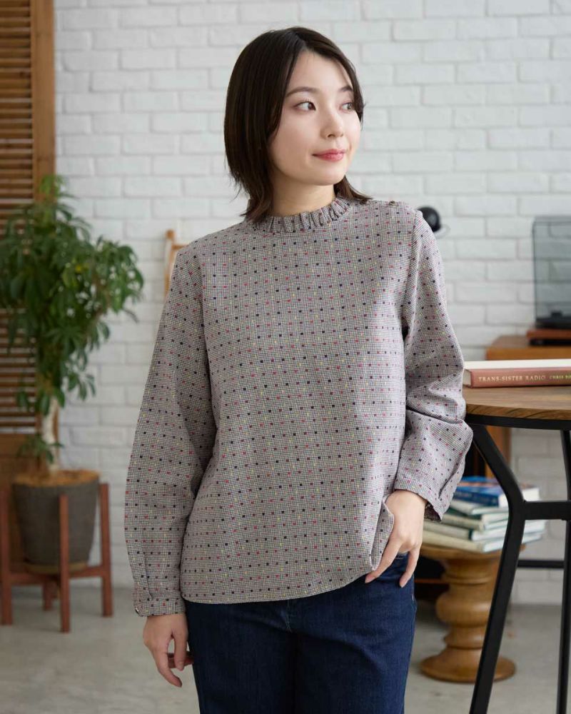 クラシカルな印象を引き立てる千鳥格子柄に、フリルの襟元が映えるブラウス。被り仕様ですが襟元のボタンで着脱もスムーズ。甘すぎない柄とディテールで上品な一枚です。ジャケットやカーディガンのインナーとしても映える、着まわしのきくアイテムです。