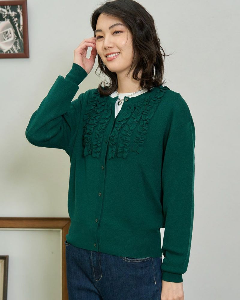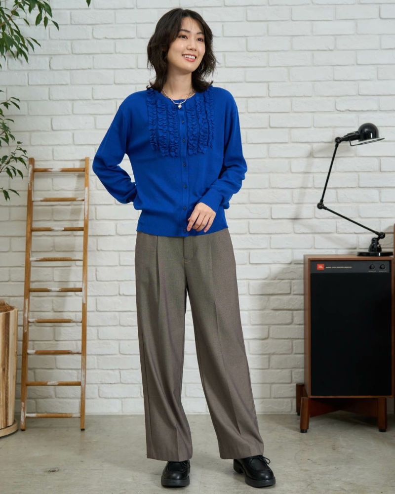 胸元にあしらったフリルがシンプルなカーディガンに彩りをプラス。少し膨らみのある編み地で1枚で着こなせるよう仕上げました。デニムやカジュアルアイテムと合わせるのがおすすめです。