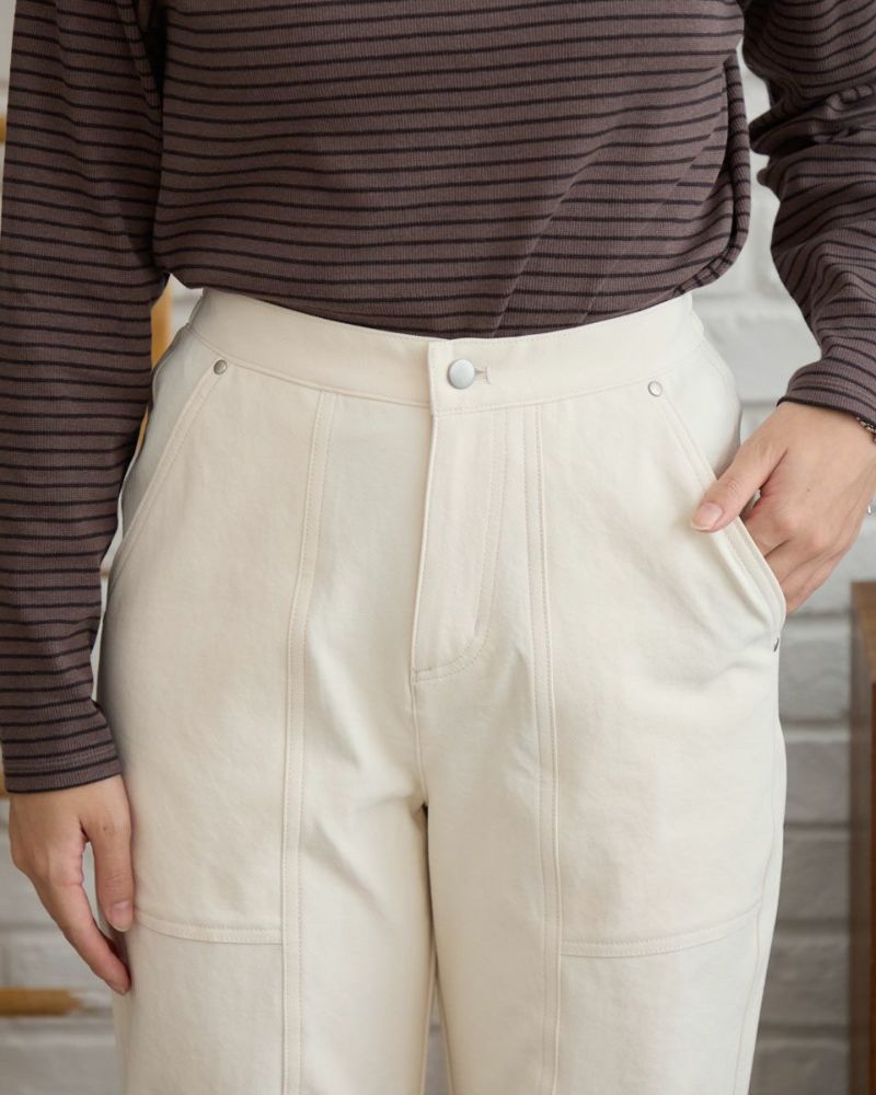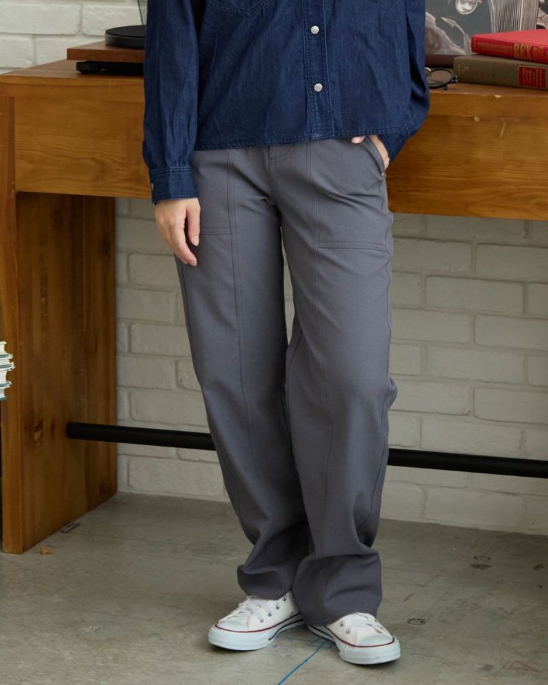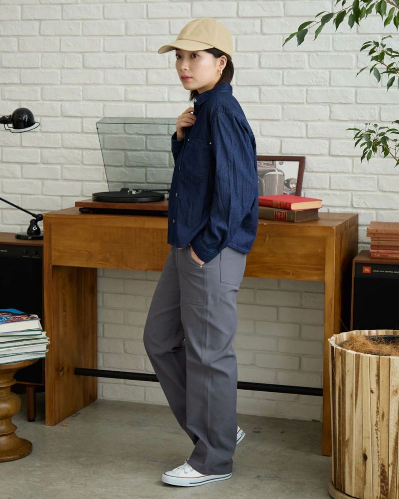 特殊な糸を使用したツイル素材のパンツです。軽く、ドライタッチで通気性、保温性、伸縮性に優れた素材です。生地に程よい厚みがありつつも軽く履き心地の良いパンツに仕上がっています。ワークな雰囲気の切り替えラインが足をまっすぐきれいに見せる効果が期待できます。 モデル身長: 162 cm 着用サイズ: 61 サイズ Golden Bear Ladies' ボトムス (Ladies') 【着用アイテム】467RC331 ショート丈デニムシャツ 467RC414 天竺無地・ボーダー長袖Tシャツ 468RC460 タートルネックリブTシャツ 467RD333 バッファローチェックシャツ 467RE633 洗えるGBラムウールカーディガン
