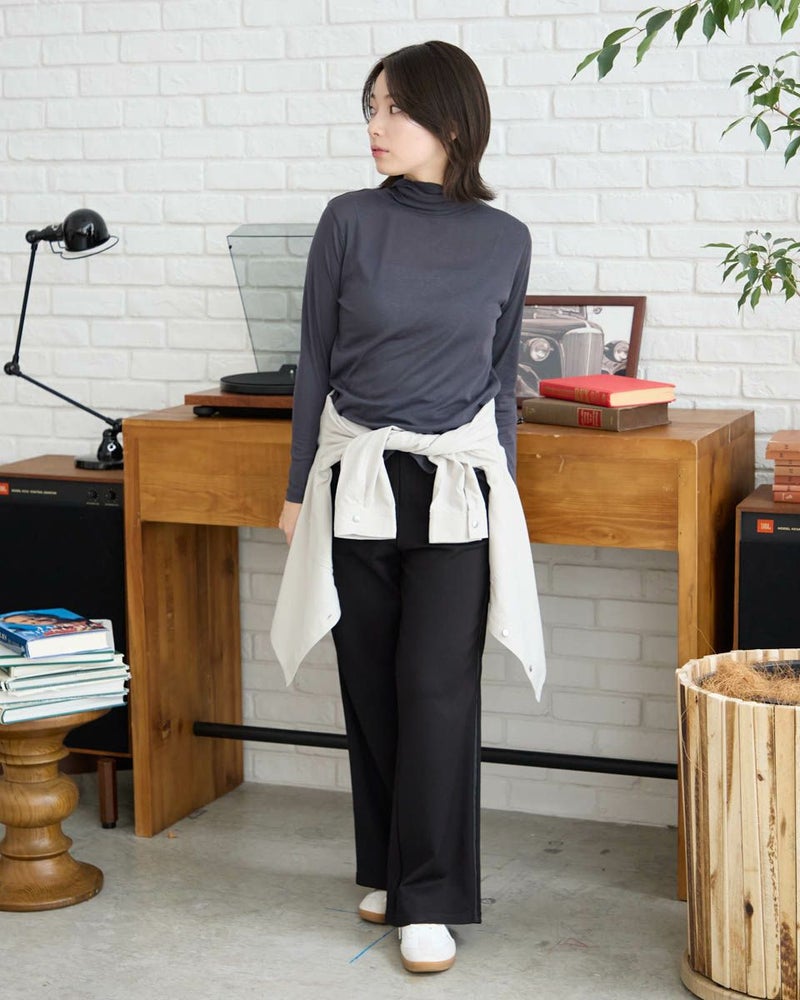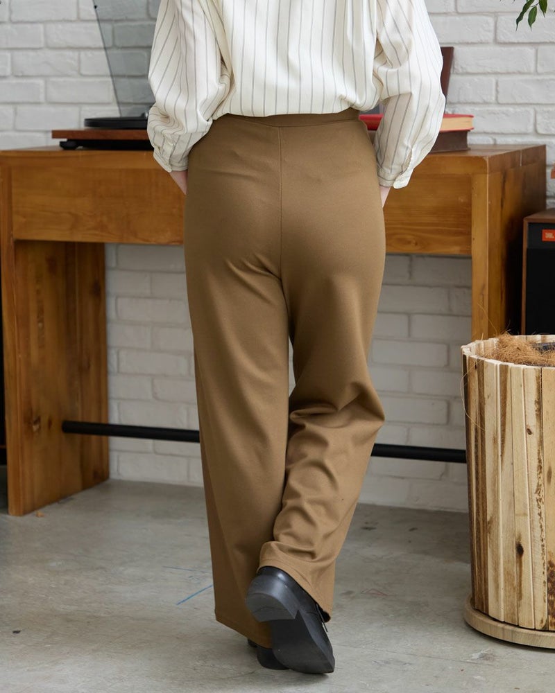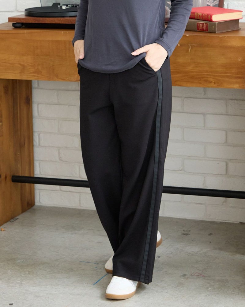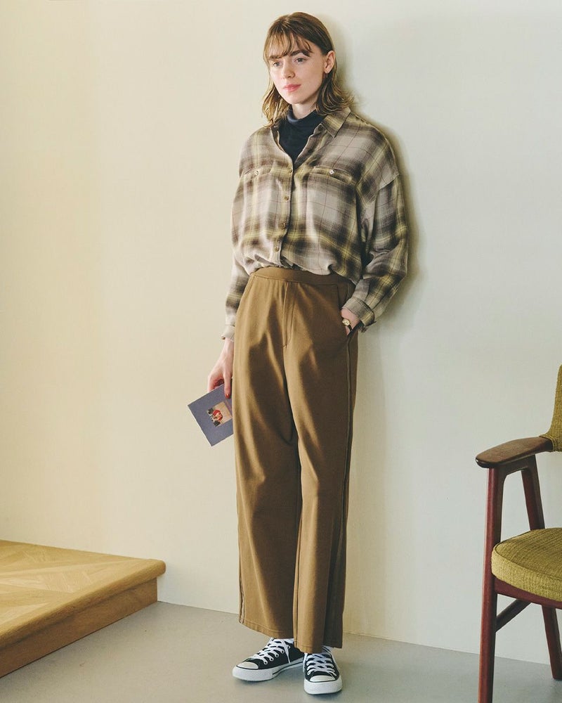 レーヨンナイロンスムース素材を使用したセミワイドパンツです。両脇に地色と同色染したグログランテープをラインアクセントとしてきかせたデザインです。ウエストは開き無しタイプで平ゴムを中に入れた仕様です。縦横に伸縮性が有ります。色は黒と茶の2色展開です。 モデル身長: 162 cm 着用サイズ: S サイズ Golden Bear WOMEN ボトムス (WOMEN) 同デザイン大きい(3L,4Lサイズ)はこちら 【着用アイテム】467RC301 オンブレチェックシャツ 467RC302 コットンストライプシャツ 467RC331 ショート丈デニムシャツ 467RC402 ドライタッチタートル長袖Tシャツ