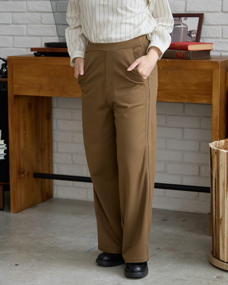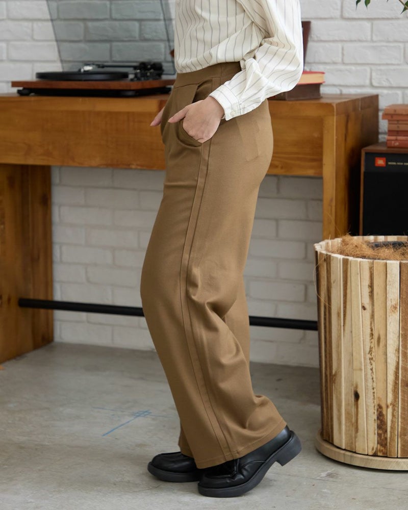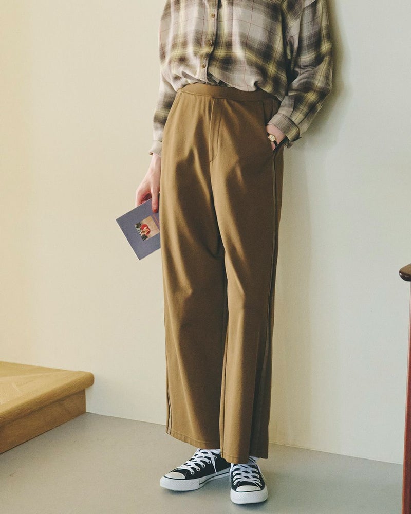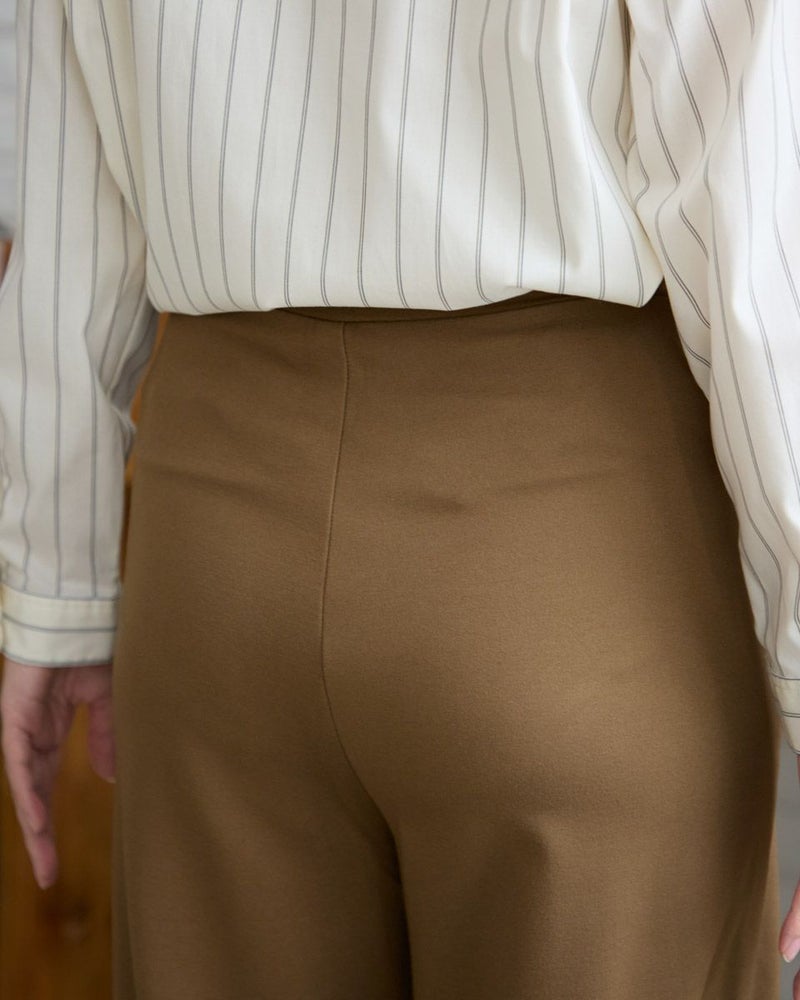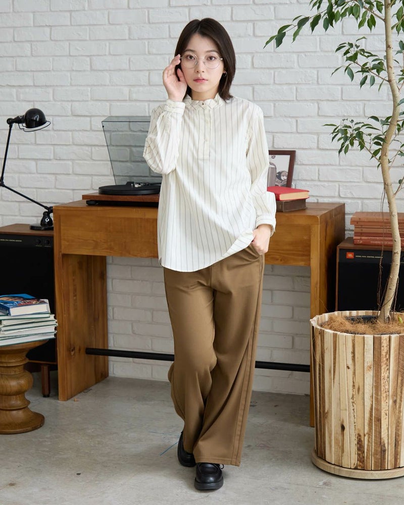レーヨンナイロンスムース素材を使用したセミワイドパンツです。両脇に地色と同色染したグログランテープをラインアクセントとしてきかせたデザインです。ウエストは開き無しタイプで平ゴムを中に入れた仕様です。縦横に伸縮性が有ります。色は黒と茶の2色展開です。 モデル身長: 162 cm 着用サイズ: S サイズ Golden Bear WOMEN ボトムス (WOMEN) 同デザイン大きい(3L,4Lサイズ)はこちら 【着用アイテム】467RC301 オンブレチェックシャツ 467RC302 コットンストライプシャツ 467RC331 ショート丈デニムシャツ 467RC402 ドライタッチタートル長袖Tシャツ