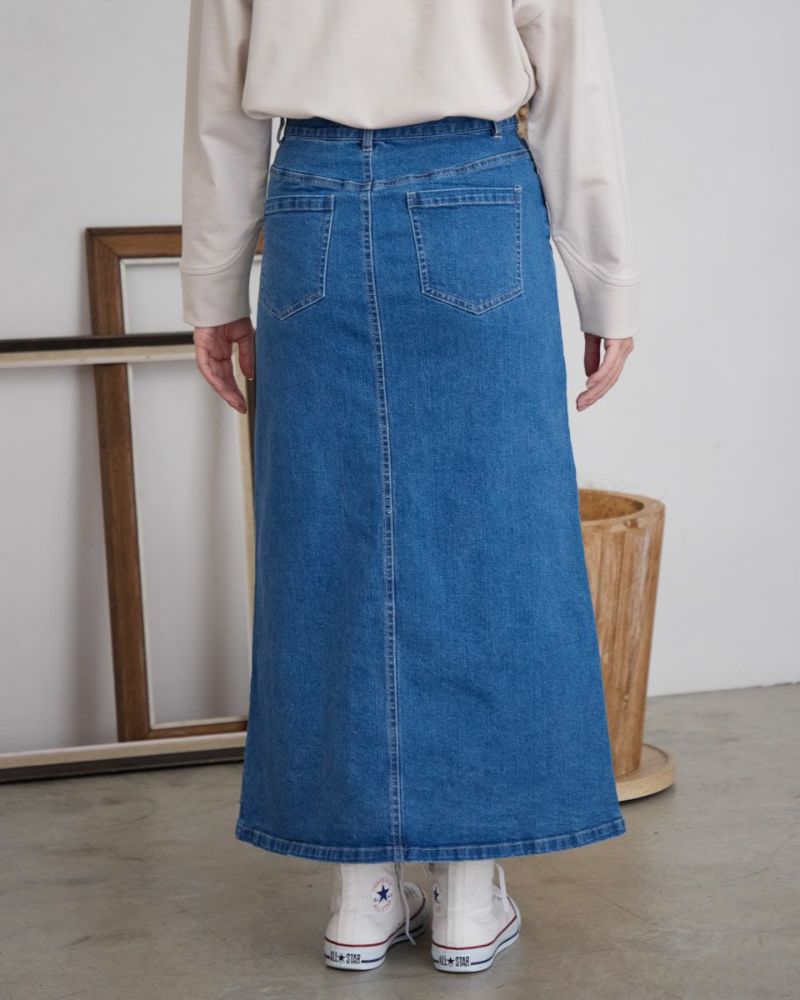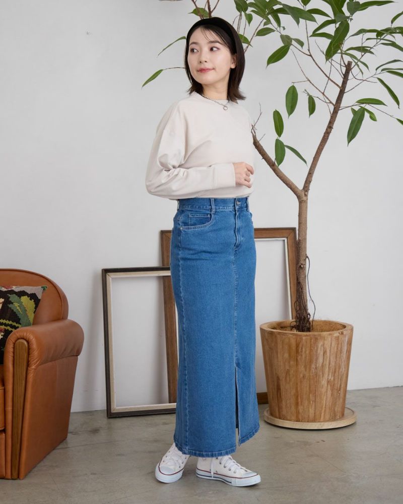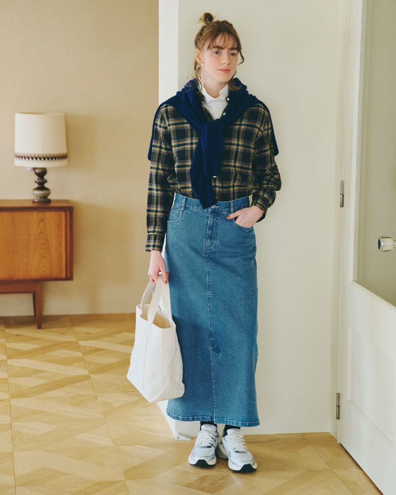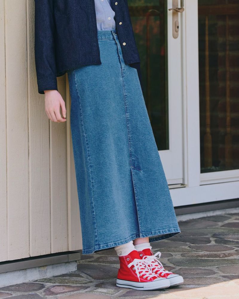 デニム素材のAラインのロングスカートです。前中心ファスナー開きで足さばきを良くするためにベンツを入れています。 モデル身長: 162 cm 着用サイズ: 61 サイズ Golden Bear Ladies' ボトムス (Ladies') 【着用アイテム】467RC410 切り替えカットソー 467RC414 天竺無地・ボーダー長袖Tシャツ 467RD334 チェックネルシャツ 467RE412 ハイネックカットソー 467RE601 ラクーン混カーディガン