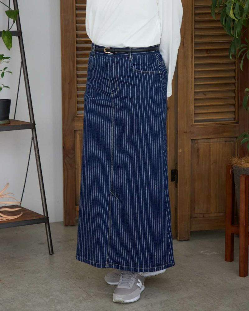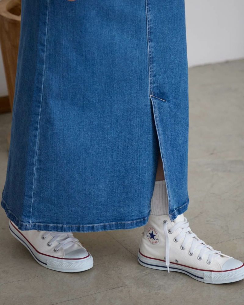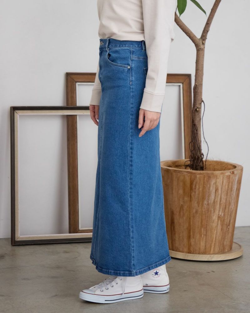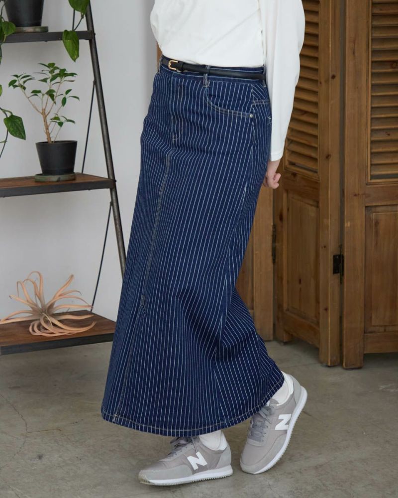 デニム素材のAラインのロングスカートです。前中心ファスナー開きで足さばきを良くするためにベンツを入れています。 モデル身長: 162 cm 着用サイズ: 61 サイズ Golden Bear Ladies' ボトムス (Ladies') 【着用アイテム】467RC410 切り替えカットソー 467RC414 天竺無地・ボーダー長袖Tシャツ 467RD334 チェックネルシャツ 467RE412 ハイネックカットソー 467RE601 ラクーン混カーディガン