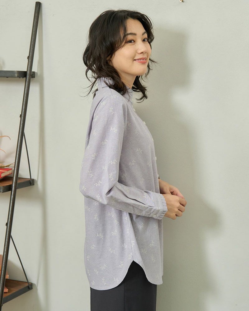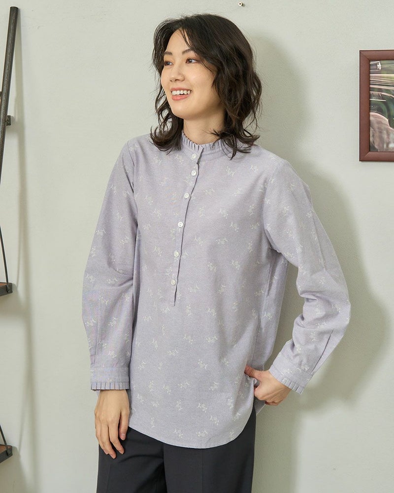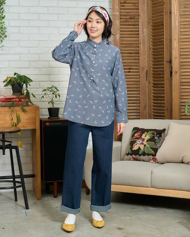 オーガニックコットン100%のブラウスです。襟端とカフス端に細かいタックを挟んだデザインがポイントです。細い前立てで途中まで深く開けていますので、かぶるデザインでも楽に着脱ができます。シャンブレー素材に白の顔料プリントで小花柄をのせています。 モデル身長: 166 cm 着用サイズ: M サイズ Golden Bear WOMEN ブラウス (WOMEN) 同デザイン大きい(3L,4Lサイズ)はこちら 【着用アイテム】468R4760 サスペンダーパンツ