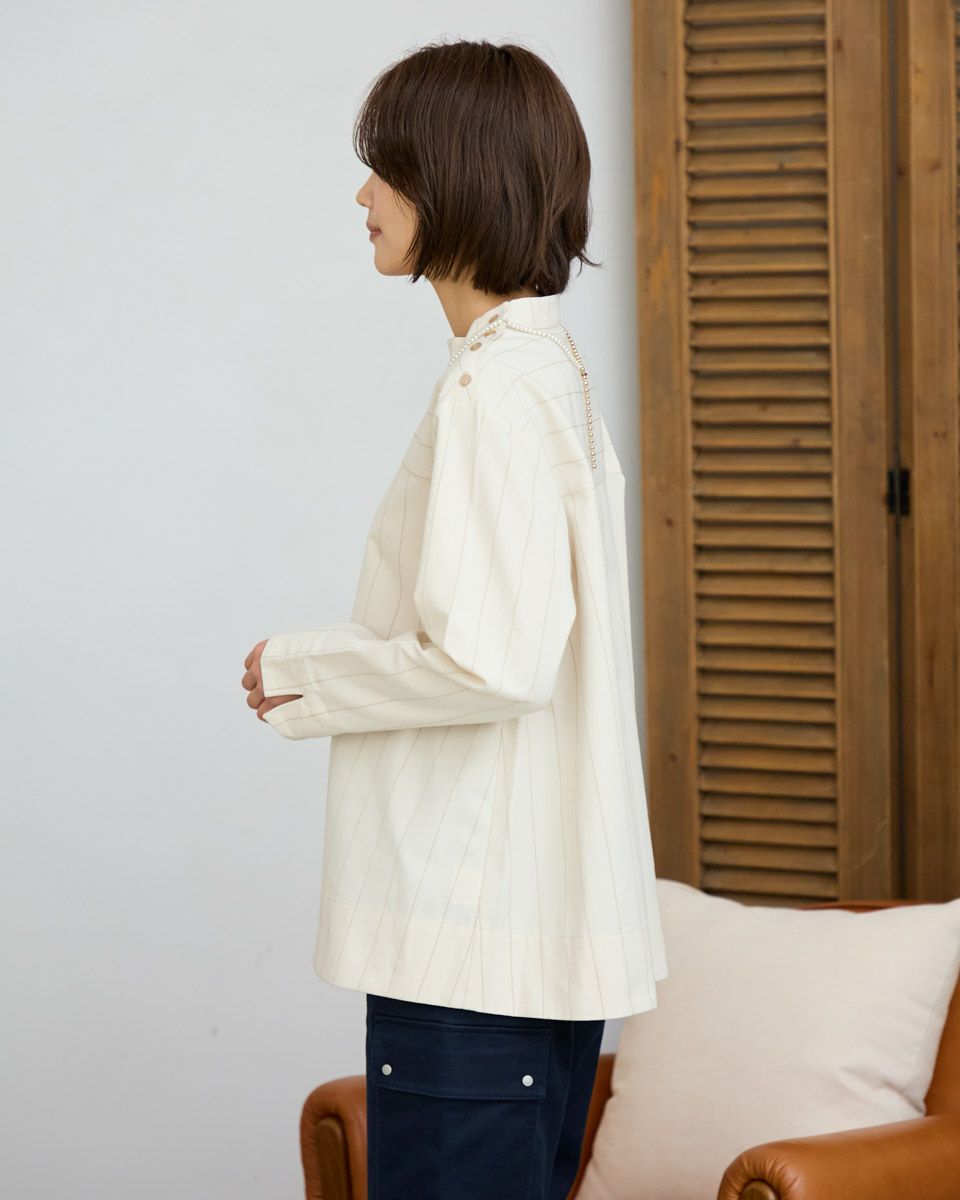 立体感のある微配色ストライプ柄が特徴のかぶりブラウスです。袖口はスリットを入れることで折り返し易い仕様です。女性らしいフレアシルエットはテーパードパンツと相性が抜群です。 モデル身長: 167 cm 着用サイズ: M サイズ Golden Bear WOMEN ブラウス (WOMEN) 【着用アイテム】467RD701 ストレートカーゴパンツ