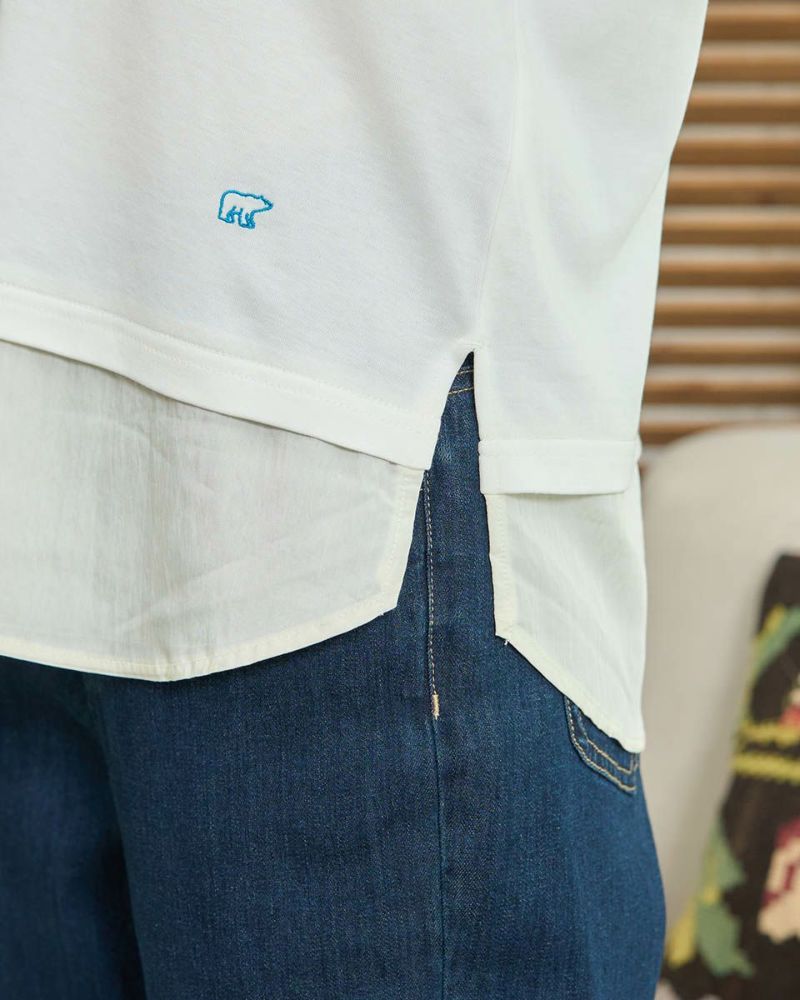 ハイネックカットソーをベースに、裾部分に布帛素材を切り替えました。身頃と袖は柔らかく伸縮性のあるカットソーで仕立てており、快適な着心地を実現。裾の布帛部分が重ね着した際にブラウスのようなレイヤードスタイルを演出し、コーディネートに華やかさをプラスします。一枚で着ても、インナーとしても使いやすい万能なアイテムです。
