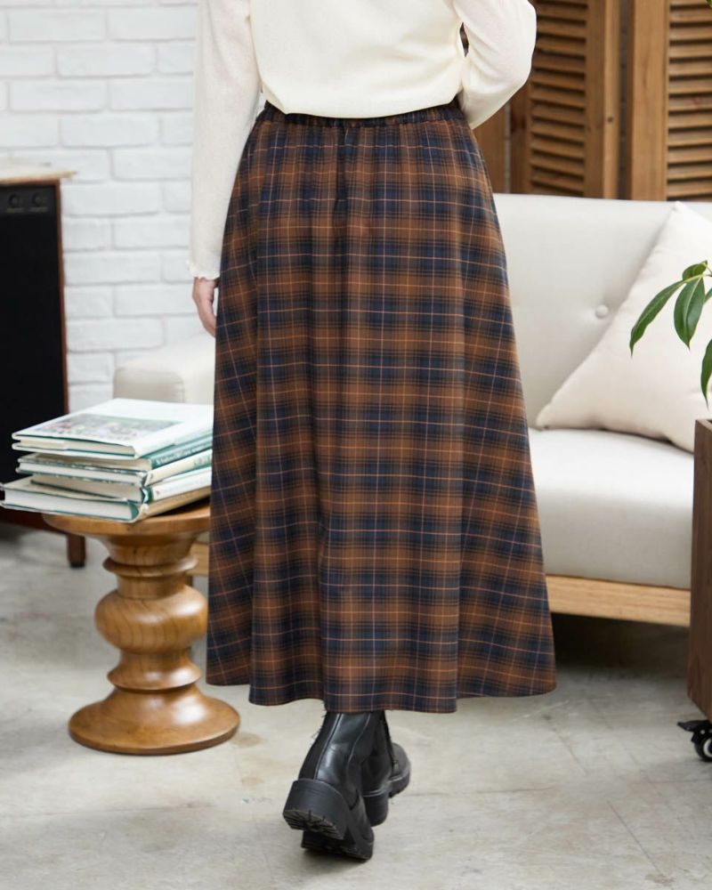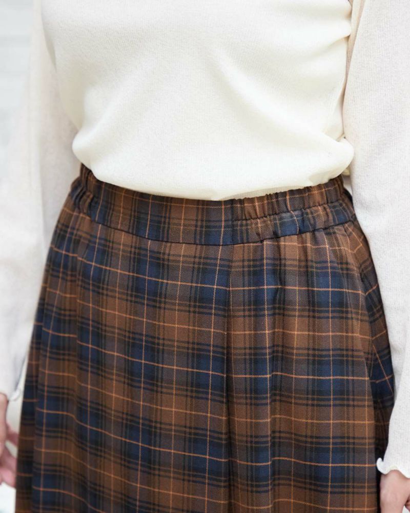 ポリエステル,レーヨン,ポリウレタンのフレアスカートです。前ウエストの脇から後ろウエストに平ゴムを入れています。ファスナー無しでらくにはくことができる仕様になっています。左前に深くタックを取りました。