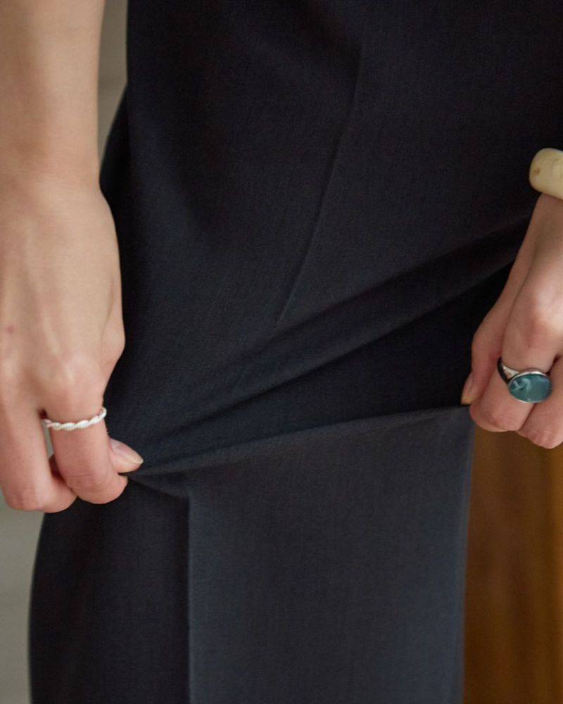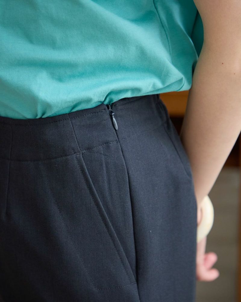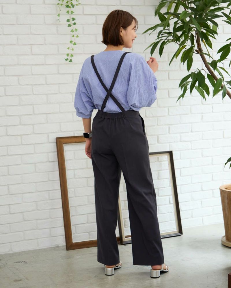 ほどよい弾力のある生地はダレず柔らかく裾が揺れ使い勝手も抜群。着脱自在のサスペンダーはウエスト裏の釦で調節が可能なため肩の食い込みを気にせずお召しいただけます。パンツ部分はストレートなシルエットとセンタープレスでハンサムな印象ですが左側のファスナーで着脱するためフェミニンな雰囲気もある1着。サスペンダーを下げたままTシャツやベストを着るスタイルも洒落感が増すのでお試しください。