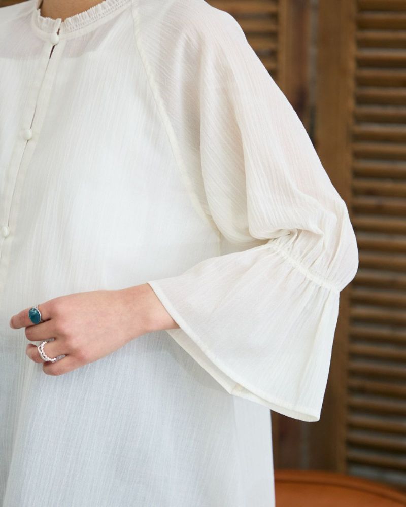 ちりめんのような細かいシボが広がるポリエステル素材を使ったブラウスです。生地の表裏がほのかにゆらぎ、肌との接点が少ないためサラッと涼しくお召しいただけます。フレアの入ったボディと袖口が風になびく様子もフェミニンで全体的にシアー感があるためインナーの着用がおすすめ。シャーリングを寄せた襟がポイントになり1枚着を楽しむ他、冷房や日除け対策の羽織りとしても便利です。 モデル身長: 167 cm 着用サイズ: M サイズ Golden Bear White Label (Ladies') ブラウス (Ladies') 【着用アイテム】468R4760 サスペンダーパンツ