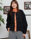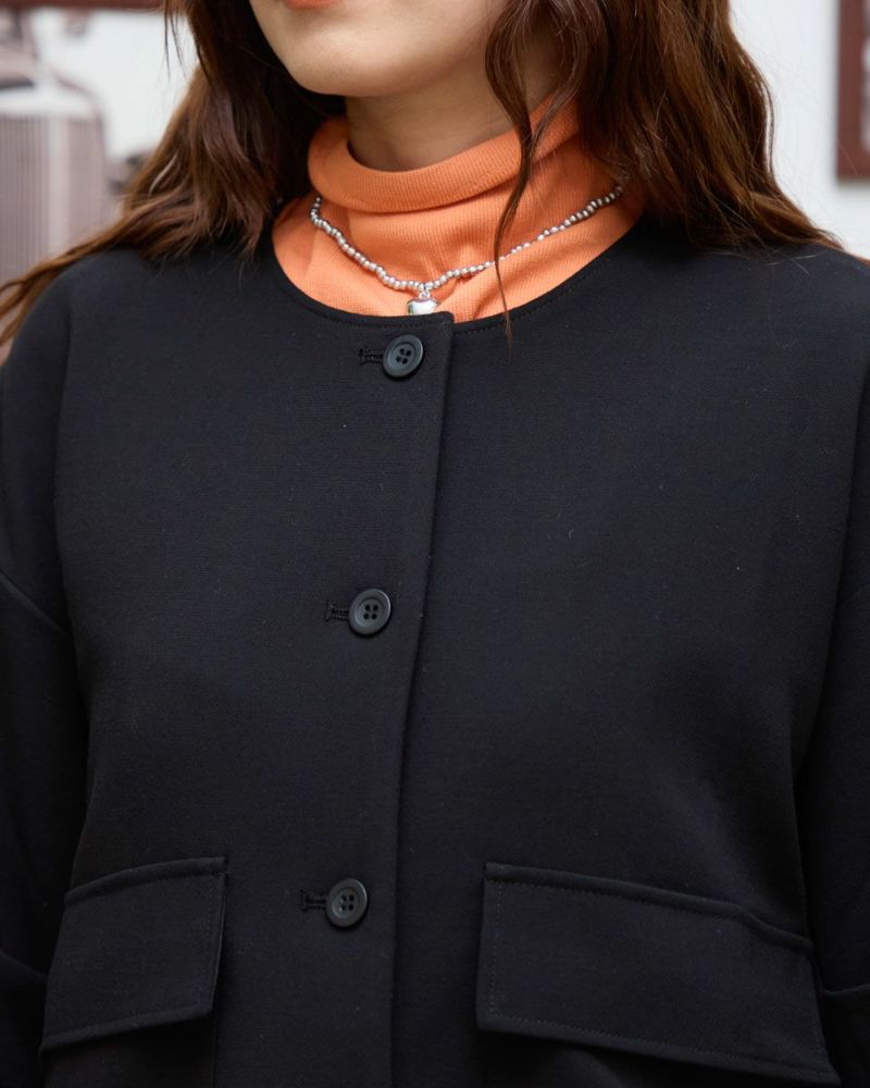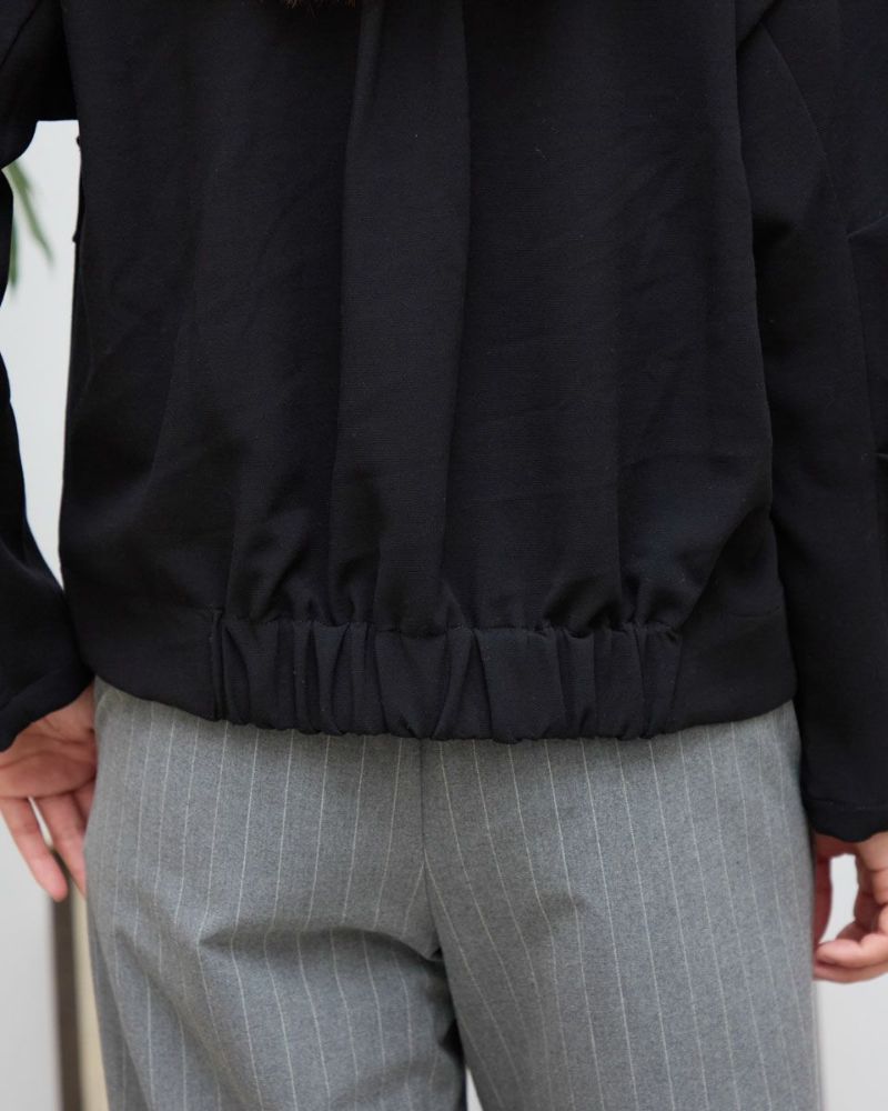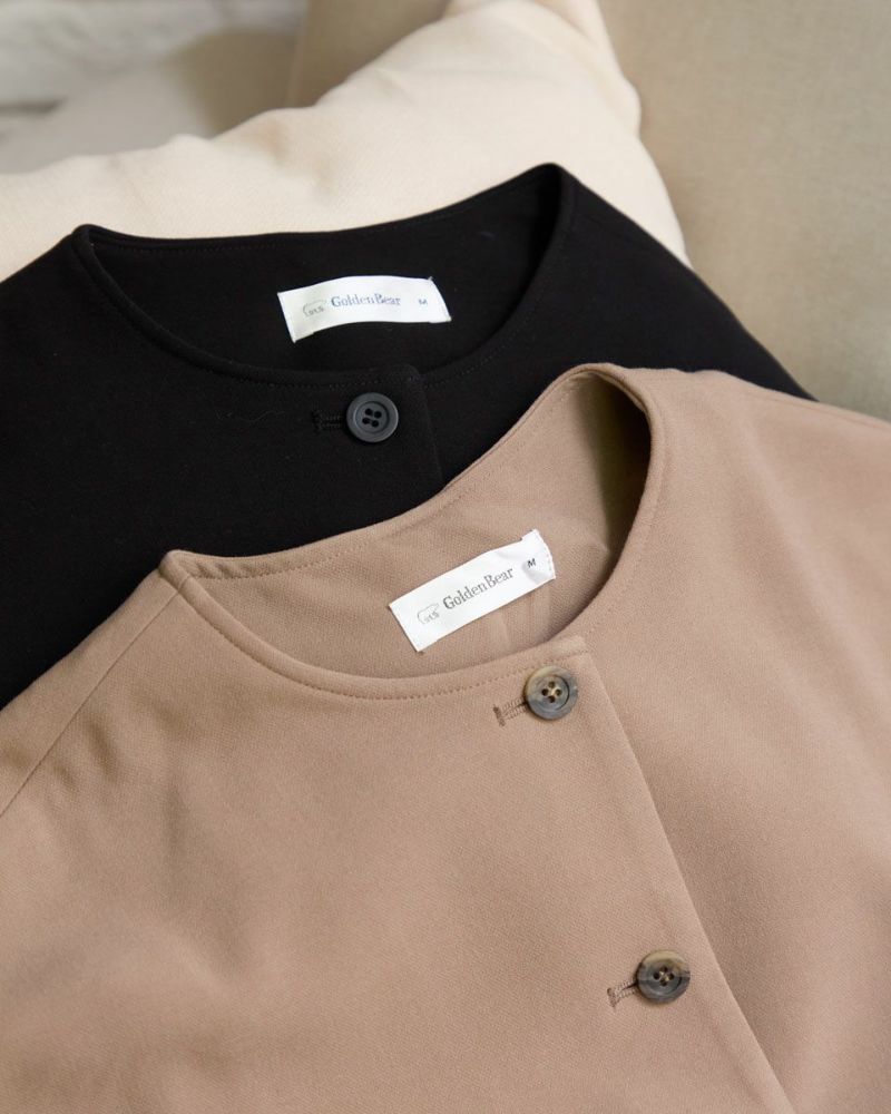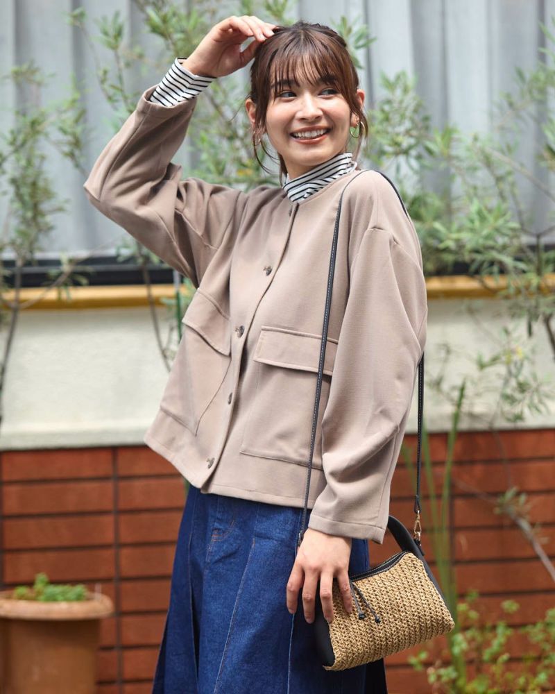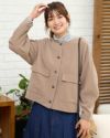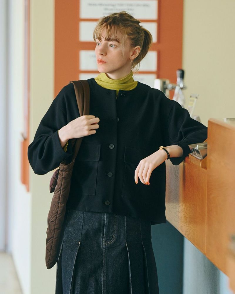 ほどよい肉厚感で保温性のある二重織りの生地を使ったブルゾン。短めの着丈でアクティブ感があり時流の着こなしをお楽しみいただけます。肘に施したタックがアクセントになり羽織るだけでサマになるアイテムです。コンパクトなネックラインがカジュアルさを抑えてくれるので釦をすべて閉じた着方も品がありおすすめです。キメの整った織り目の表面には毛羽感がないため、気温差のあるスイッチシーズンからお使いいただけます。他のアイテムと合わせやすいブラックとモカのカラー展開でオフィスやお子様の送迎での着用にもピッタリです。 モデル身長: 168 cm 着用サイズ: M サイズ Golden Bear White Label (Ladies') アウター (Ladies') 【着用アイテム】468RC460 タートルネック 468RC750 ストライプパンツ 468RC751 デニムスカート