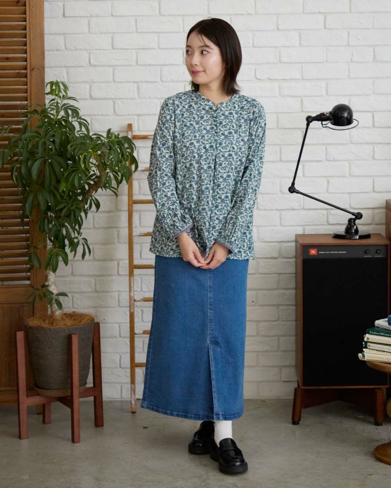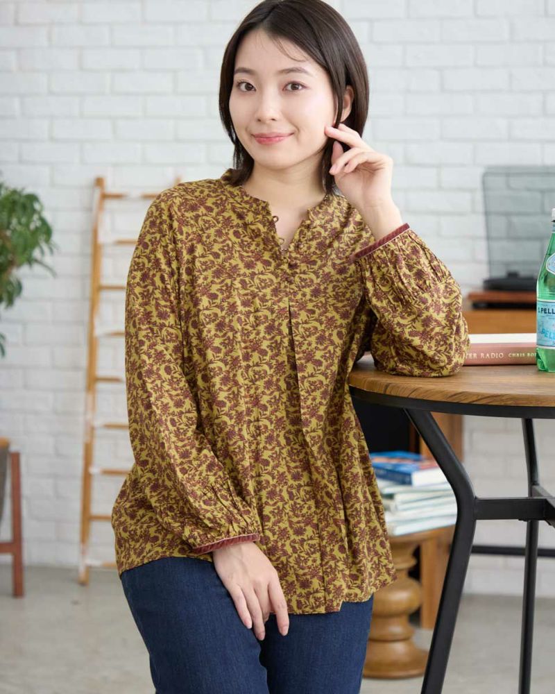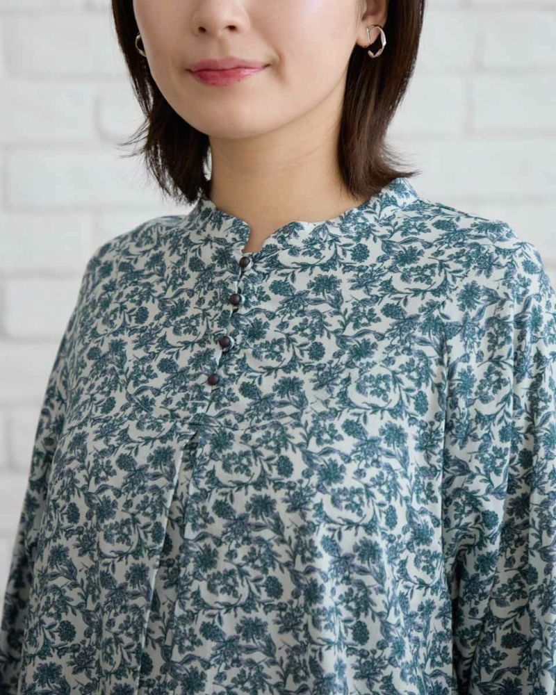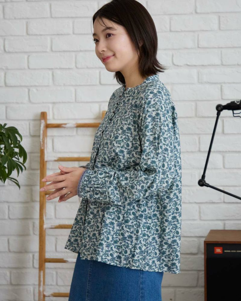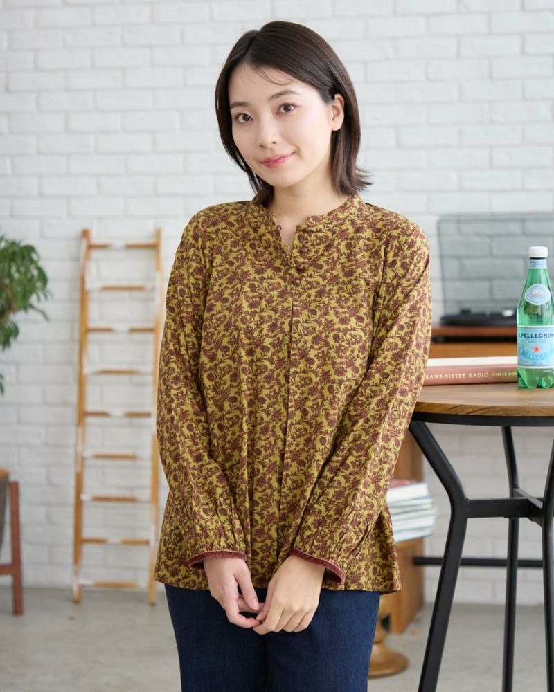 平織りの綿レーヨンを使ったブラウス。強張らず、しなやかに落ちるため上品な佇まいが魅力。フロントのヨークがポイントになりジャケットやジレを羽織るスタイルも素敵です。腰骨ほどの着丈はボトムスを選ばずデイリーに着用が可能。袖口にあしらったベロアがクラシカルに手元を映します。色の強さや儚さを重ねて表現したサンザシの柄をプリントしています。シックな中にも甘さがある大人のブラウス。海風が冷たい静かな青島の街。真っ赤な実が有名と、両手いっぱいにサンザシのお菓子を持たせてくれ、中国出張で触れ合った人たちとの思い出を込めたプリントです。