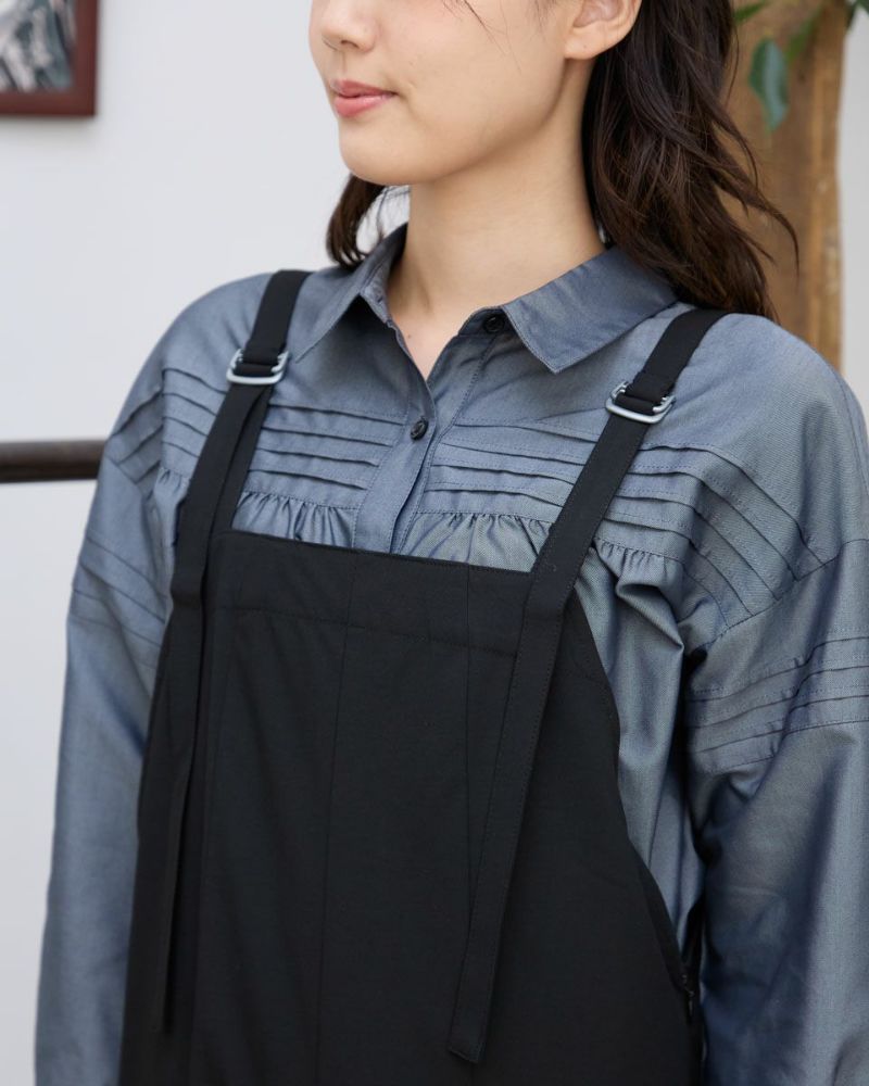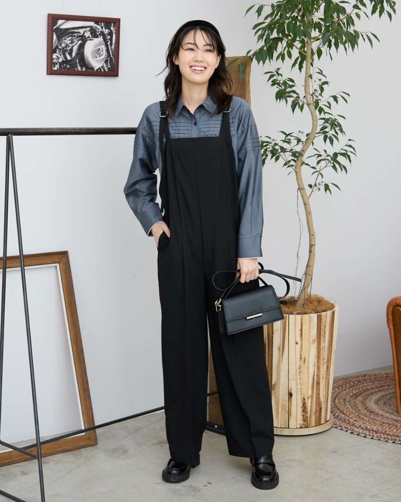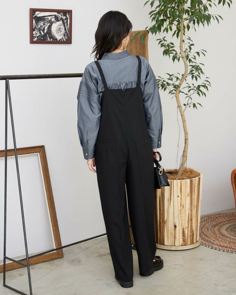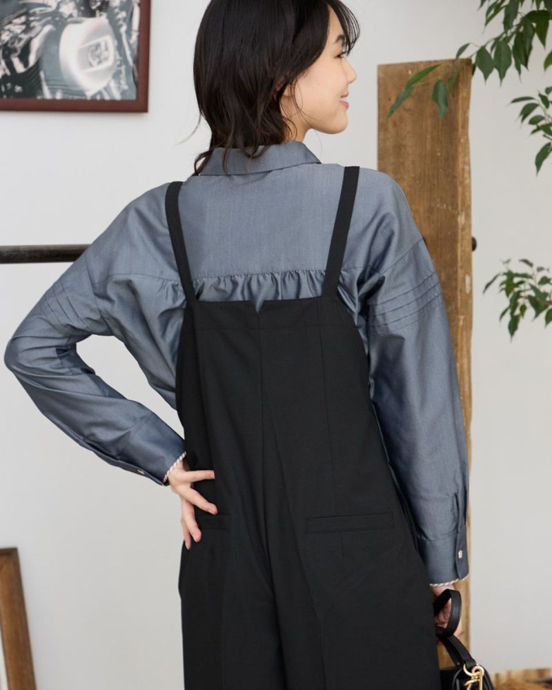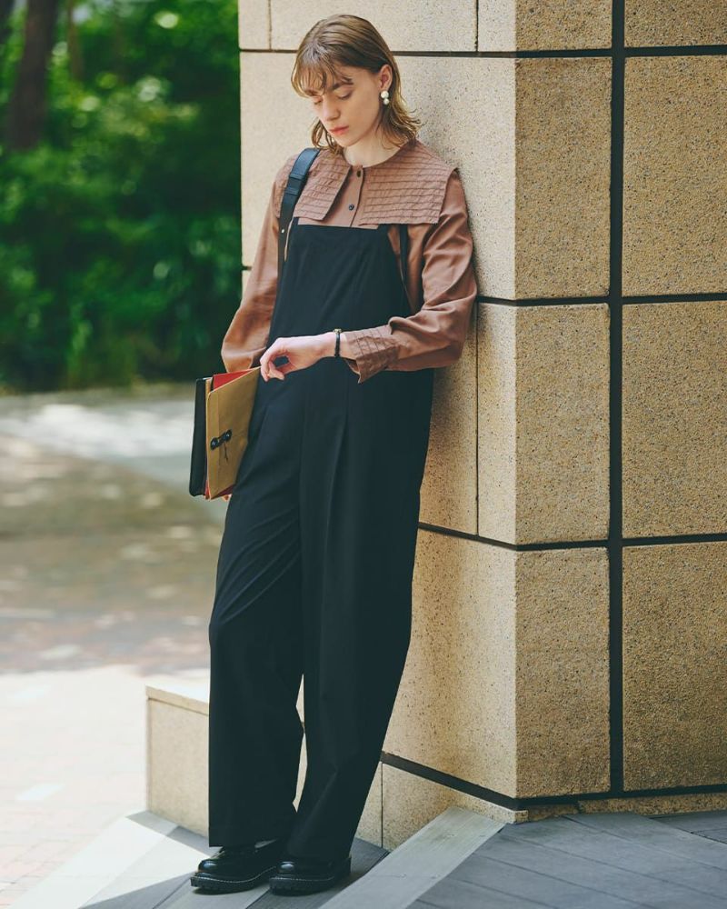 ほのかな光沢と整った織り目が上品な生地で仕上げたサロペット。トップの身頃幅をコンパクトにし、バストや背中が広く見えない工夫をしています。光を抑えたショルダーのメタルアジャスターには落ち着きがあり大人世代におすすめの1着。パンツ部分はほどよく揺れるストレートシルエットで、足のラインを拾わずスラックスのようなきちんと感があるため、オフィスや推し活での着用も素敵です。ブラウスやタートルカットソーなどインナーを選ばない優秀アイテム。ハンサムな雰囲気があるので一粒パールのピアスや指先のネイルで艶を足す着こなしもおすすめです。 モデル身長: 166 cm 着用サイズ: M サイズ Golden Bear White Label (Ladies') ブラウス (Ladies') 【着用アイテム】468RC360 シアーブラウス 468RC361 ピンタックブラウス 468RC450 クルーネックプルオーバー