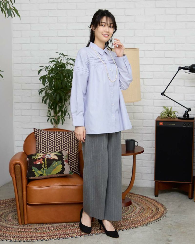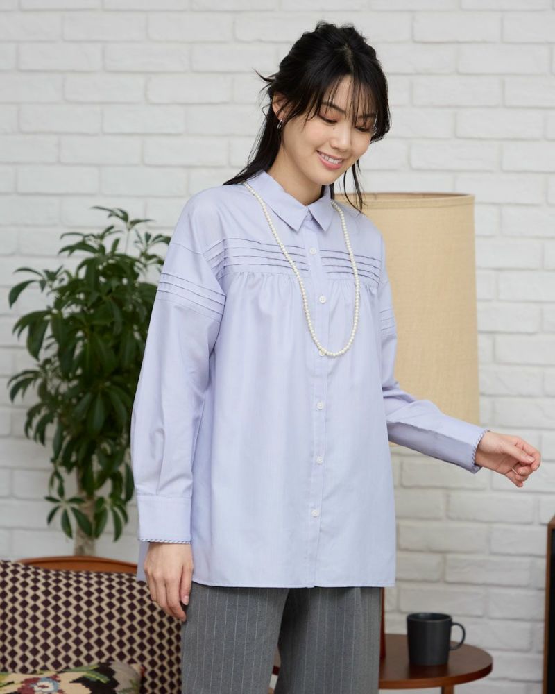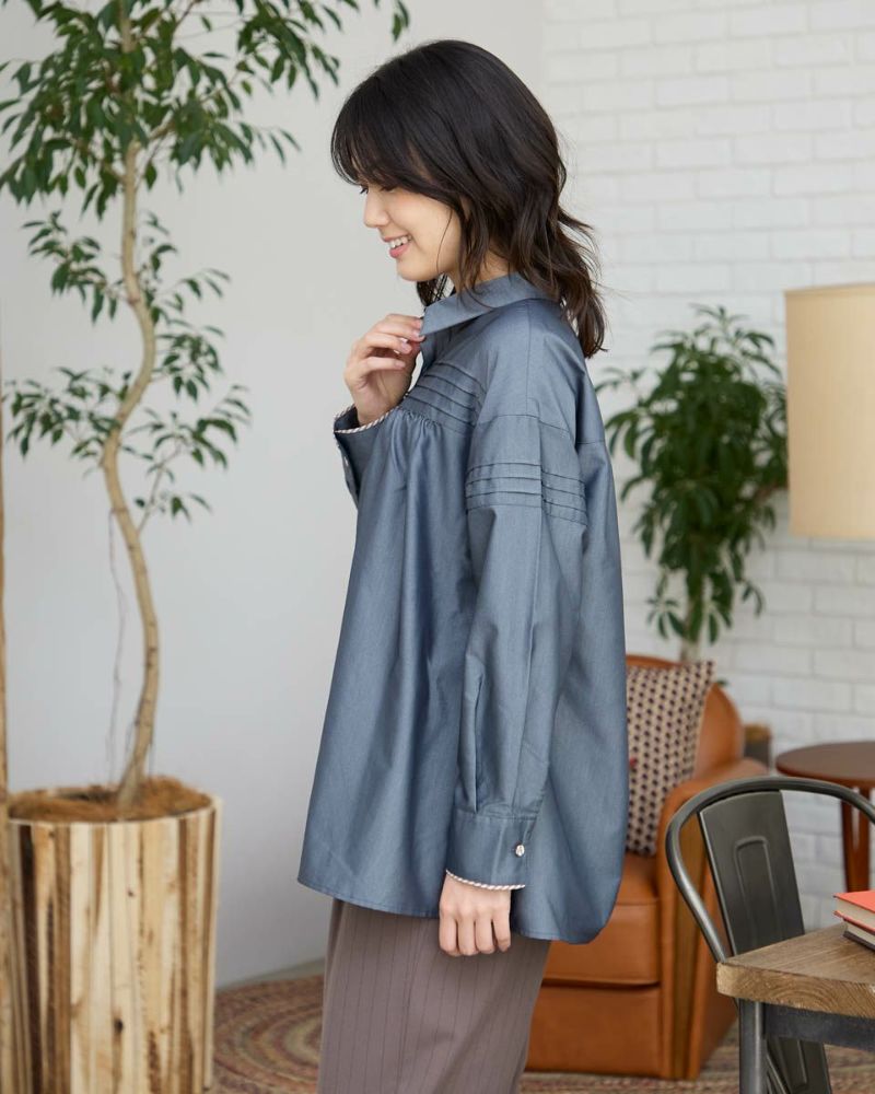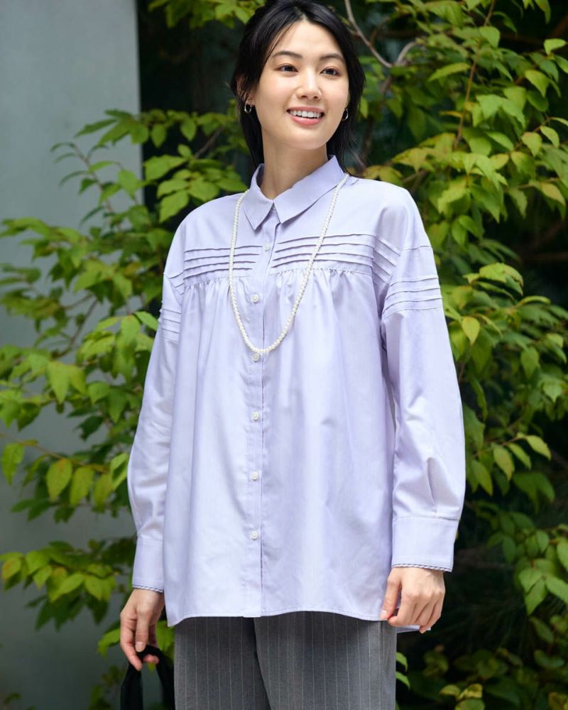 細かいツイルに織った生地は、ほのかなツヤ感でキレイ見え抜群なアイテム。しなやかさもあるため、強張りを気にせずお召しいただけます。白い糸を用いて織っているため発色も柔らかくベーシックカラーとも馴染みやすいです。フロントに施したピンタックに、ほどよい甘さと華やかさがあり1枚着もしっかりと担います。襟が付いていて、きちんと感もあるのでスラックスを合わせてオフィスや学校行事での着用も可能。寒さが増したら、トレンドのファーべストやローゲージのニットを重ねてカジュアルダウンしても可愛くておすすめです。