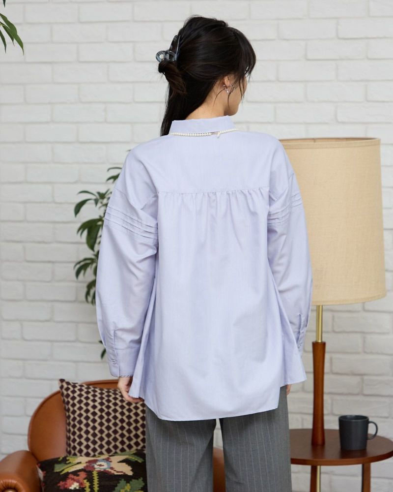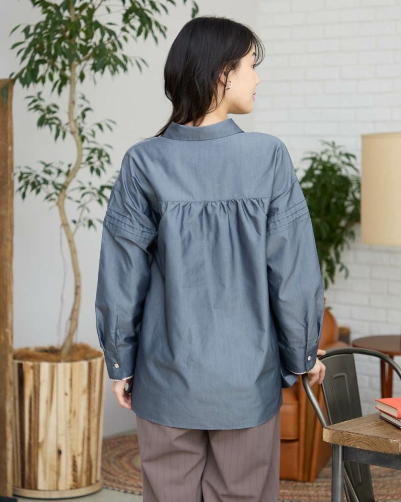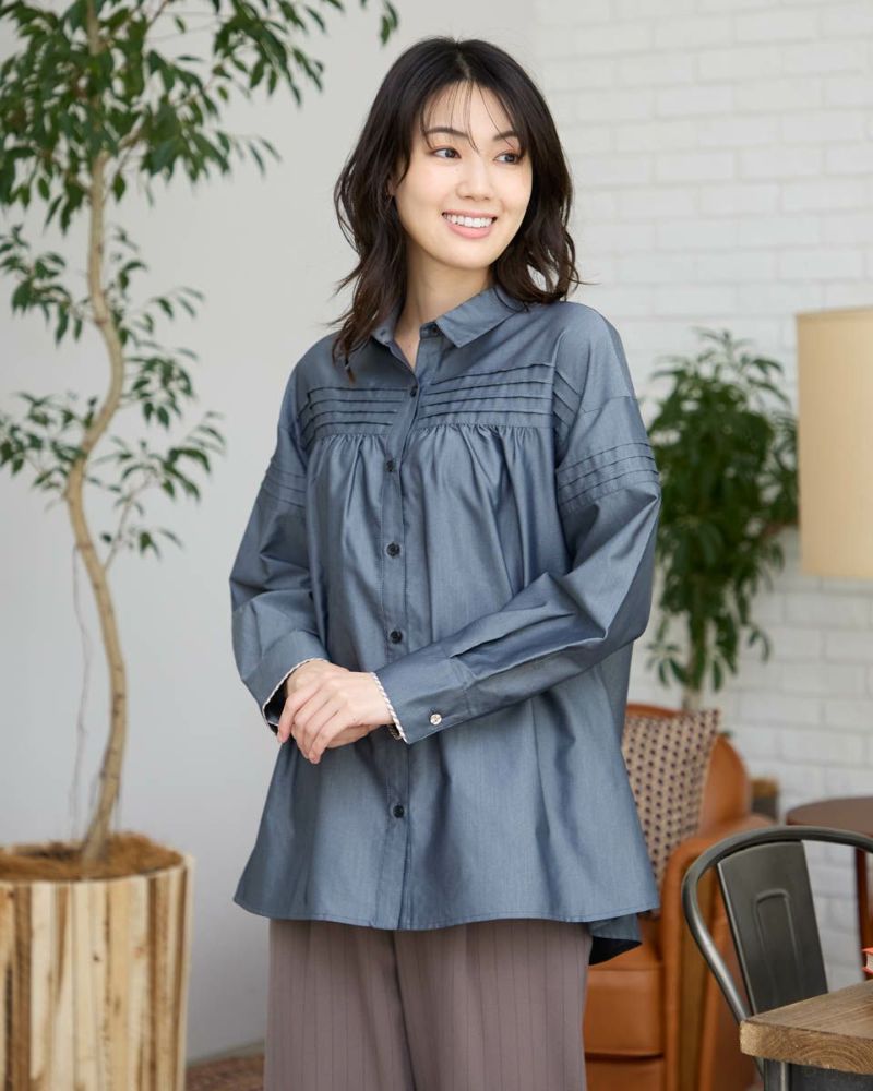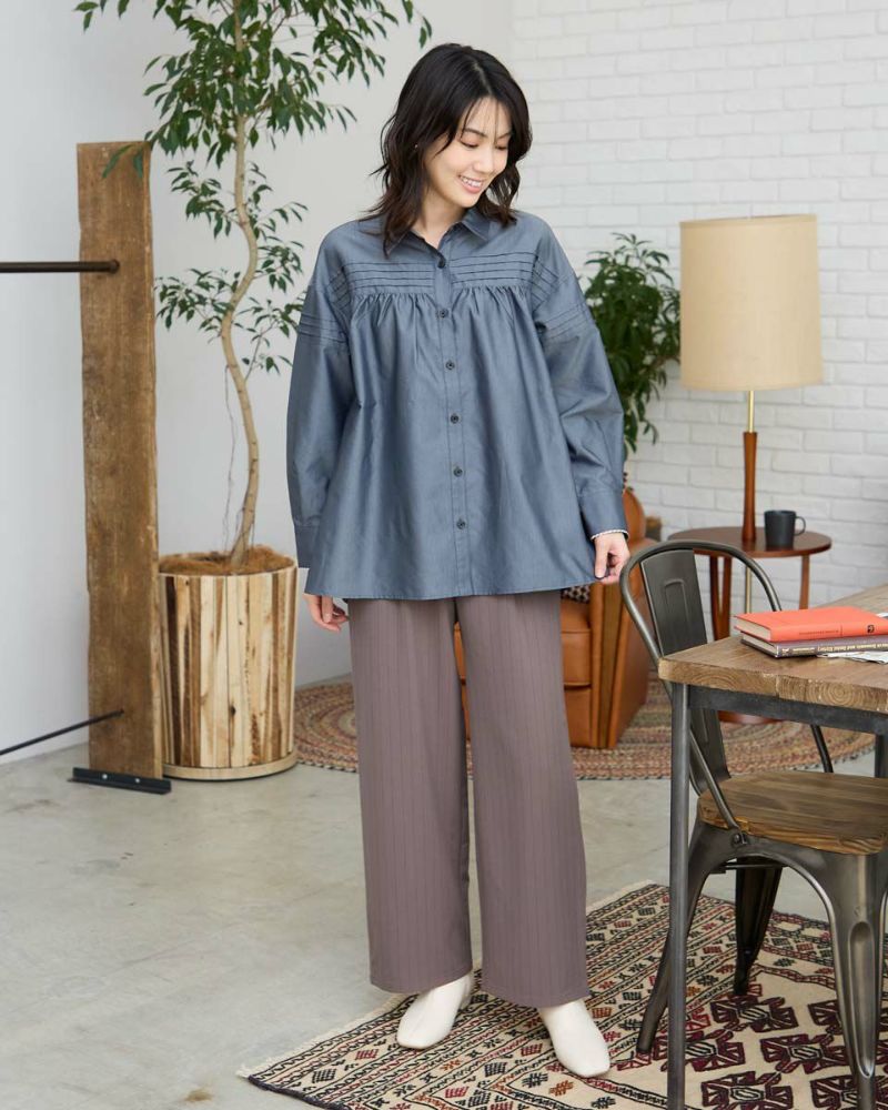 細かいツイルに織った生地は、ほのかなツヤ感でキレイ見え抜群なアイテム。しなやかさもあるため、強張りを気にせずお召しいただけます。白い糸を用いて織っているため発色も柔らかくベーシックカラーとも馴染みやすいです。フロントに施したピンタックに、ほどよい甘さと華やかさがあり1枚着もしっかりと担います。襟が付いていて、きちんと感もあるのでスラックスを合わせてオフィスや学校行事での着用も可能。寒さが増したら、トレンドのファーべストやローゲージのニットを重ねてカジュアルダウンしても可愛くておすすめです。