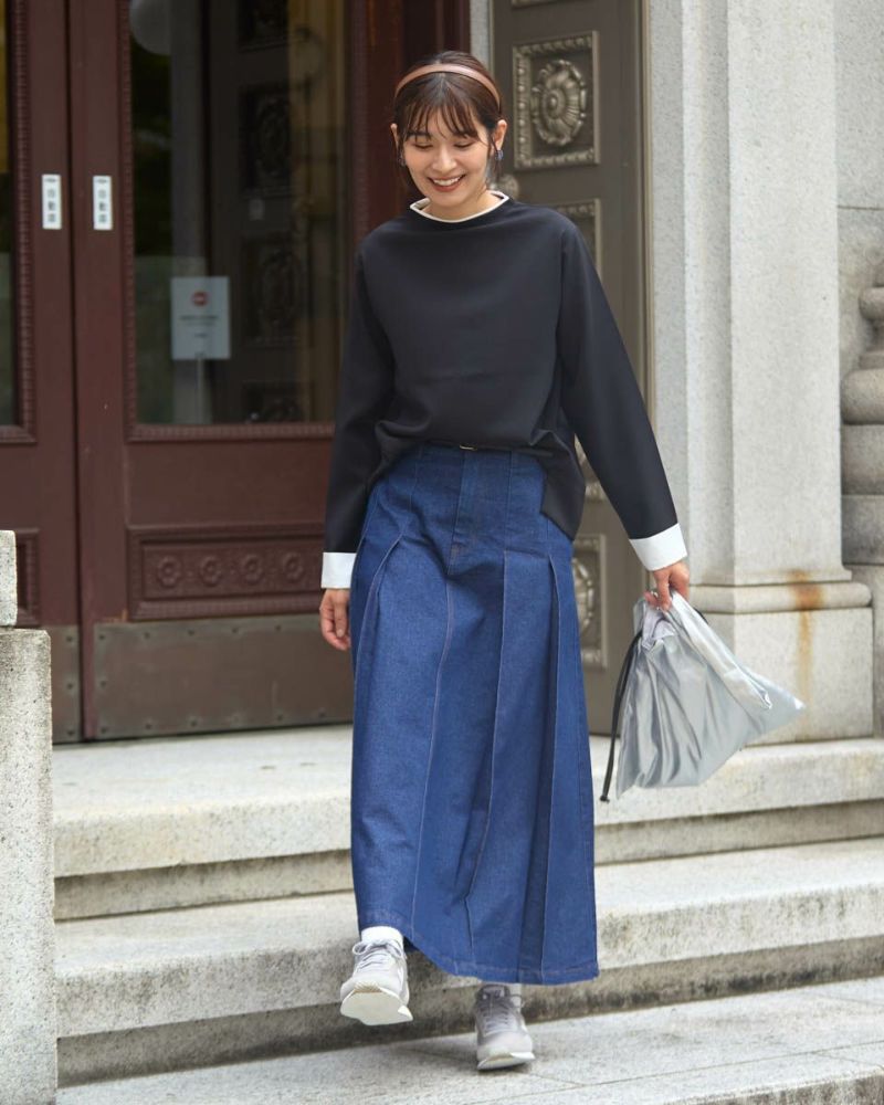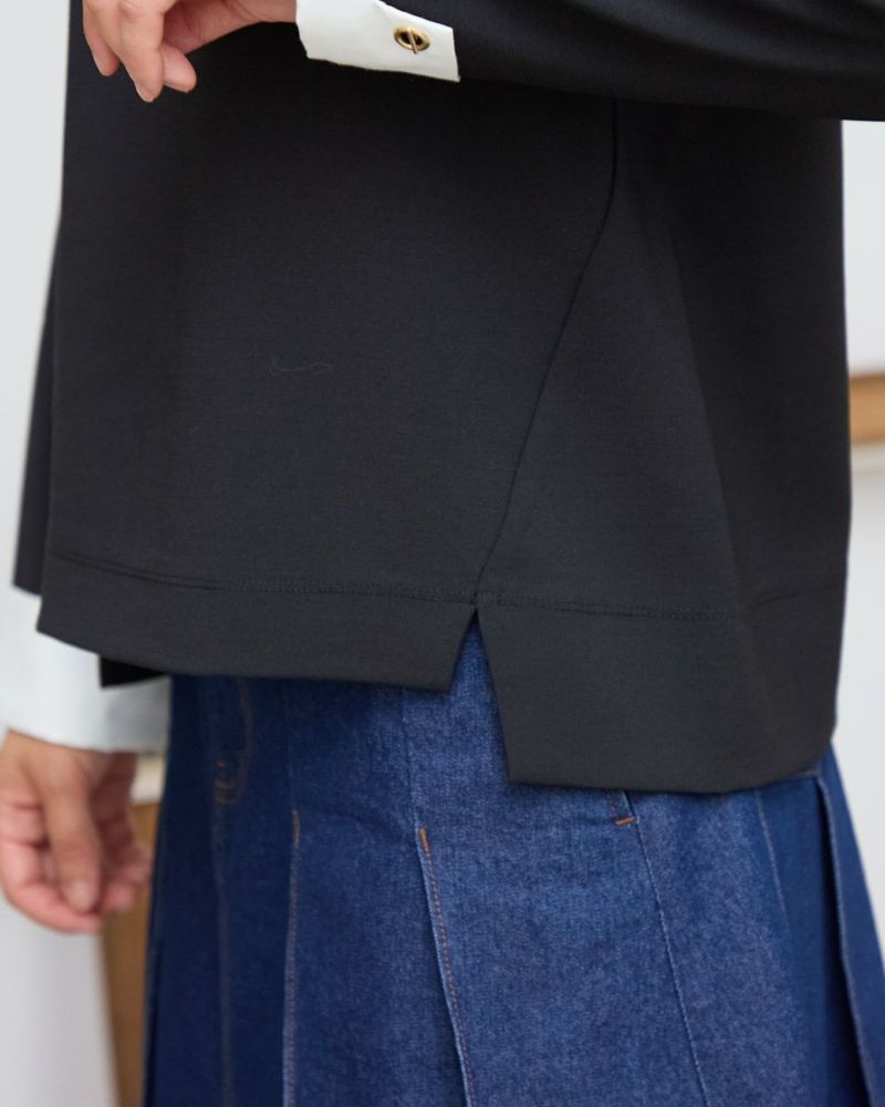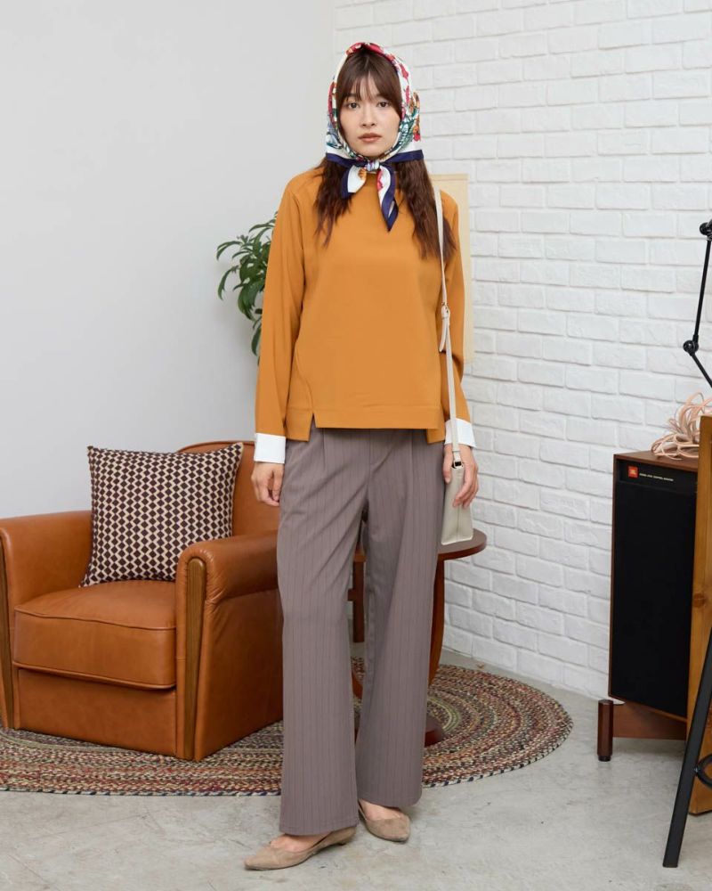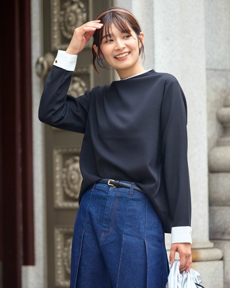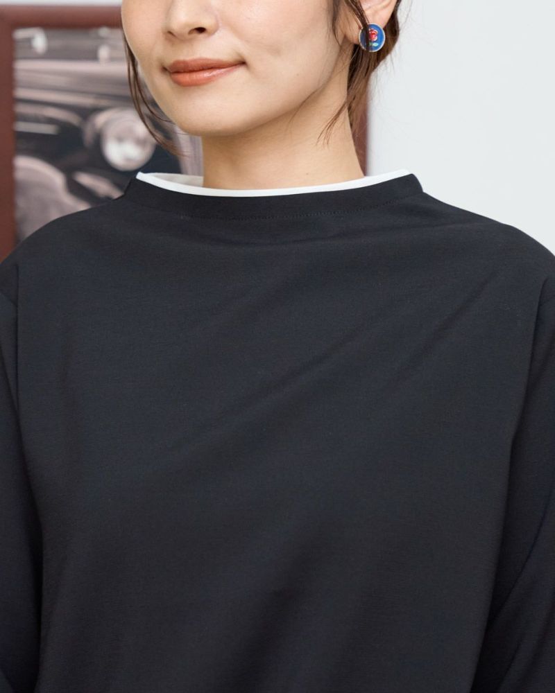 ほどよい厚みと弾力がある2重織りの素材をセレクト。ボディラインを拾わずダレにくいため清潔できちんとした印象のプルオーバー。Tシャツよりも肉厚で裏毛より薄手な生地感は1枚着の季節に便利。身頃から続きで立ち上げたボトルネックと袖口にあしらった別地がポイント。白いシャツを重ね着しているようなクラシックスタイルのアイテム。袖口のメタルチャームが光る様子も華やかなフェミニンさがありオフィスや握手会でお召しになっても素敵です。シックなブラックの使い勝手は抜群!オレンジも顔映りが良くトレンドのブラウンと相性がいいのでおすすめ。