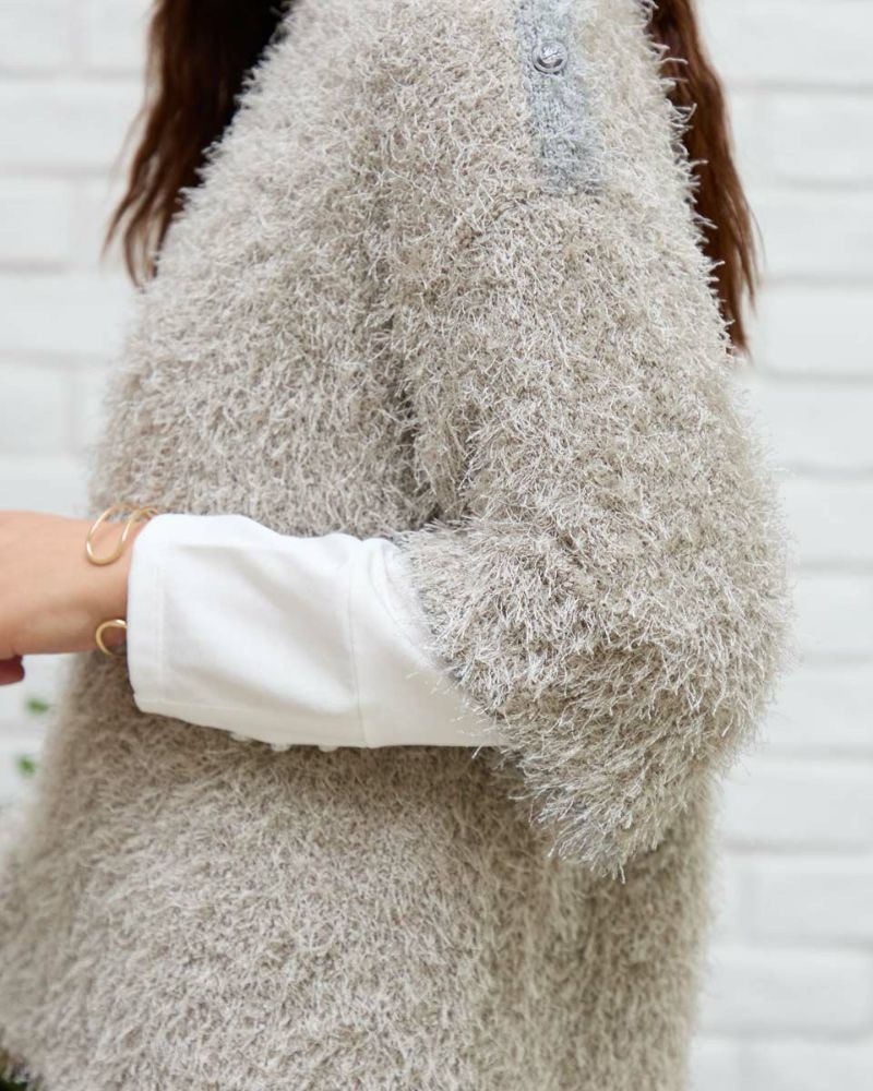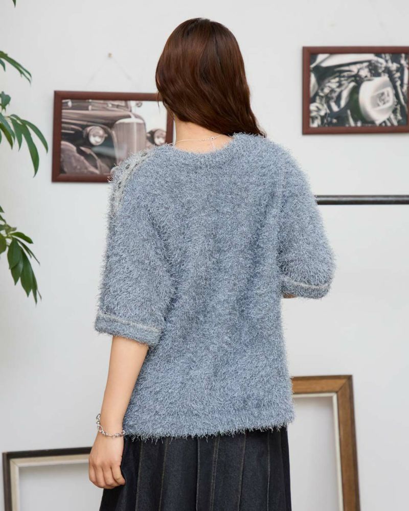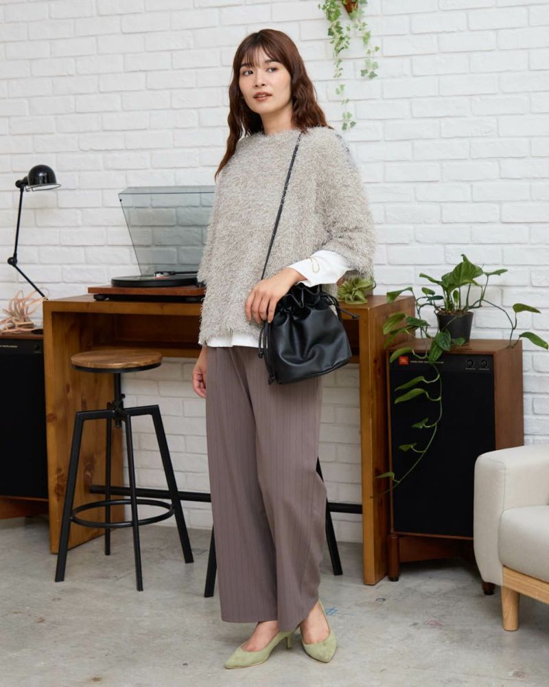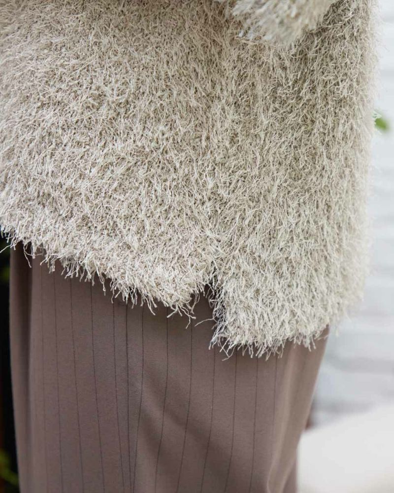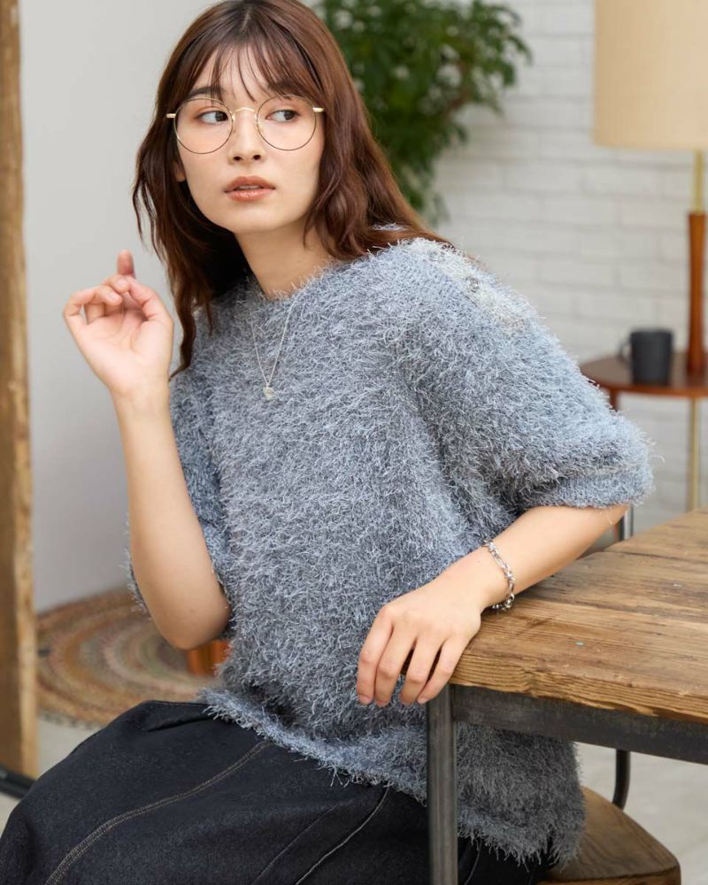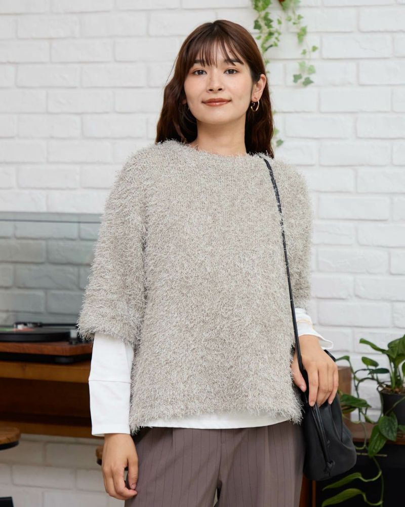 モジャモジャした長い毛羽が印象的なシャギーのニットプルオーバー。全身に1.5㎝ほど吹く糸には光沢があり暑苦しさが軽減されゴージャスな見た目が魅力です。肘にかかる袖丈で1枚着はもちろん、気温に応じてインナーにシャツやロンTを合わせる着方もおすすめ。ボクシー型で身体にフィットしすぎず、どんなボトムスとも好相性です。暑さの残るスイッチシーズンでの着用もお洒落ですが、年末年始の華やいだシーンでの着用も素敵です。モンスターのような雰囲気にチャーミングさがあるため経験をつんだ大人のお客様にこそ、お召しいただきたいアイテムです。 モデル身長: 168 cm 着用サイズ: M サイズ Golden Bear White Label (Ladies') ニット (Ladies') 【着用アイテム】468RC450 クルーネックプルオーバー 468RC750 ストライプパンツ 468RC751 デニムスカート