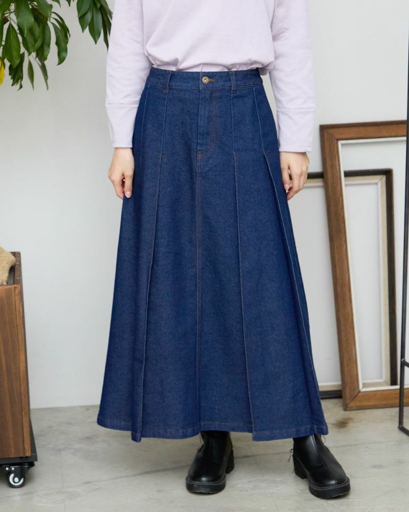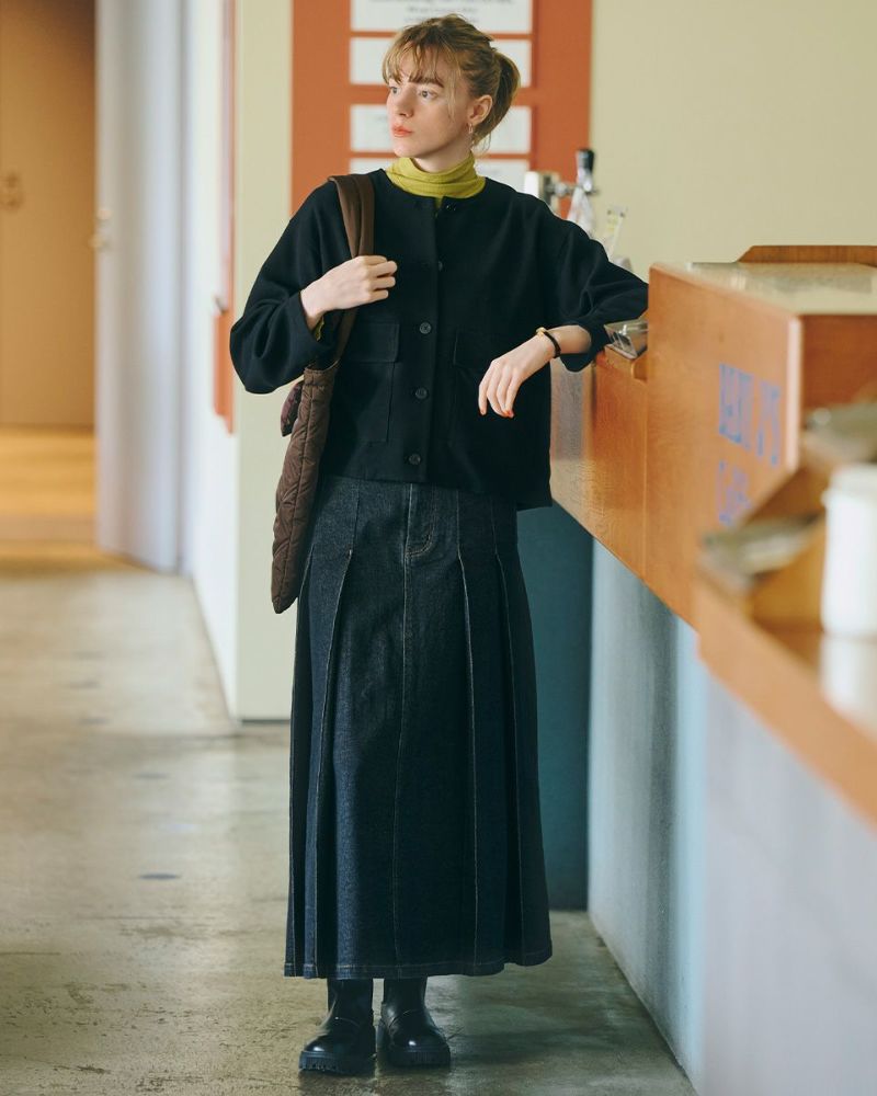 ヨコ糸に伸縮性のある糸を用いたデニムを使用。ほどよい厚みはシルエットが崩れにくく、下着のラインもひびきにくい事など女性にとっても嬉しい点が多い8.5オンスをセレクト。腹部から裾へ施された太い幅のプリーツがポイントです。ミモレ丈でプリーツがゆっくりと揺れる様子はスクール感が薄れ、カラーソックスやローファーを合わせたトラディショナルなスタイルも上品にまとまります。ブラックカラーはモード感があるため、ブーツで足元に重心を置いたスタイルも素敵です。トレンドの短丈アウターとも相性も抜群です。 モデル身長: 166 cm 着用サイズ: 64 サイズ Golden Bear White Label (Ladies') ボトムス (Ladies') 【着用アイテム】468RC450 クルーネックプルオーバー 468RC451 ラッフルパーカ 468RC460 タートルネック 468RC650 シャギーニットプルオーバー 468RC160 ショートジャケット 468RC751 デニムスカート