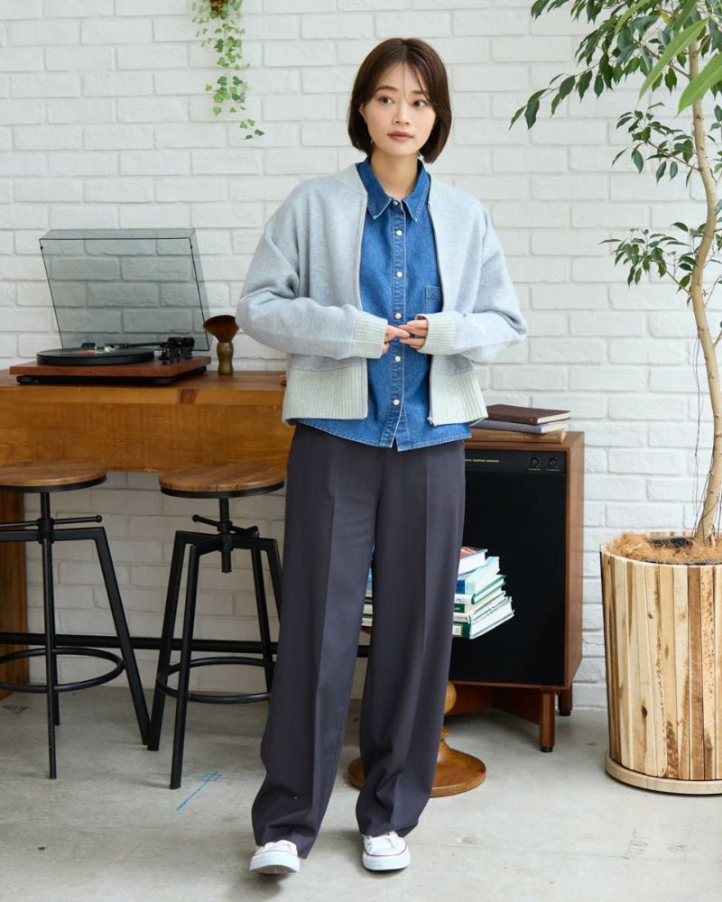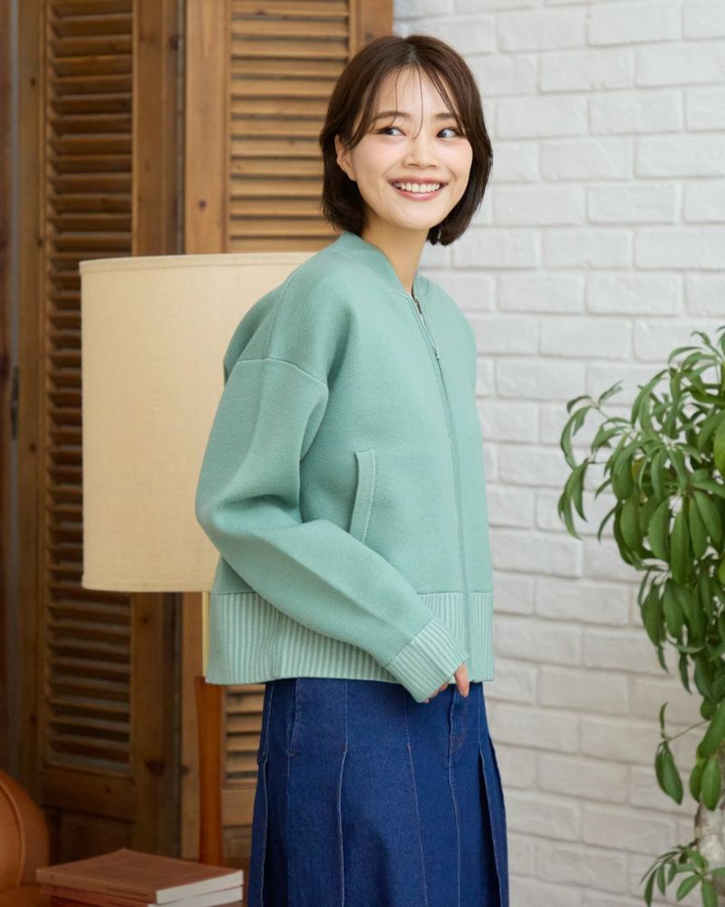 アメリカ空軍のフライトジャケット、MA-1をイメージしたニットブルゾン。ダブルフェイスの整った編地は毛羽も少なく程よい弾力でキレイめな1着。普段のコーディネートに馴染むよう上腕部のシガーポケットはなくしました。部屋着っぽくならないよう、2枚袖の切り替えや短丈のディティールでアクセントを付けています。実際のモデルをオマージュし、馴染みカラーで裏面を配色。ソフトなボディカラーで色みがクリアになる2月頃まで着用が可能。着丈が短いため座った時に裾を巻き込みにくく車移動の多い方やデスクワークでの羽織りにも便利です。