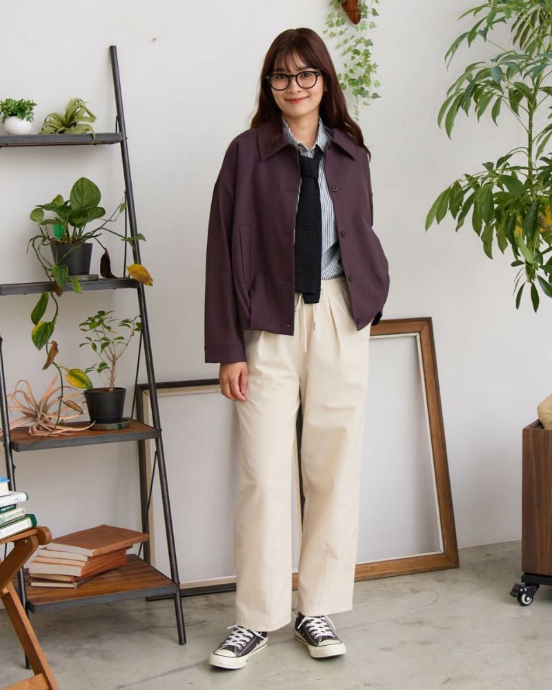 ほのかに光沢のあるツイルを使ったシャツジャケット。平織りに比べ糸の交差する点が少なく柔軟性に富んでいますが、適度にハリがあるためダレず清潔にお召しいただける1着。大きな襟先がチャーミングで顔周りに華やかさをプラス。潔く短くした着丈が幼さを消し、コーディネートのハズシに使える洒落たアイテムです。ロンTやサロペットに羽織るスタイルも素敵ですが、釦を閉じスラックスやバレル型のボトムスと合わせたメンズライクな着こなしも裾のタックが利きおすすめ。秋冬シーズンは、リップやレザー小物でツヤを加えたワーキングウーマンのようなスタイリングもお試しください。