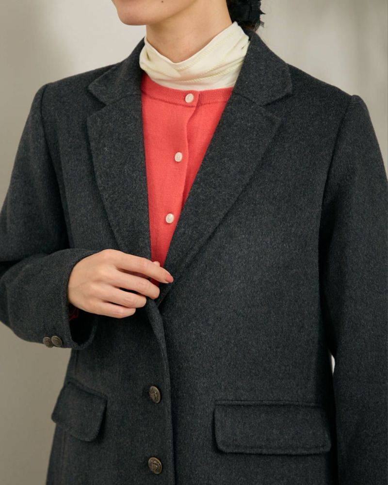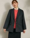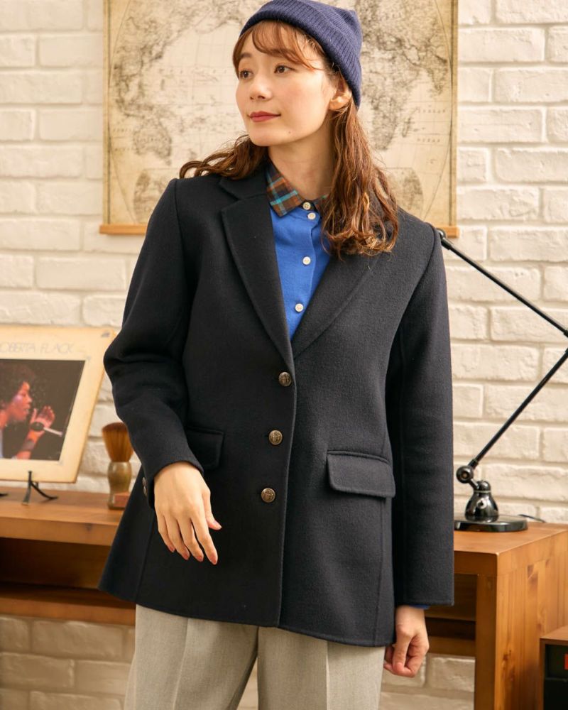 ウール混の二重織素材を使用し、一枚仕立てに仕上げたテーラードジャケットです。(二重織とは:2枚の生地を重ねて1枚に仕上げる織り方の事です。コートやタオル等ふわふわとした素材の物に使われる事が多く、柔らかさと保温性の高さが特徴です)アンティックゴールドの釦がポイントで、同色染をしたベーシックな釦も1セット付けていますので、お好みで釦をアレンジできます。袖のみ滑りが良い様に裏地を付けています。色はトップグレーとネイビーの2色です。 モデル身長: 171 cm 着用サイズ: M サイズ Jack Nicklaus (Ladies') アウター (Ladies') 【着用アイテム】467QC411 タートルネックTシャツ 467QC610 カーディガン 467QD331 チェックシャツ 467QC712 スカート 468QD750 ストレートパンツ