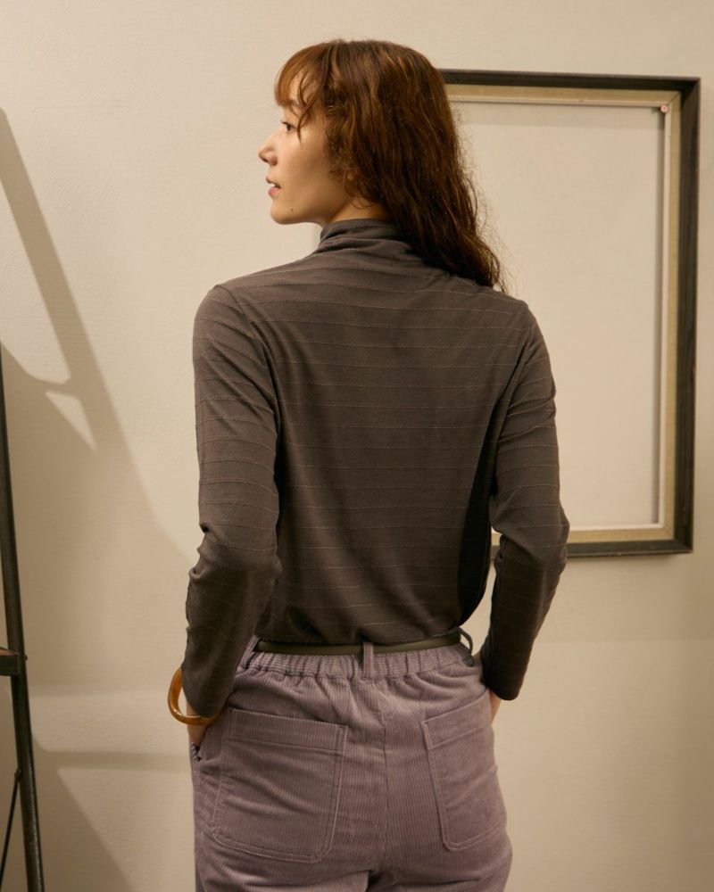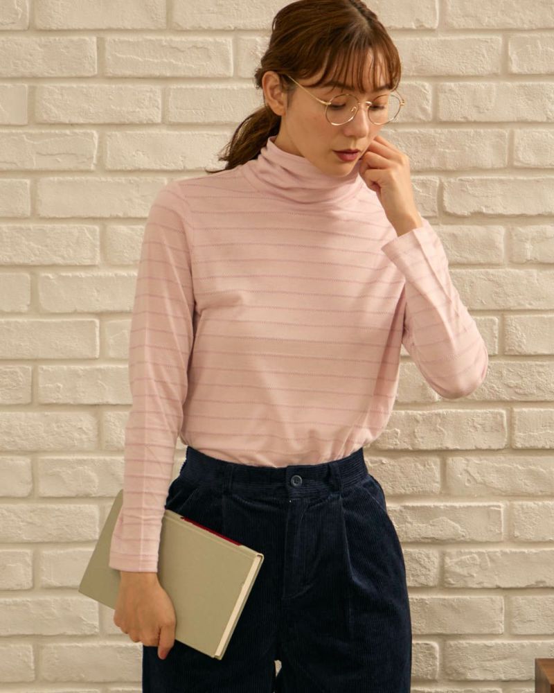 吸湿発熱機能がついたジャカードボーダーの素材を使用したタートルネックTシャツ。インナーに着用しやすいカラーを4色展開で作りました。ボーダー柄も控えめですがよく見るとカラー糸を2色使用した凝ったデザインです。タートルネックですが、ゆったりとした襟周りで圧迫感なく着用できるのもポイントです。 モデル身長: 171 cm 着用サイズ: M サイズ Golden Bear QUEEN SIZE(Ladies' 大きいサイズ ) カットソー (Ladies') 同デザイン通常サイズはこちら