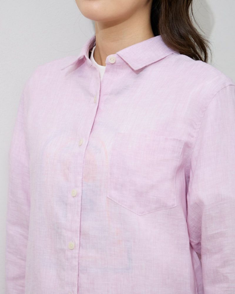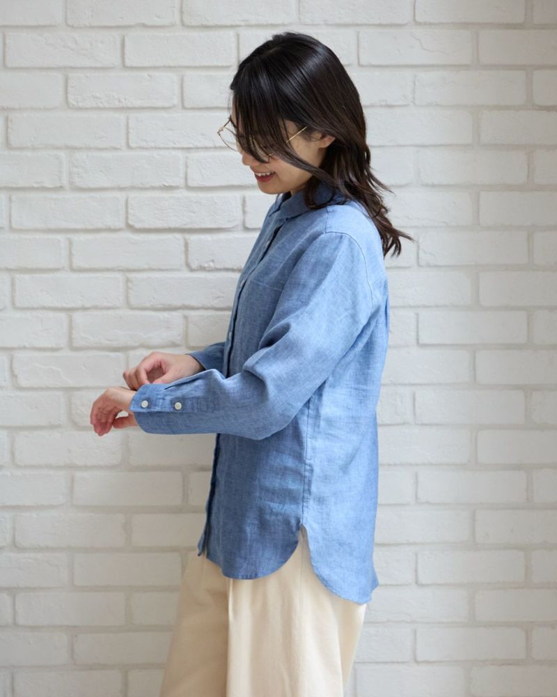 上質なフレンチリネンで仕立てた、イージーケアのシャツ。リネンならではの清涼感とナチュラルな風合いが魅力です。シワになりにくく、アイロンなしでも自然なニュアンスを楽しめるので、日常使いはもちろん旅先でも重宝します。ベーシックなサイズ感はトレンドに左右されず長く愛用できる一着。羽織りとしても、一枚着としても、様々な着こなしに対応してくれるので、スタイリングの強い味方に!メンズと同素材で展開しているので、リンクコーディネートも楽しめます。優しいナチュラルな色合いもおすすめしたいポイントです。