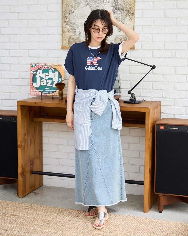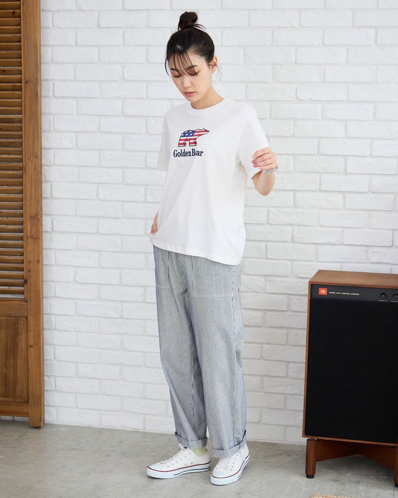 オーガニックコットン100%の星条旗デザインのGOLDEN BEARプリントTシャツです。ブランドロゴはフロッキープリントでアレンジしています。セットインスリーブですが、窮屈にならないシルエットで作りました。 モデル身長: 166 cm 着用サイズ: M サイズ Golden Bear QUEEN SIZE(WOMEN 大きいサイズ ) カットソー (WOMEN) 同デザイン通常サイズはこちら