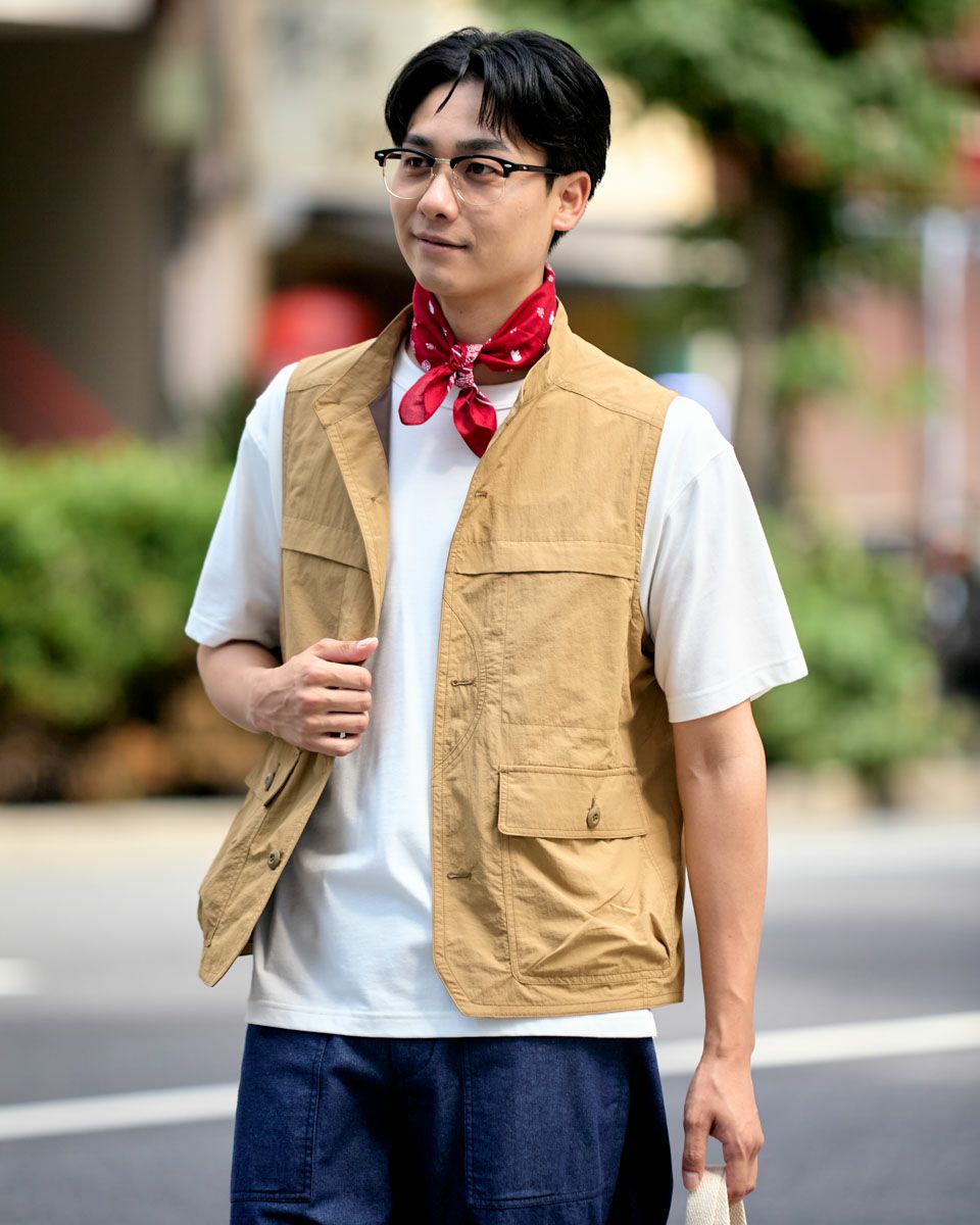 ナイロン素材を使用したスタンドカラーベストです。胸の隠しポケットや、腰のフラップポケットなど収納力の豊富さが特徴です。カジュアルシャツやTシャツなどと合わせたスタイリングをお楽しみください。 モデル身長: 180 cm 着用サイズ: L サイズ Golden Bear MEN アウター (MEN) 【着用アイテム】314QA030 ハット 314Q4530 リンガーTシャツ 314QB430 ボーダーTシャツ 314Q5711 ハーフパンツ 314QA701 ハーフパンツ