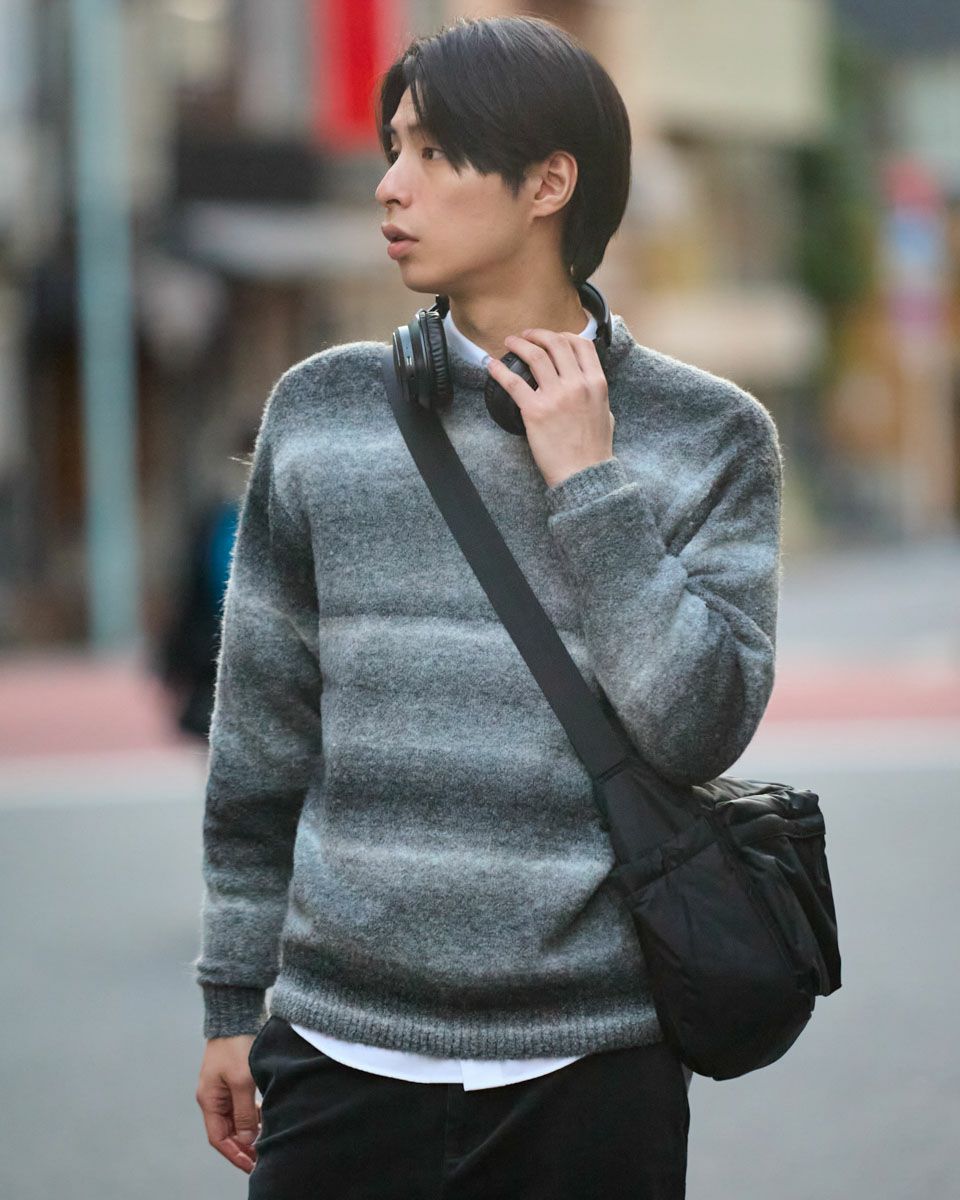 リラックスシルエットのボーダークルーネックニットです。1本の糸をグラデーションカラーで染め分けした、かすり染めの糸を使用しています。一枚ずつ色の出方や表情が異なります。もっちりとした弾力性のある触感で柔らかく、着心地のよさが特徴です。ご家庭での手洗い洗濯が可能です。 モデル身長: 180 cm 着用サイズ: L サイズ Golden Bear MEN ニット (MEN) 【着用アイテム】314RC230 オックスシャツ 314RE225 ストライプBDシャツ 314RE721 ストレッチコーデュロイパンツ 314RE722 ストレッチスリムイージーパンツ
