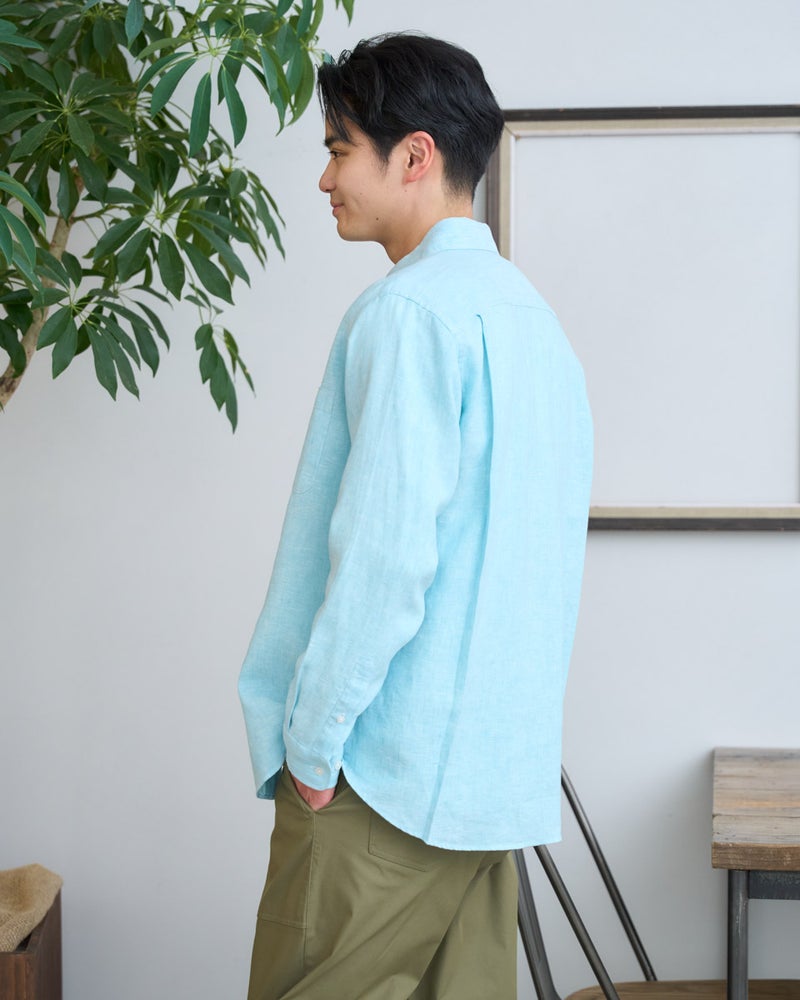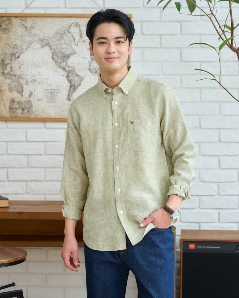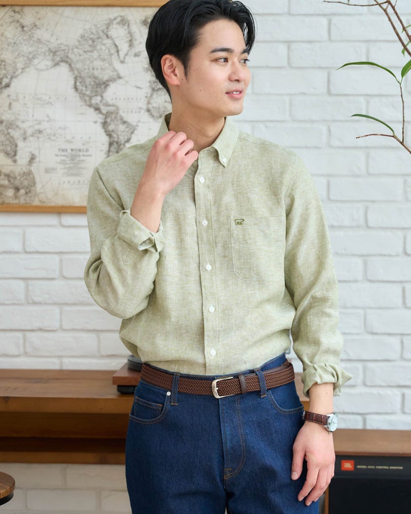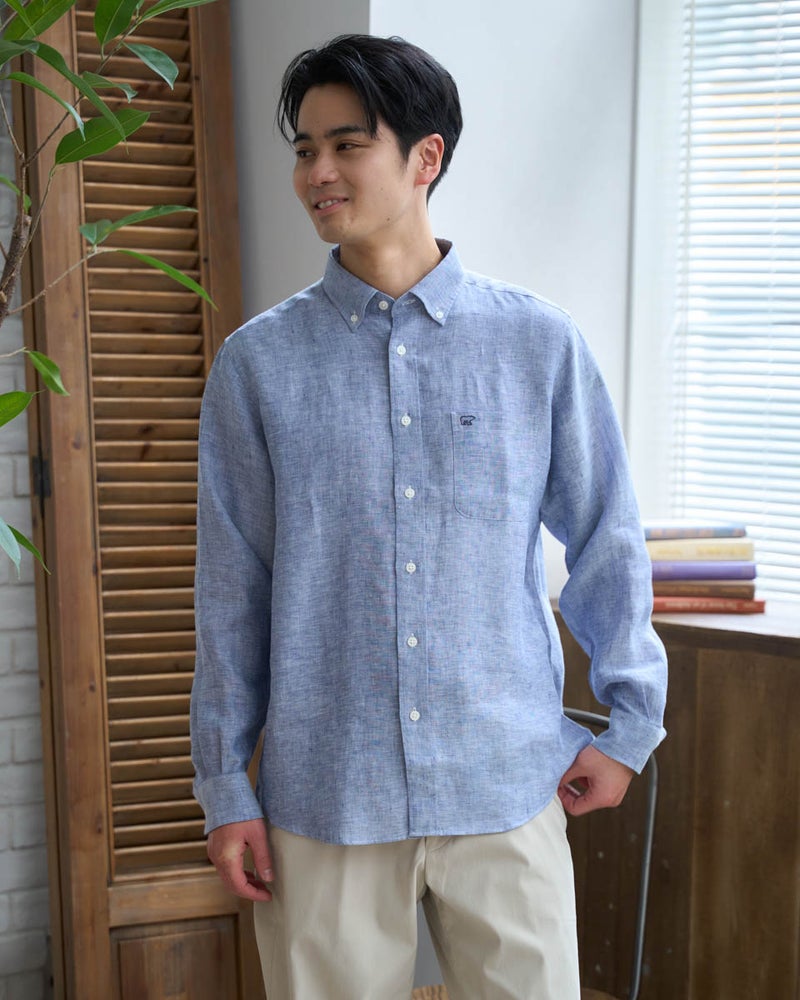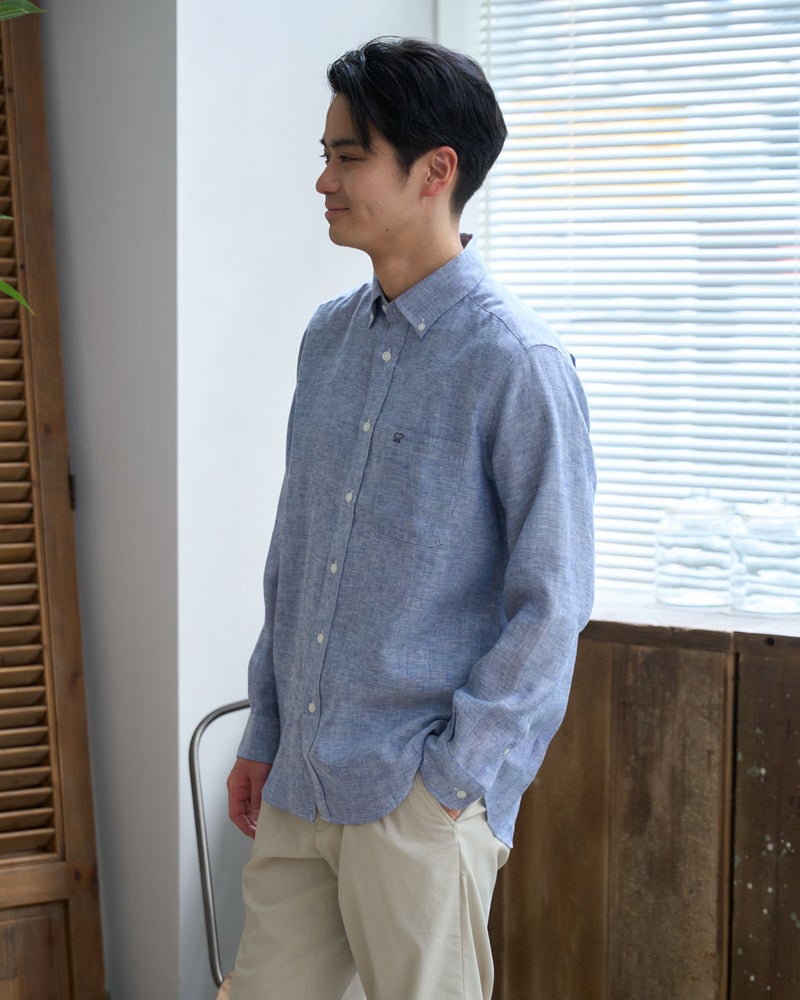 シワになりにくいフレンチリネン100%を使用したボタンダウン襟シャツです。柔らかな肌触りと通気性に優れているのが特徴です。イージーケア性に優れており、アイロンがけをしなくてもシワを気にすることなく着用いただけます。