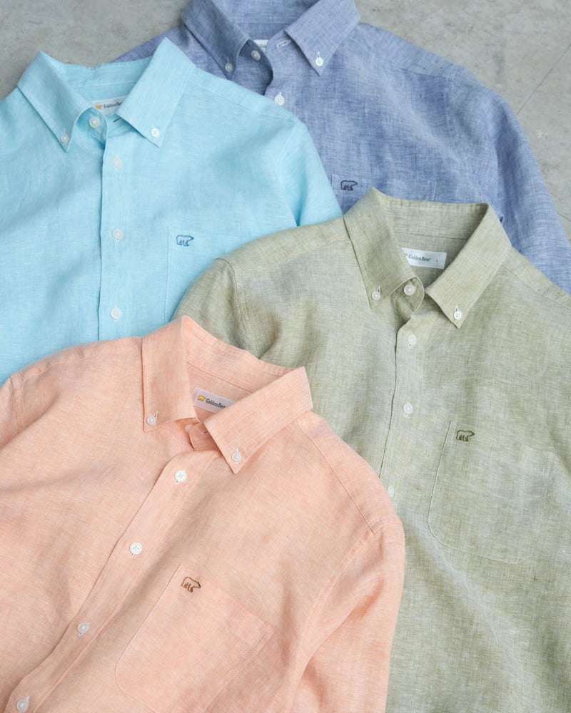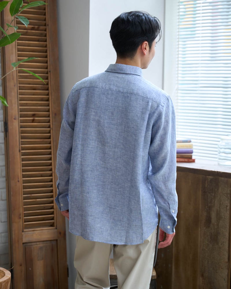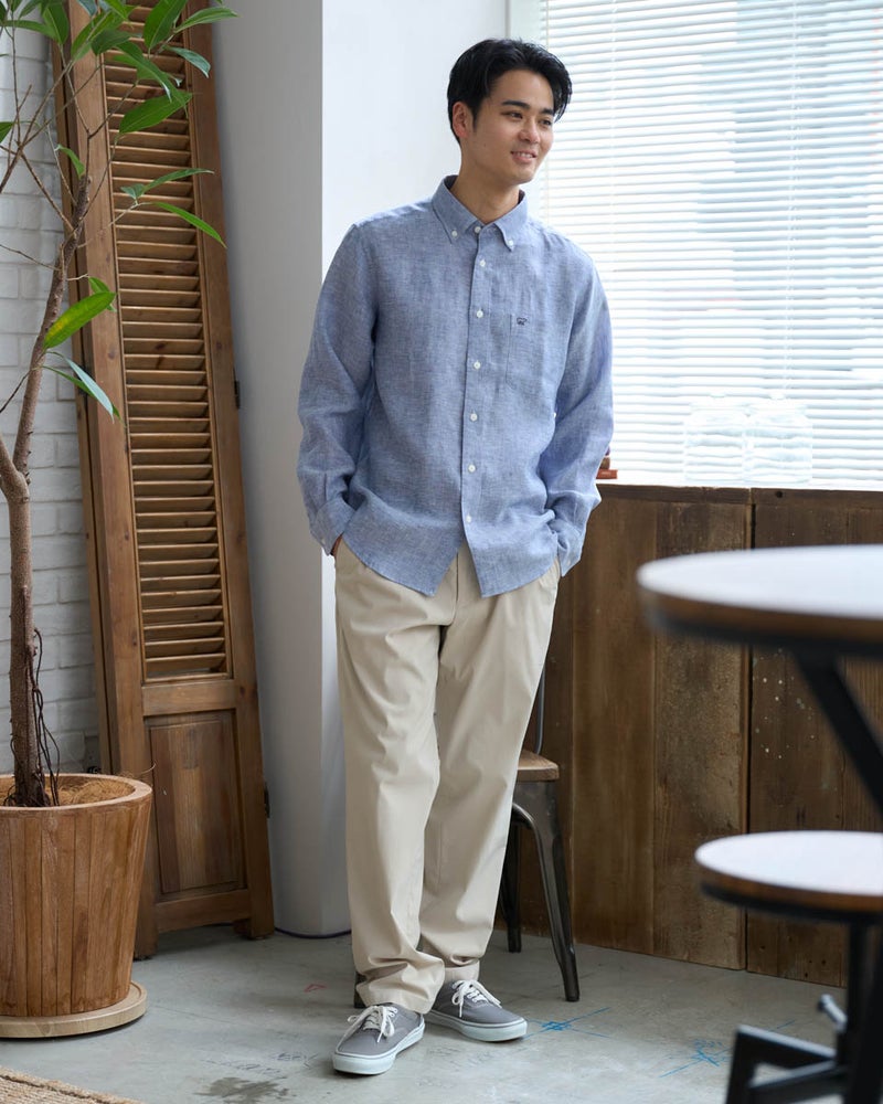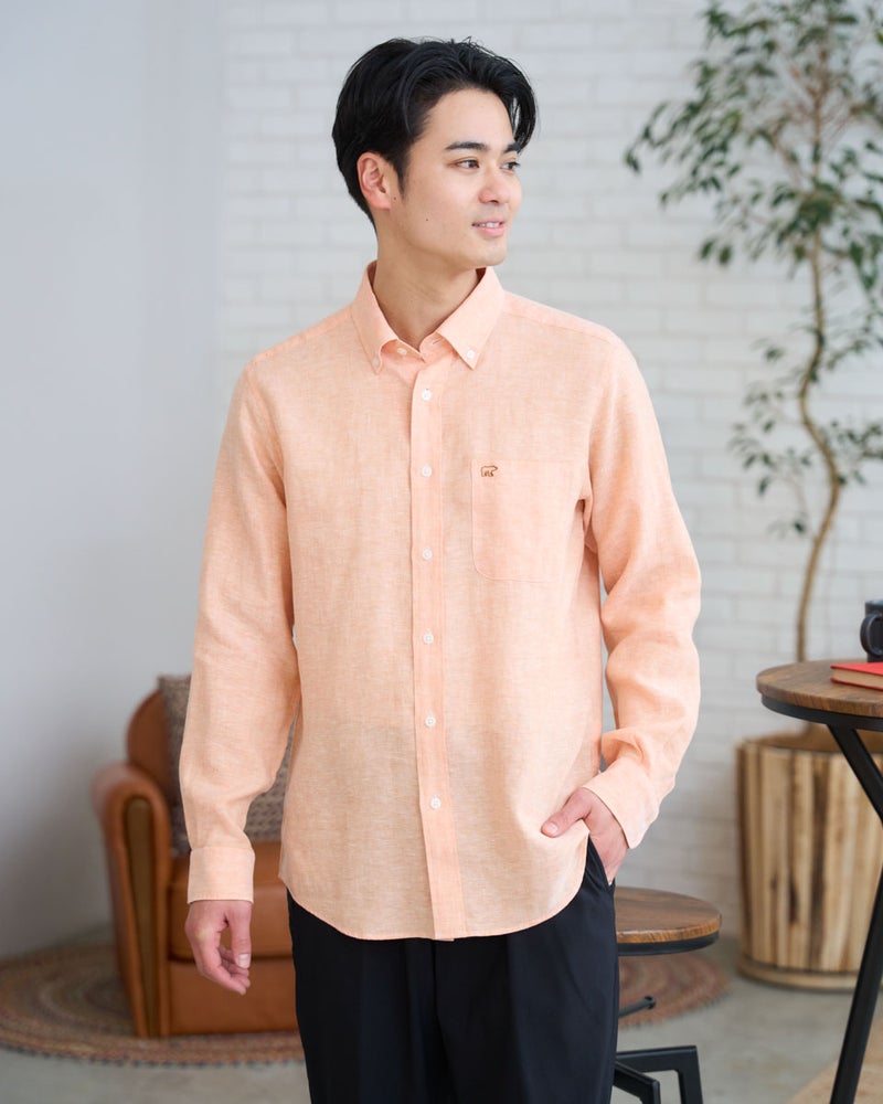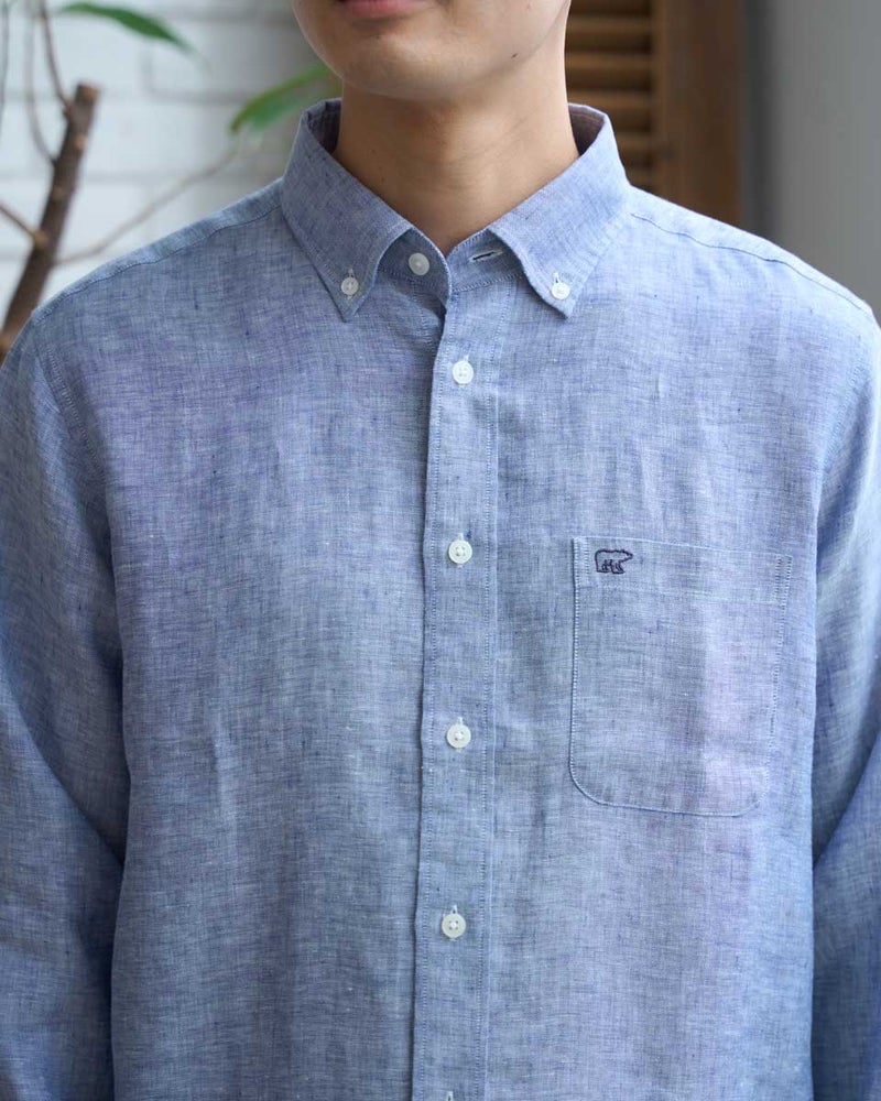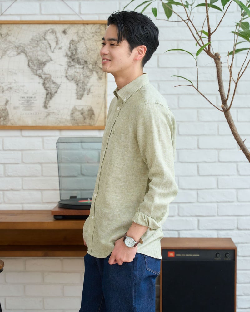シワになりにくいフレンチリネン100%を使用したボタンダウン襟シャツです。柔らかな肌触りと通気性に優れているのが特徴です。イージーケア性に優れており、アイロンがけをしなくてもシワを気にすることなく着用いただけます。