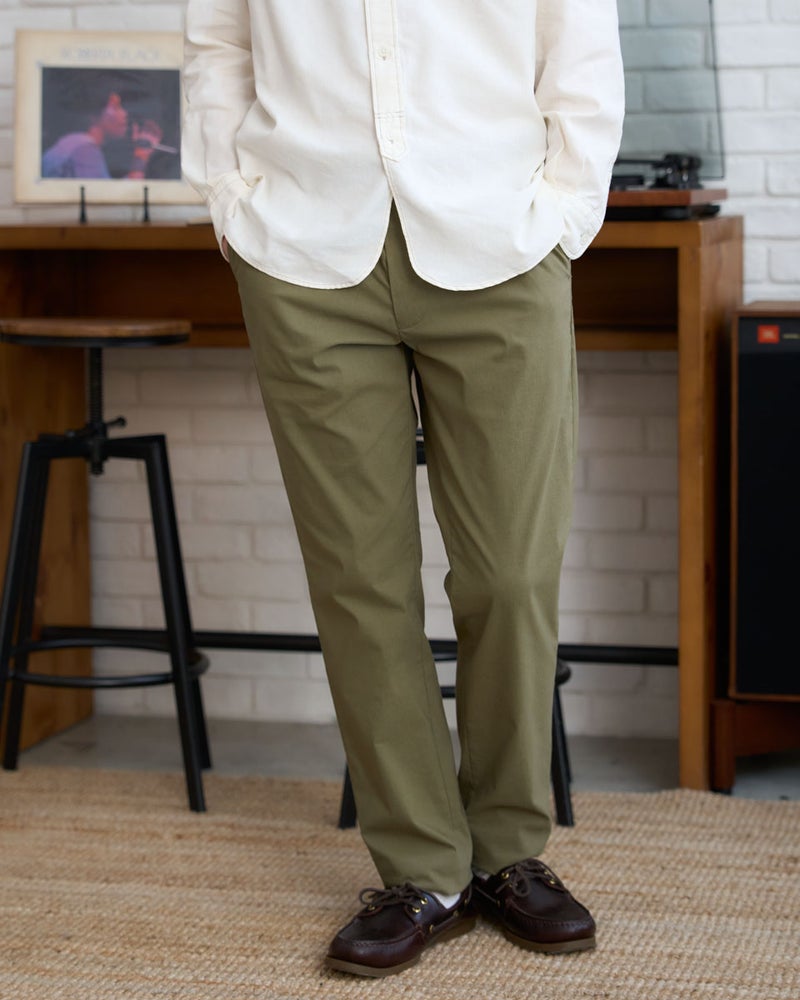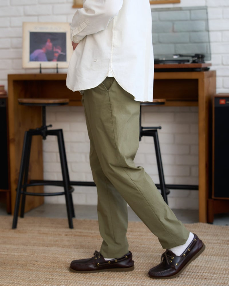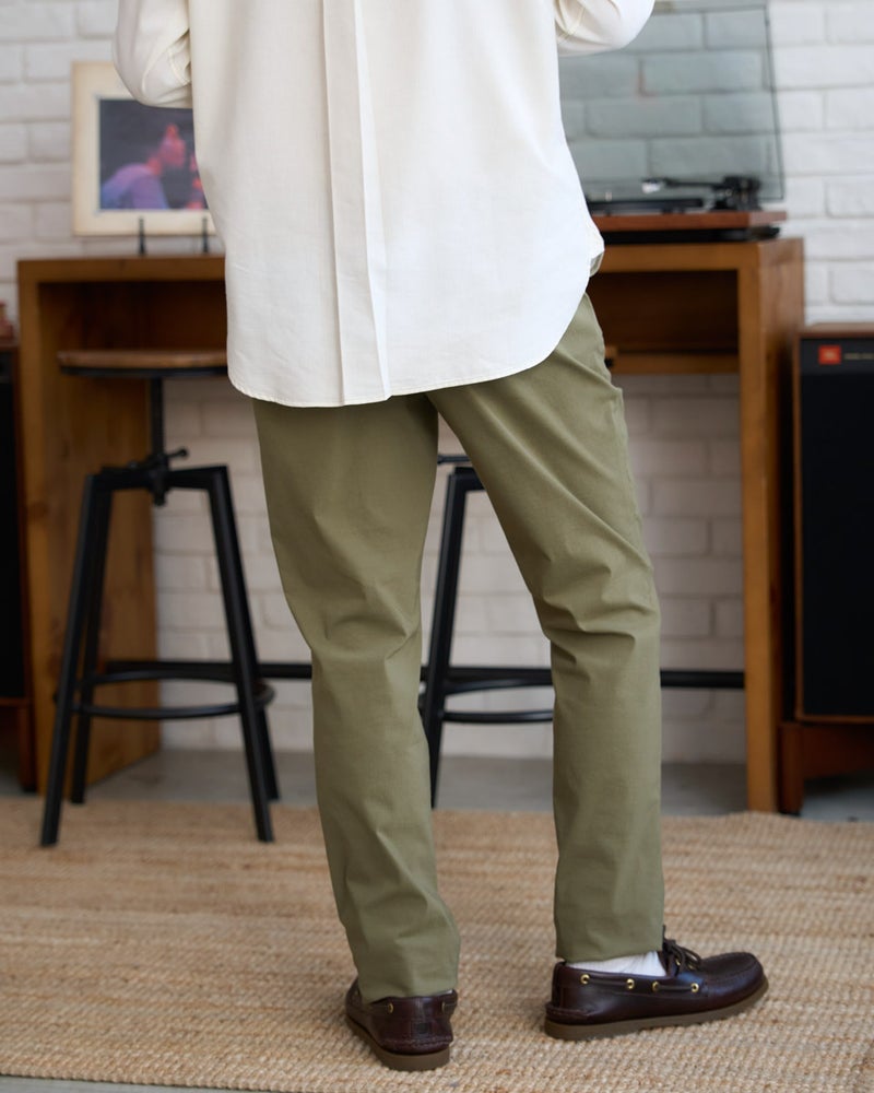 驚くほどの伸縮性を誇るハイパーストレッチ素材に、麻の清涼感をプラスした、夏の大本命パンツです。綿、ナイロン、麻、ポリウレタンを絶妙なバランスで混紡することで、吸水速乾性、接触冷感性、そして麻特有のシャリ感とハリを見事に両立。パームスプリングスの乾いた日差しの中でも、常にさらりとドライで快適な着心地を叶えてくれます。シルエットは、足元をスマートに引き締めるスリムノータックを採用。ブラック、ベージュ、カーキといったカジュアル感のあるカラーバリエーションが、大人の余裕漂うモダンなトラッドスタイルを演出します。非常に動きやすく、かつ品格を保った端正な佇まいは、休日のアクティブなシーンから洗練されたリゾートスタイルまで、幅広い装いをカッコよく格上げしてくれる一着です。