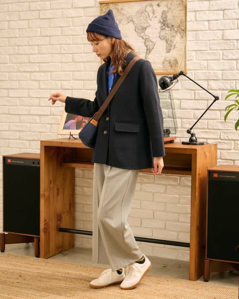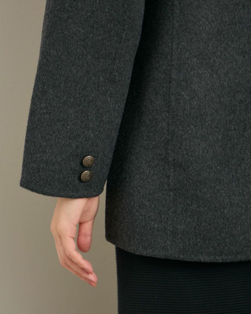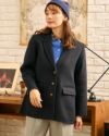 ウール混の二重織素材を使用し、一枚仕立てに仕上げたテーラードジャケットです。(二重織とは:2枚の生地を重ねて1枚に仕上げる織り方の事です。コートやタオル等ふわふわとした素材の物に使われる事が多く、柔らかさと保温性の高さが特徴です)アンティックゴールドの釦がポイントで、同色染をしたベーシックな釦も1セット付けていますので、お好みで釦をアレンジできます。袖のみ滑りが良い様に裏地を付けています。色はトップグレーとネイビーの2色です。